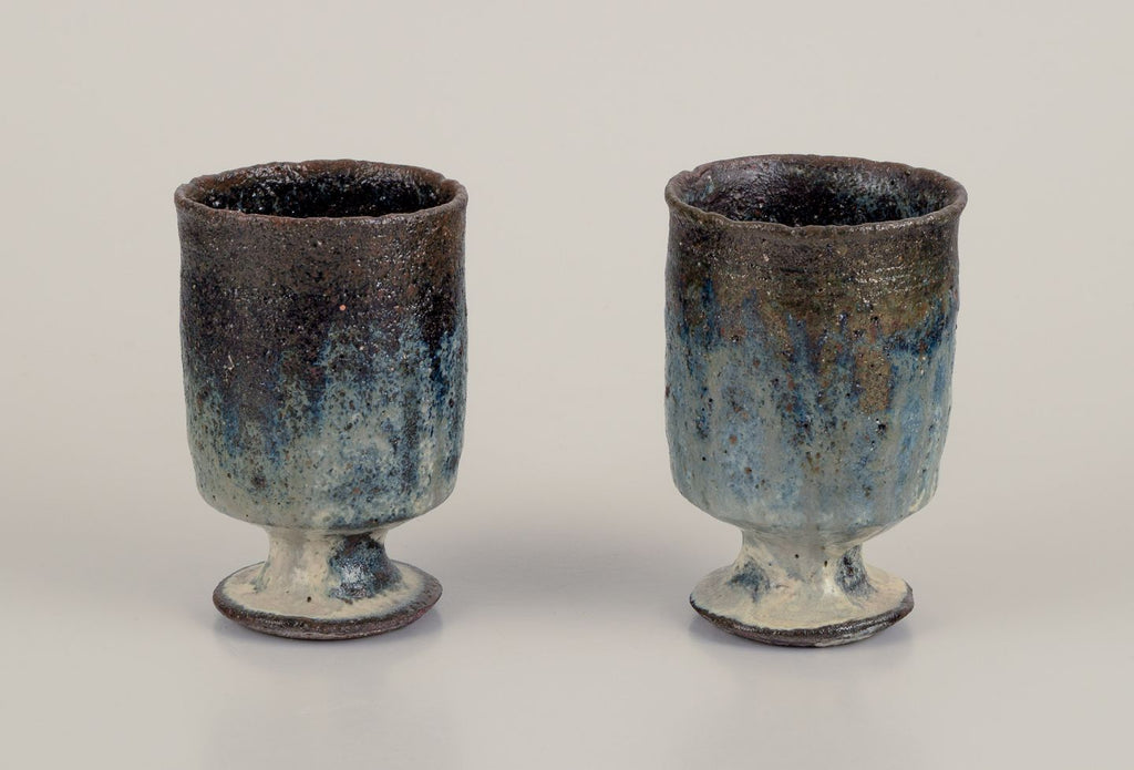 French studio ceramicist. Six pairs of coffee cups with saucers in earthenware. Late 20th C.