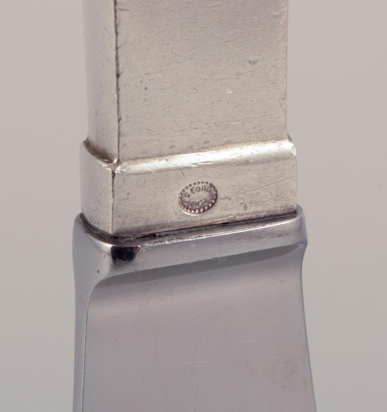 Long-handled dinner knife in sterling silver with stainless steel blade.