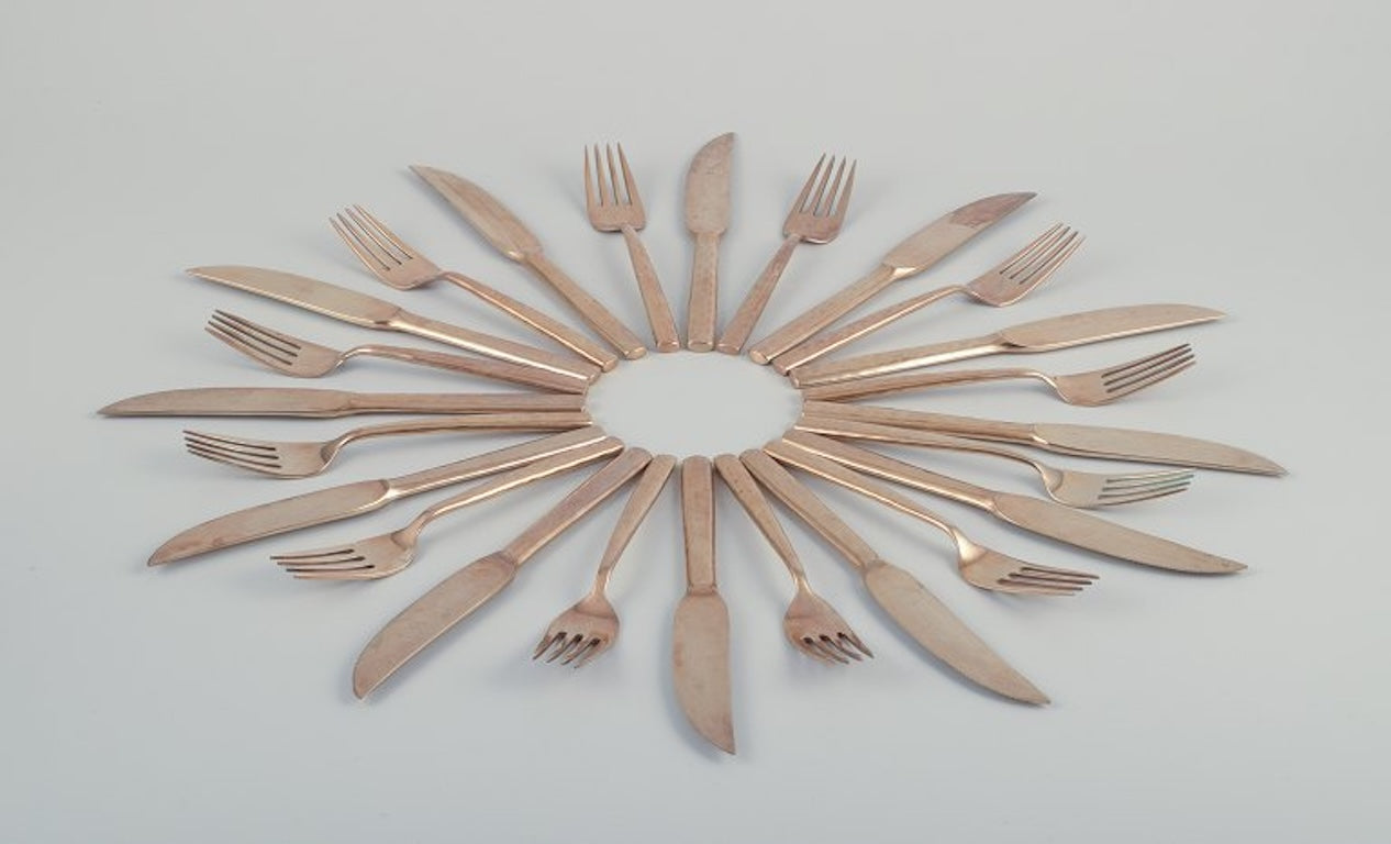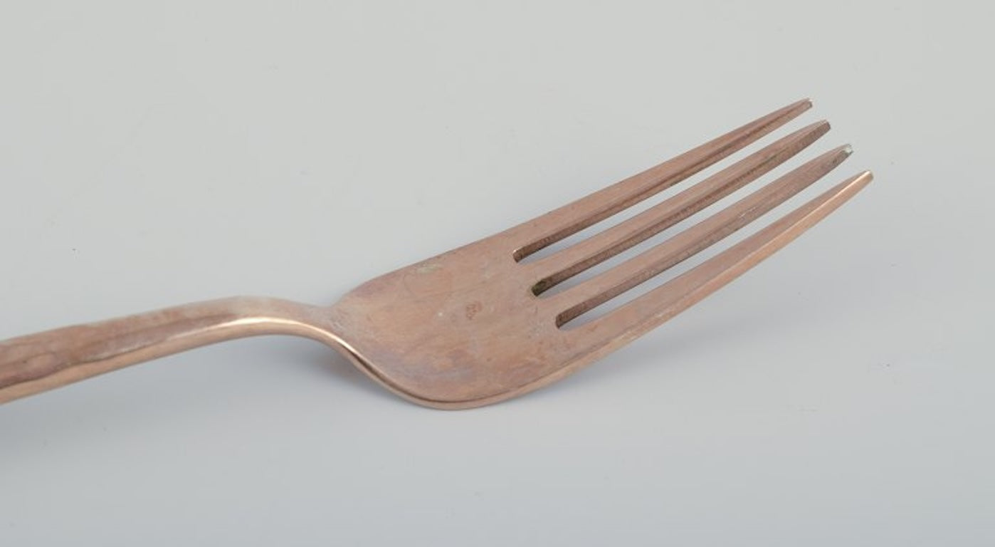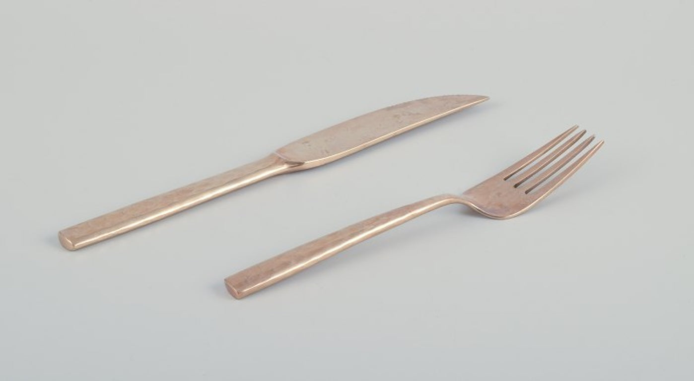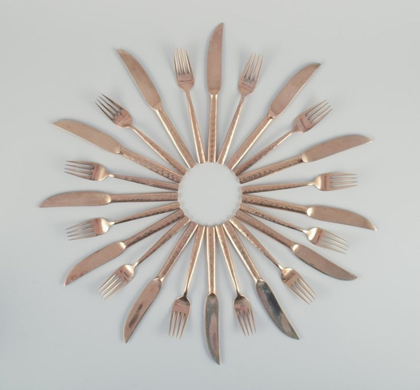 Scandinavian designer. Twelve-person dinner service consisting of twelve dinner knives and twelve dinner forks in handcrafted hammered brass. High-quality craftsmanship. Approximately 1970s.