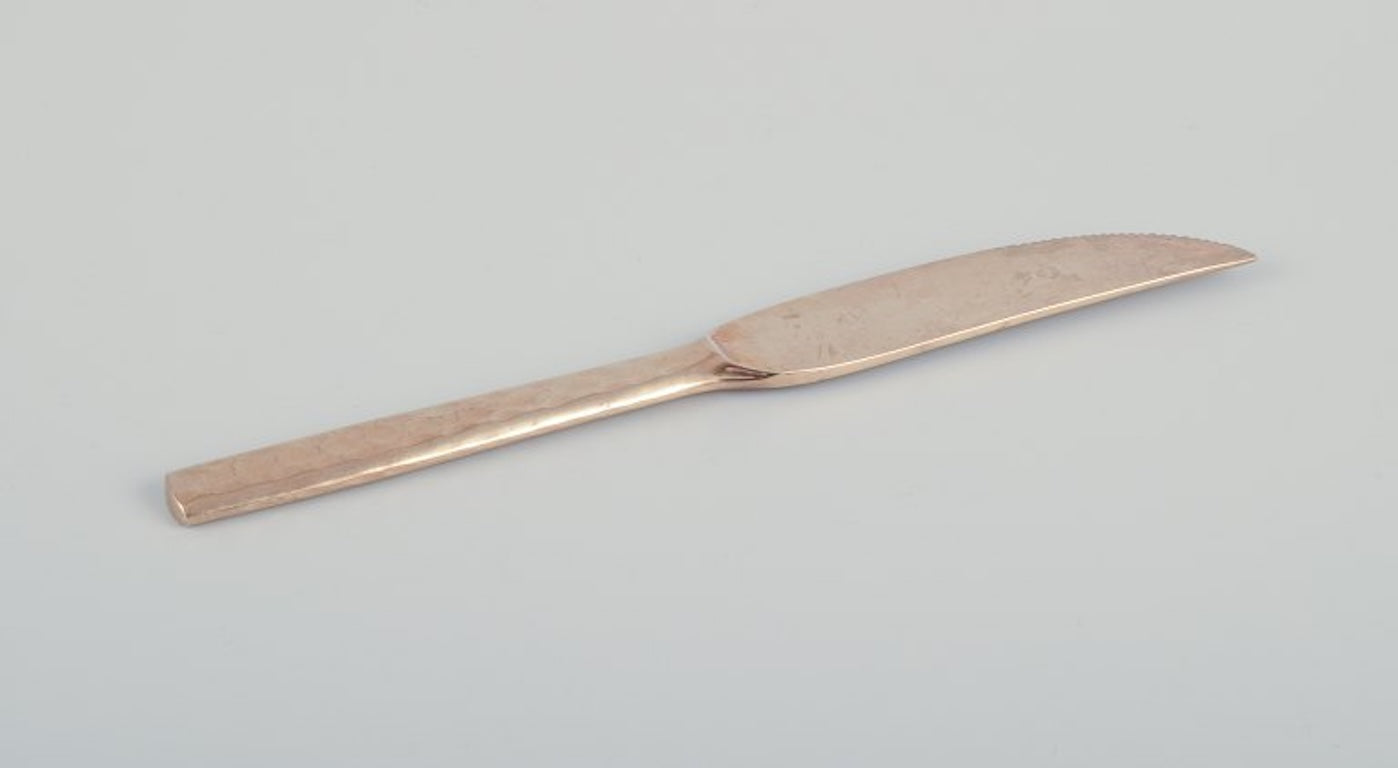 Scandinavian designer. Twelve-person dinner service consisting of twelve dinner knives and twelve dinner forks in handcrafted hammered brass. High-quality craftsmanship.