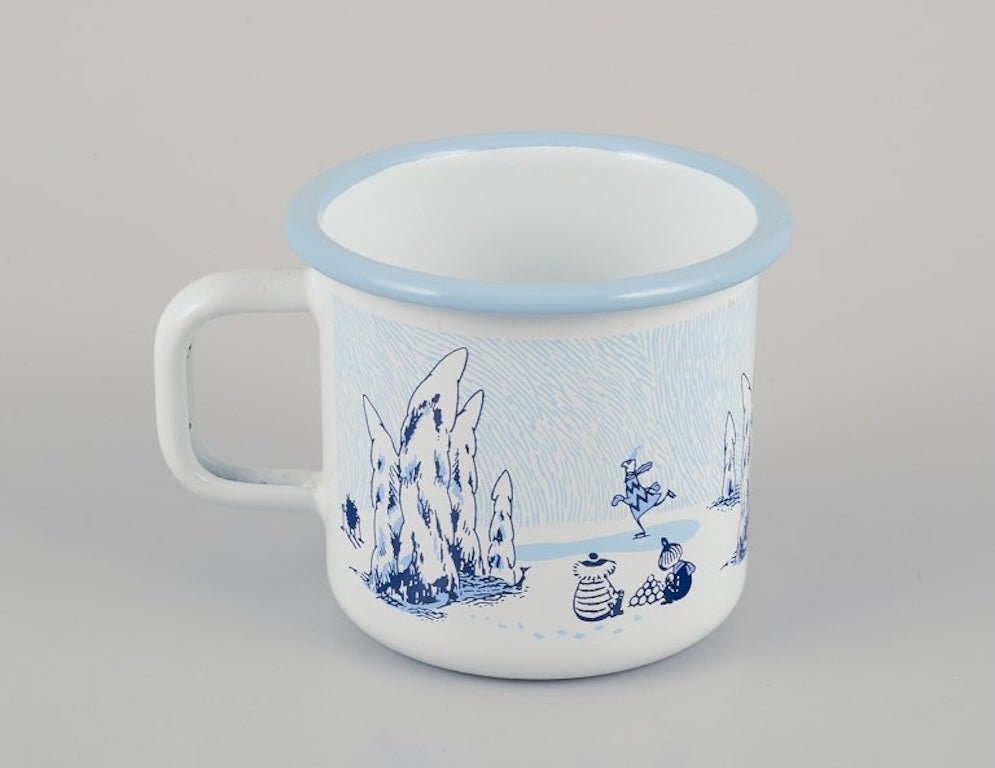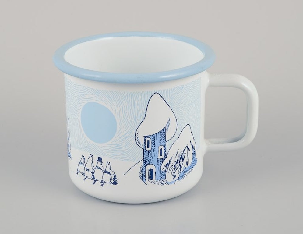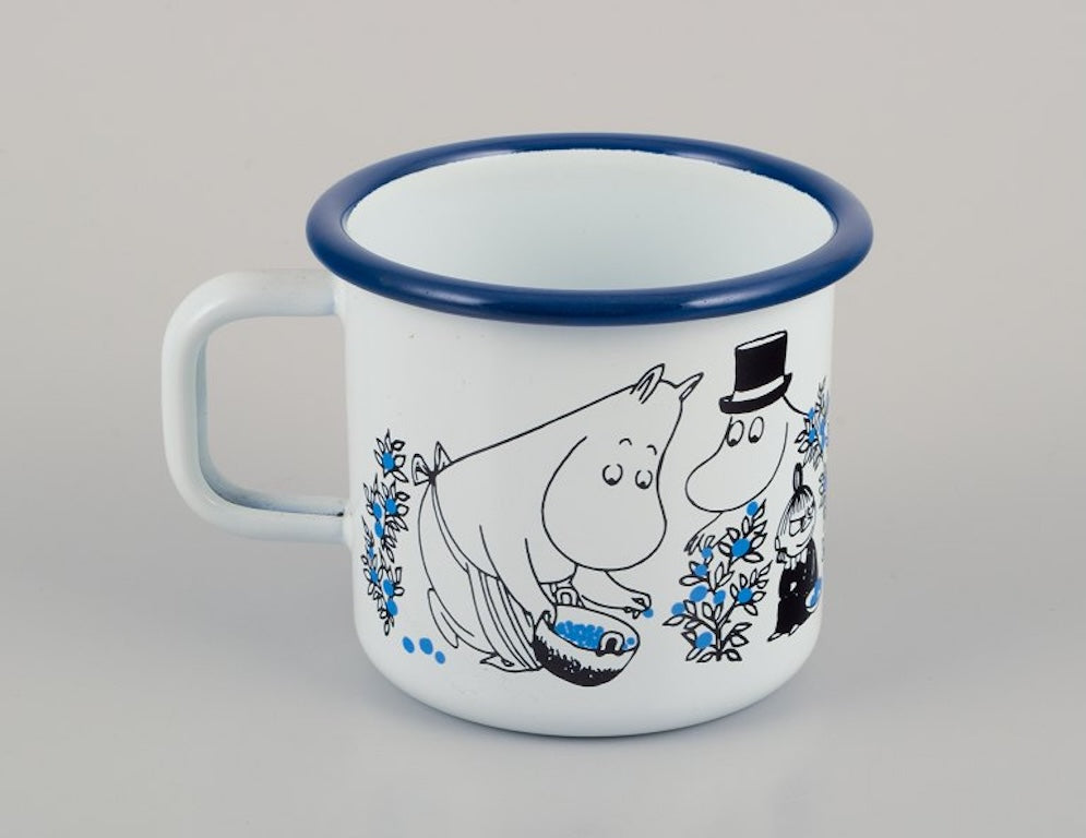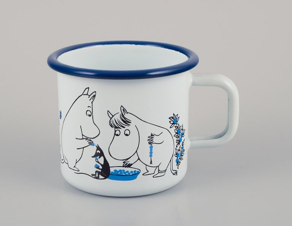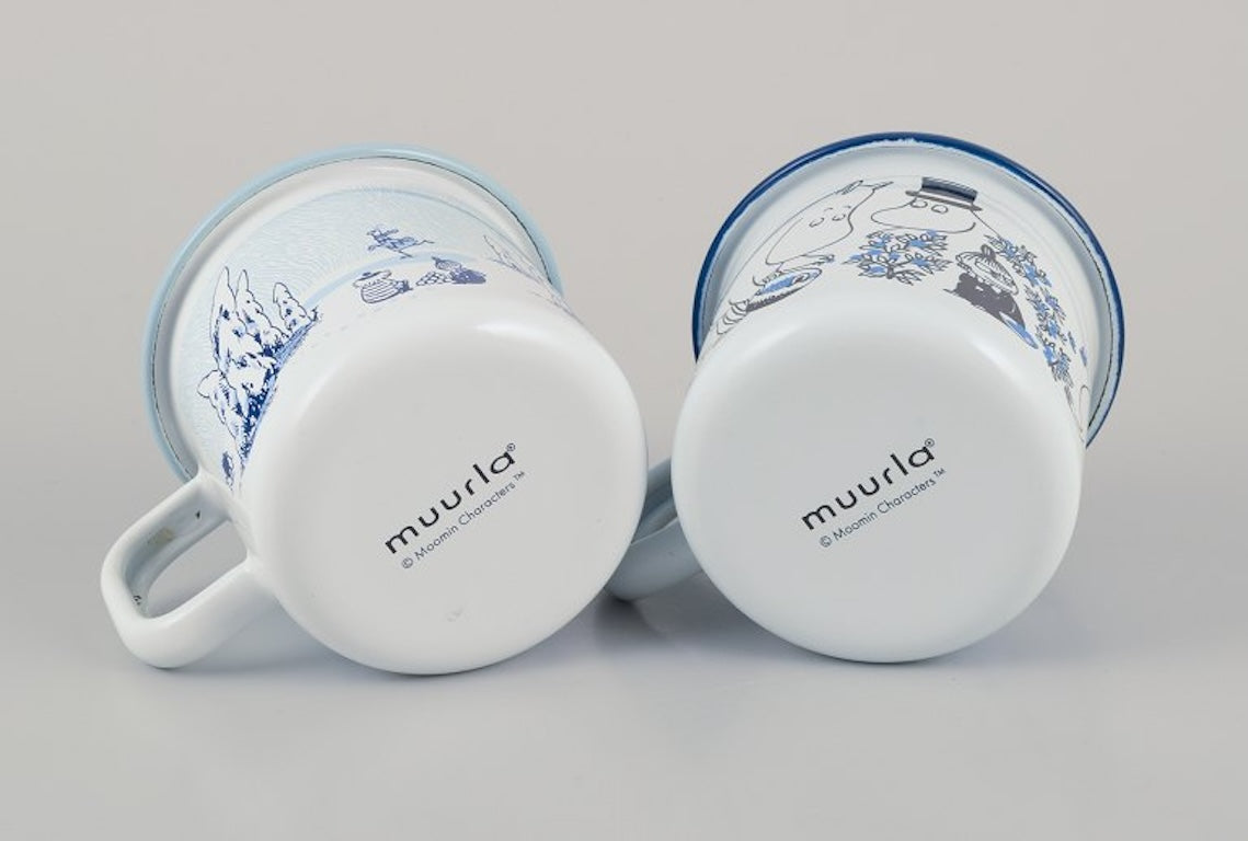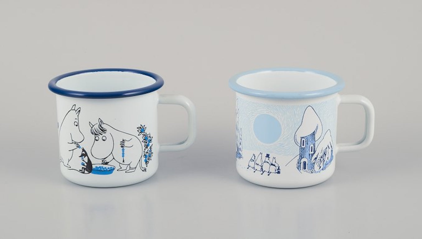 Muurla, Finland. Two enamel mugs with handles. Featuring illustrations of Moomins. 21st century.