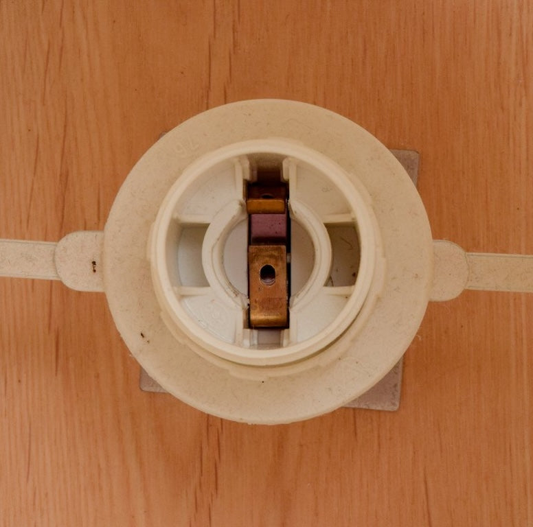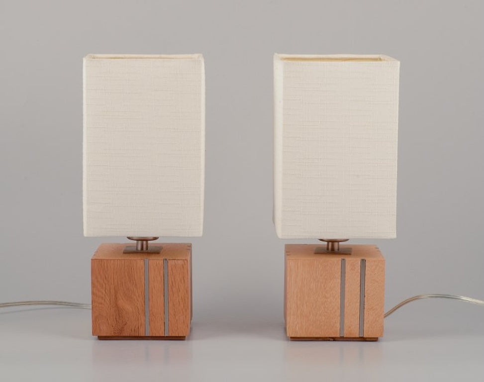 A pair of table lamps in light wood inlaid with steel, textile shade.