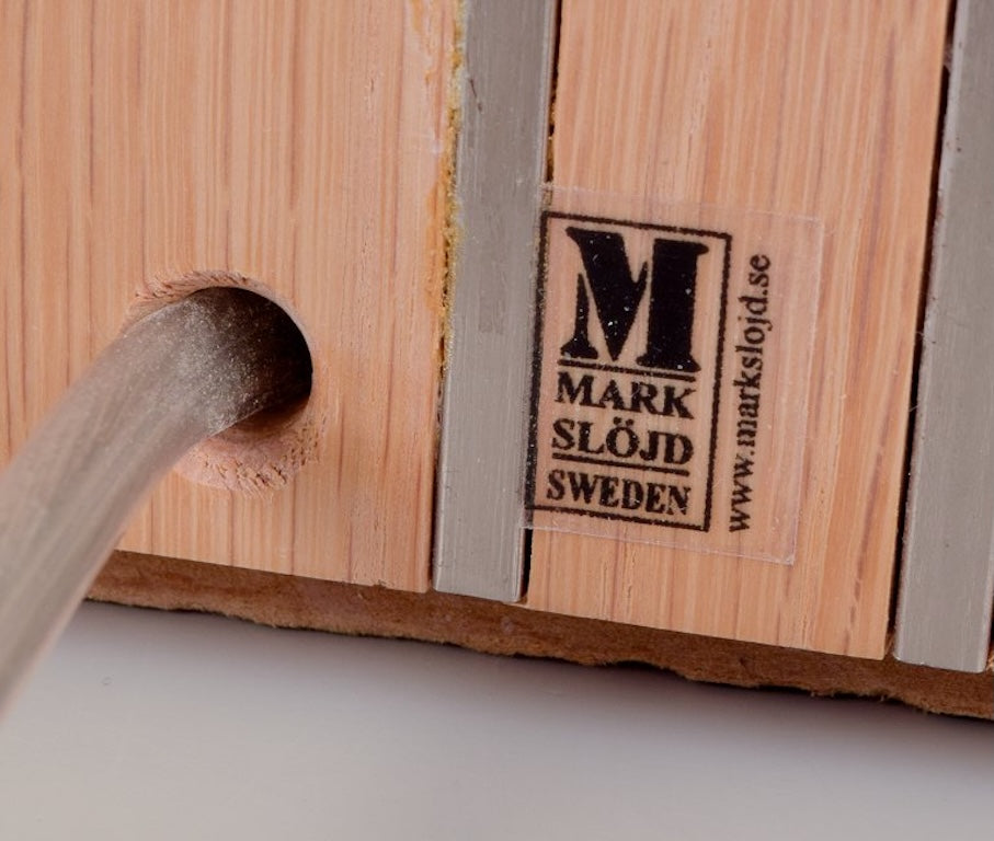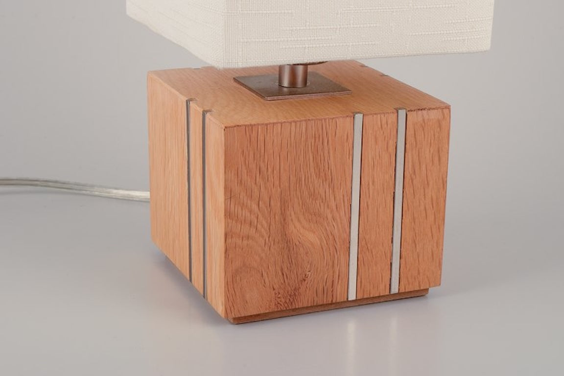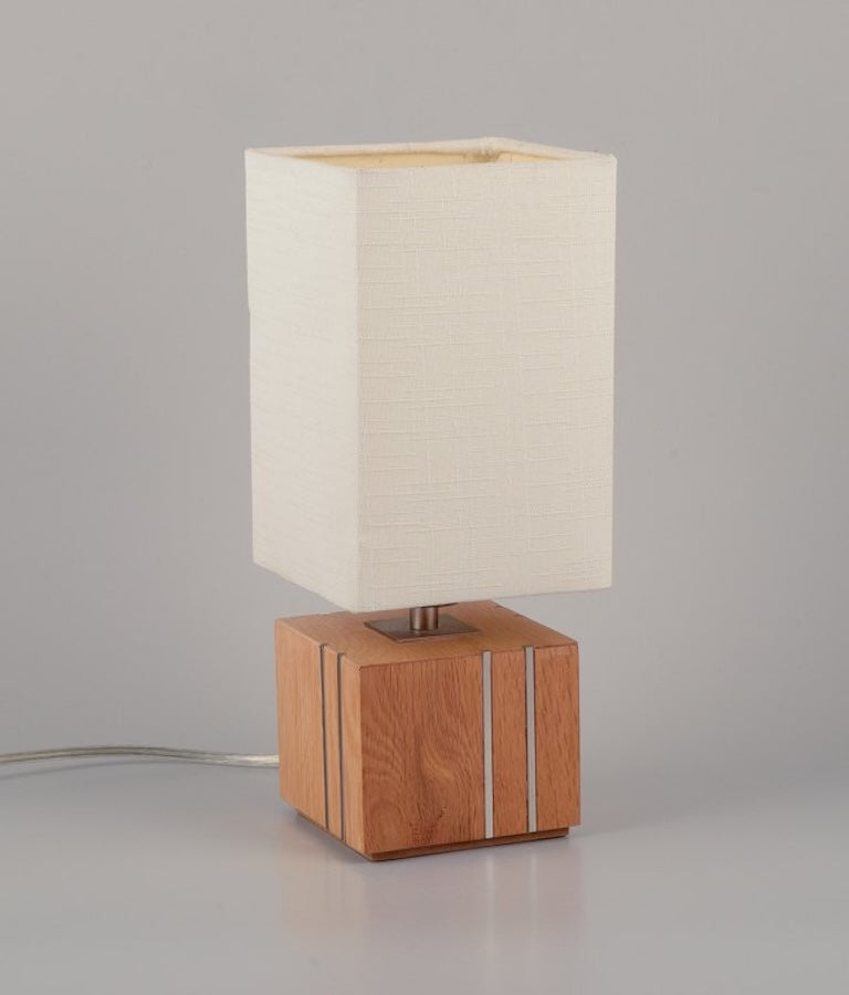 Markslöjd, Sweden. A pair of table lamps in light wood inlaid with steel, textile shade. Late 20th century.