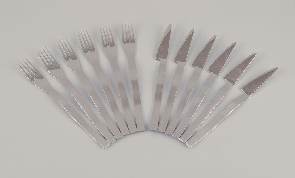 Gense, Sweden. Fish cutlery for six people: six knives and six forks. Stainless steel. Late 20th C. (Copy)