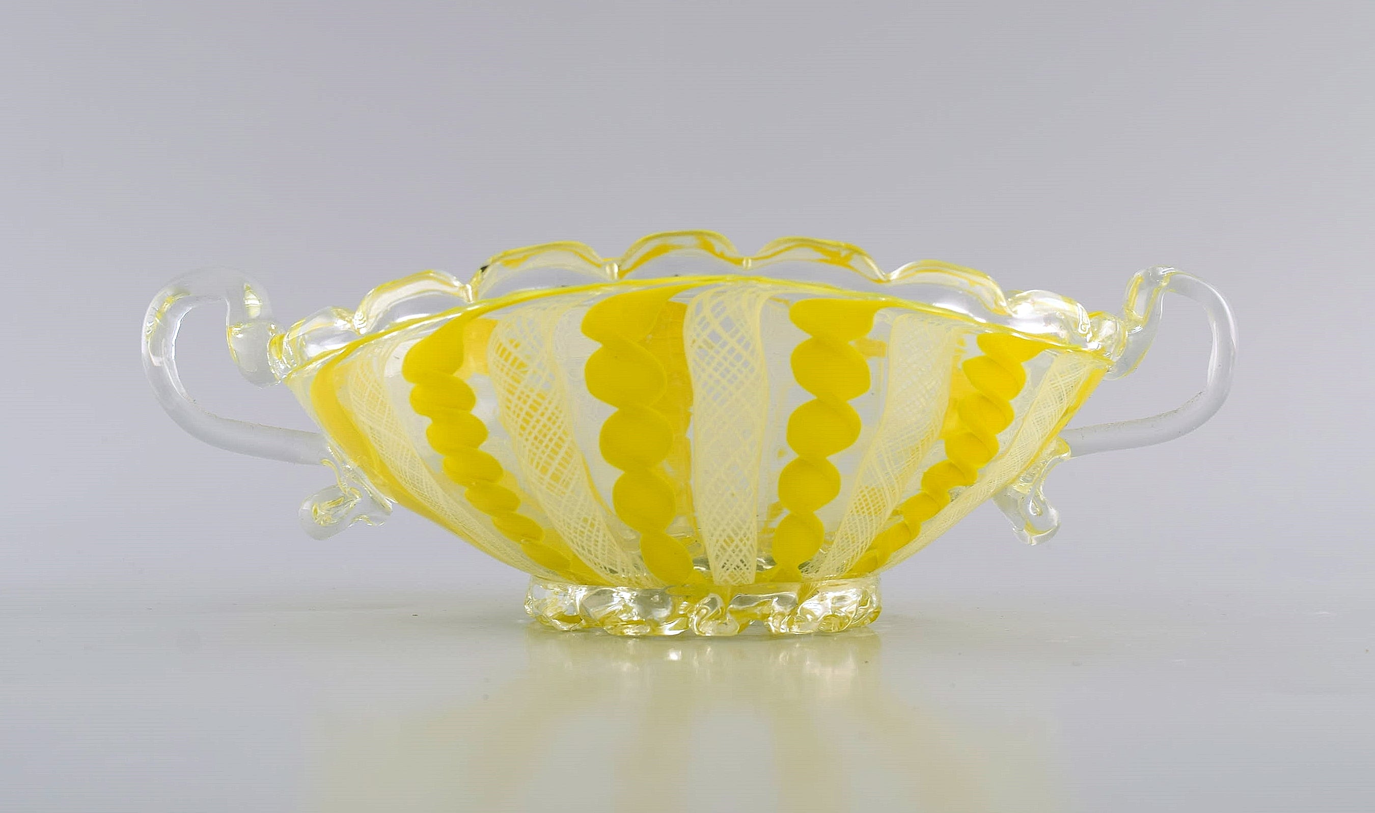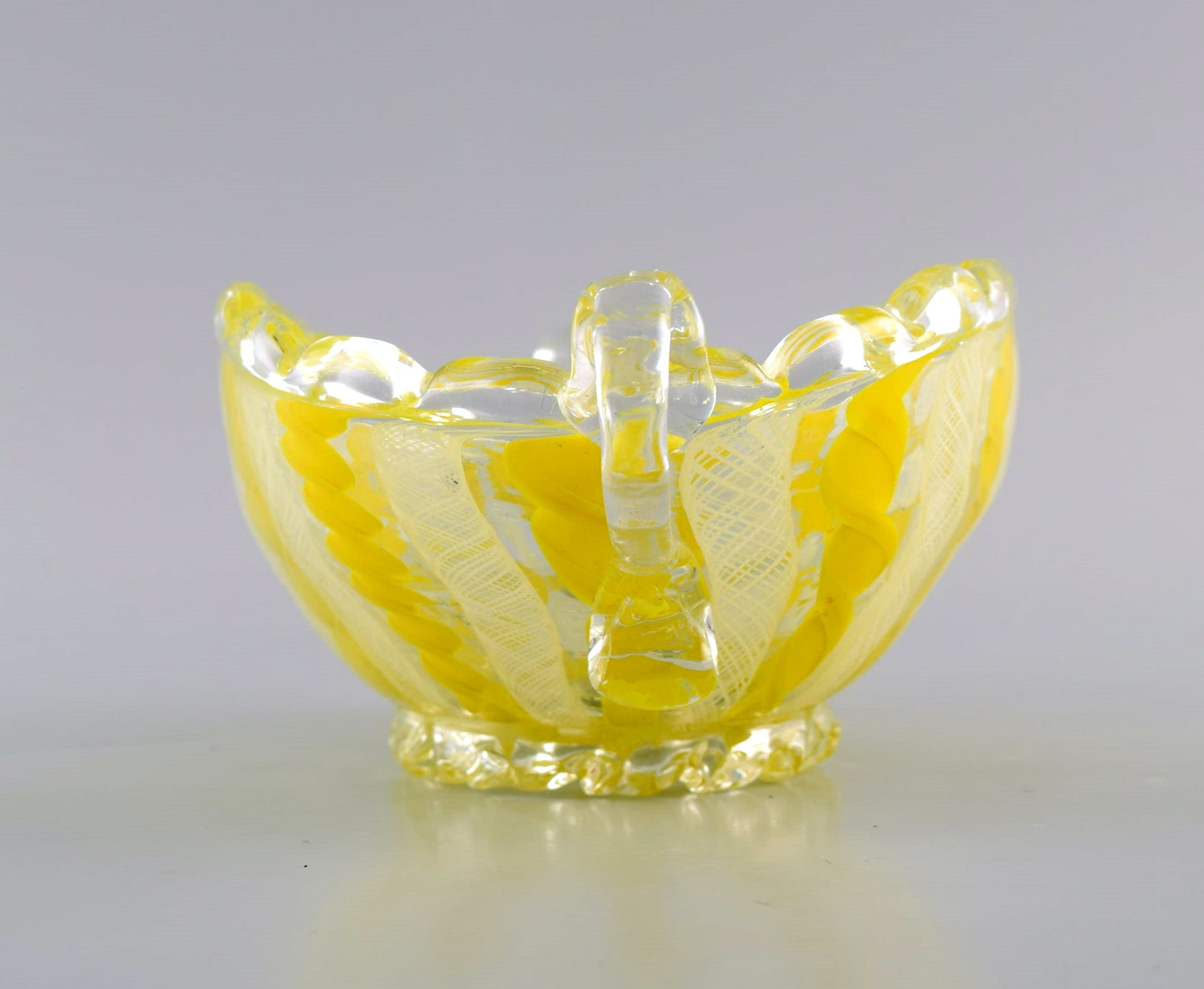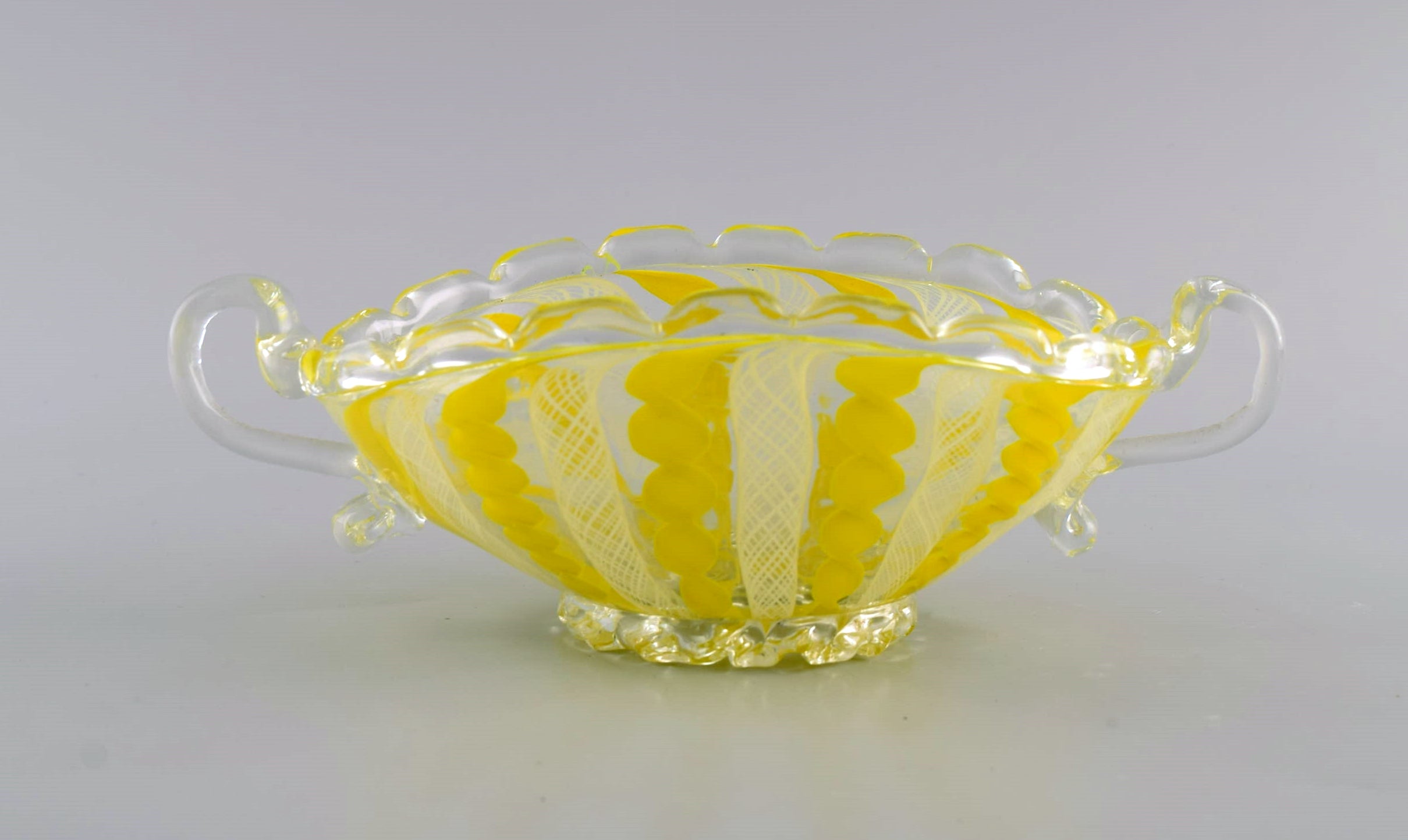Murano bowl with handles in mouth-blown art glass. Wavy and checkered design in shades of yellow and white. 1960s.