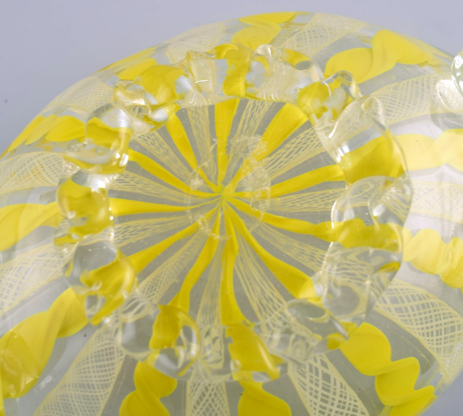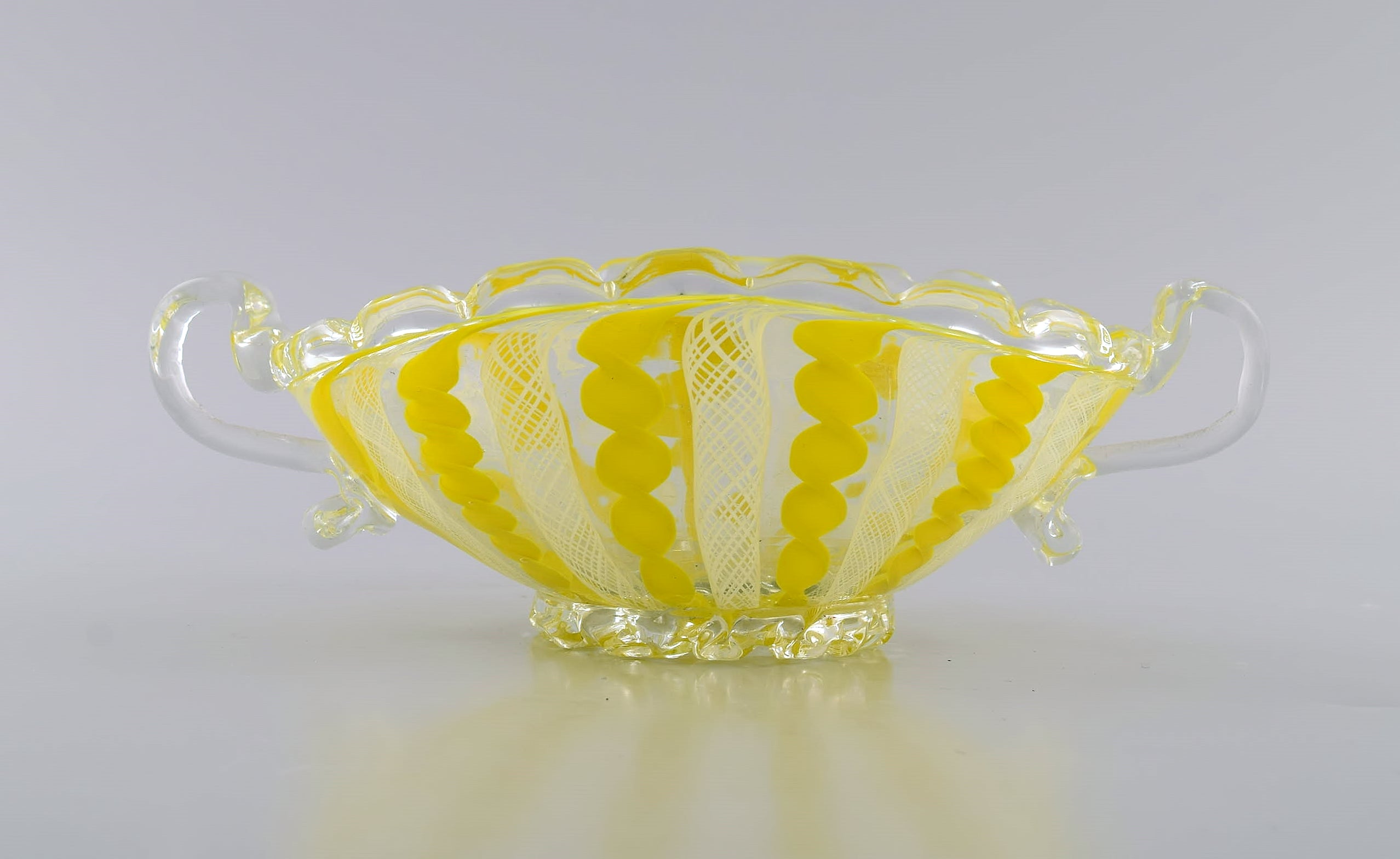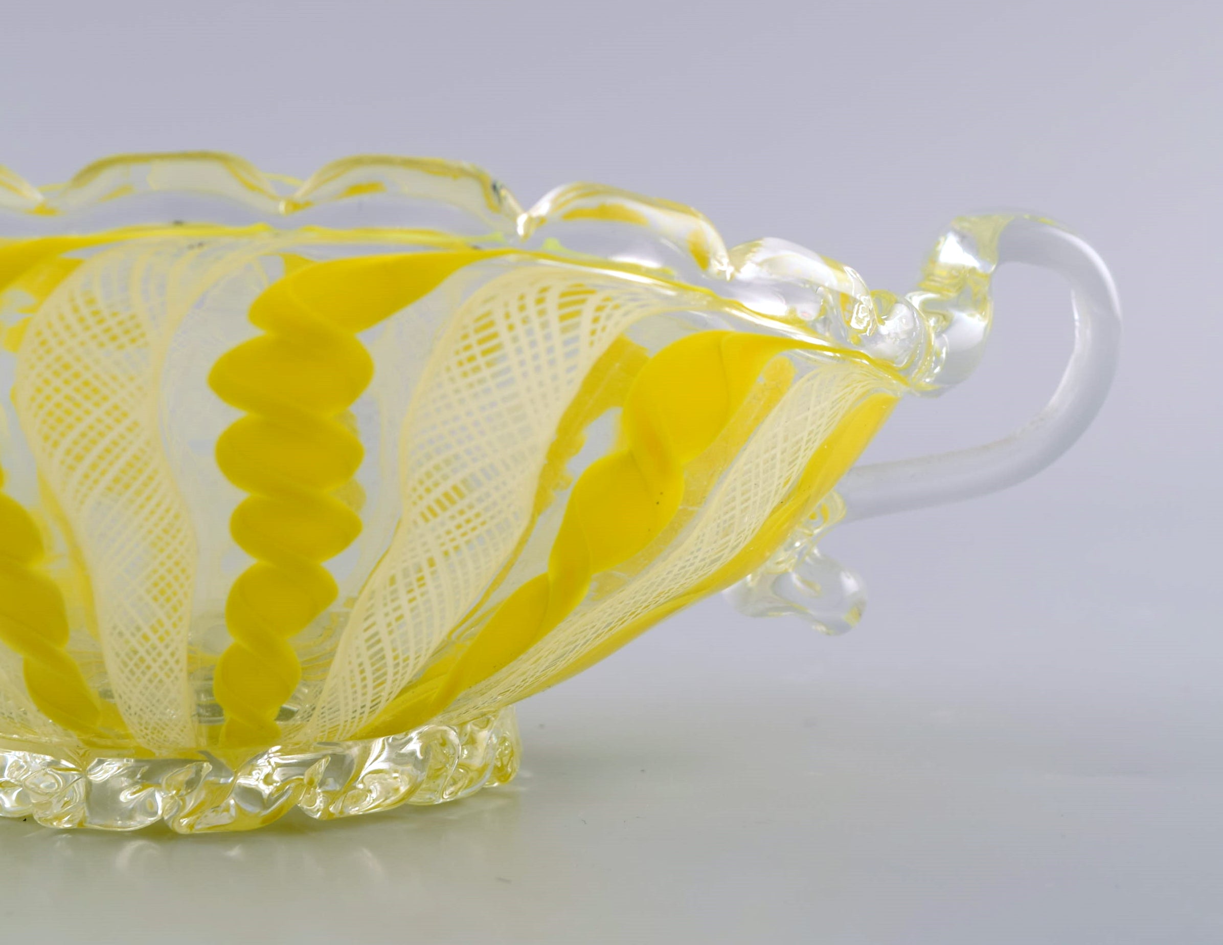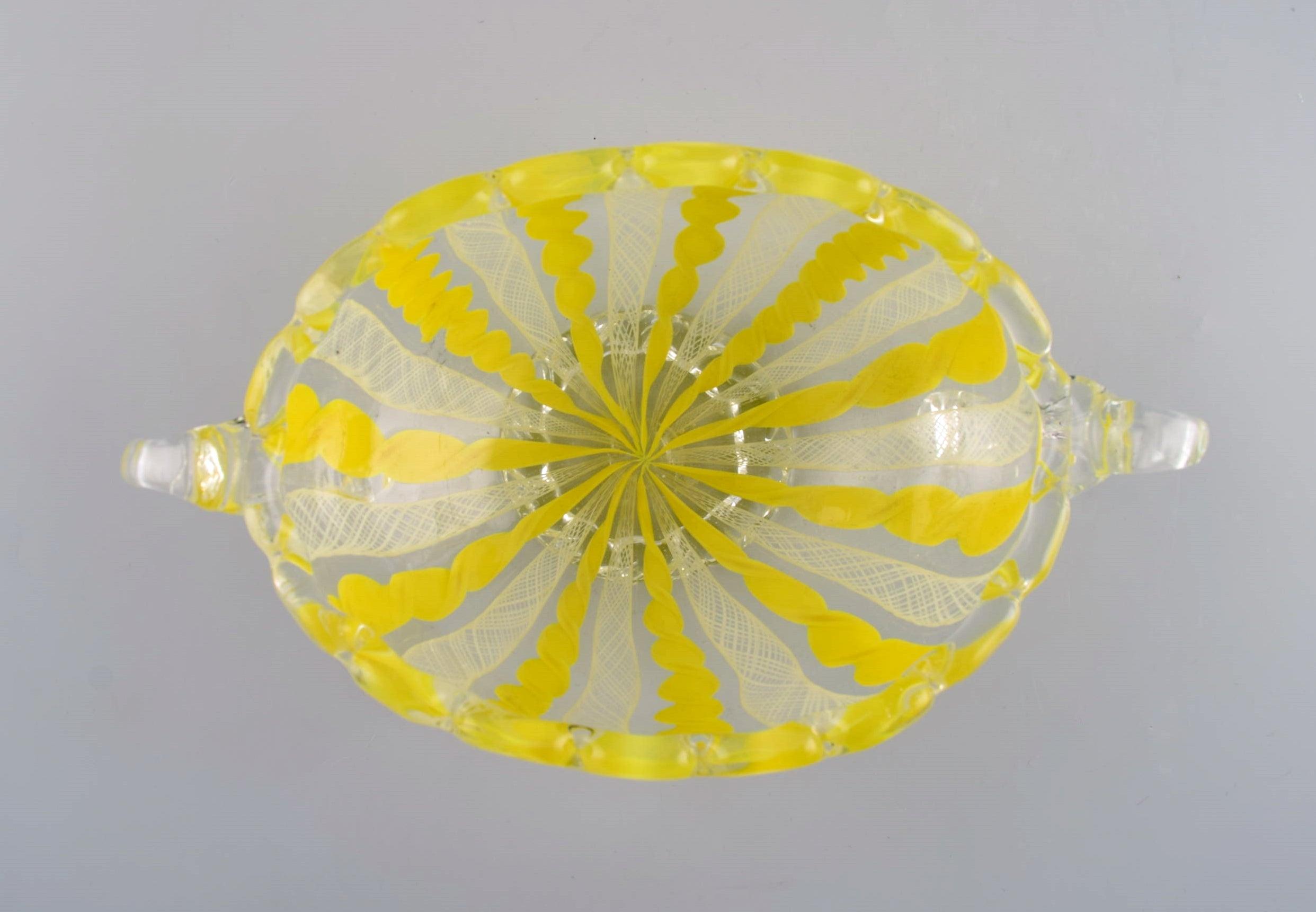 Murano bowl with handles in mouth-blown art glass. Wavy and checkered design in shades of yellow and white. 1960s.
