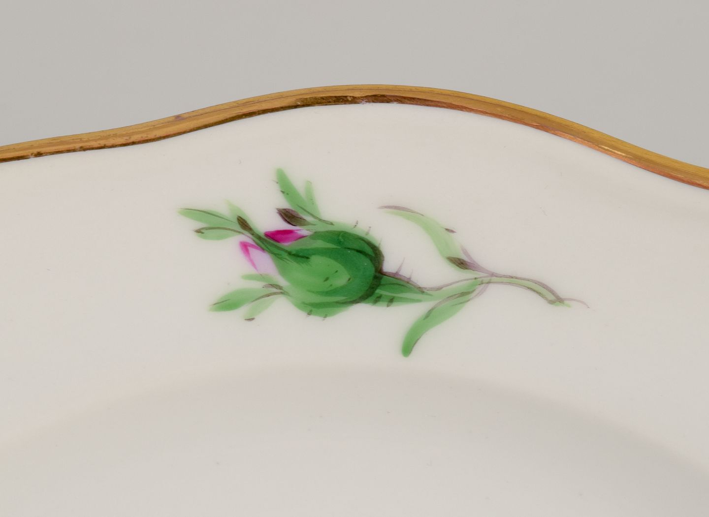 Hand-painted with pink rose, gold rim.