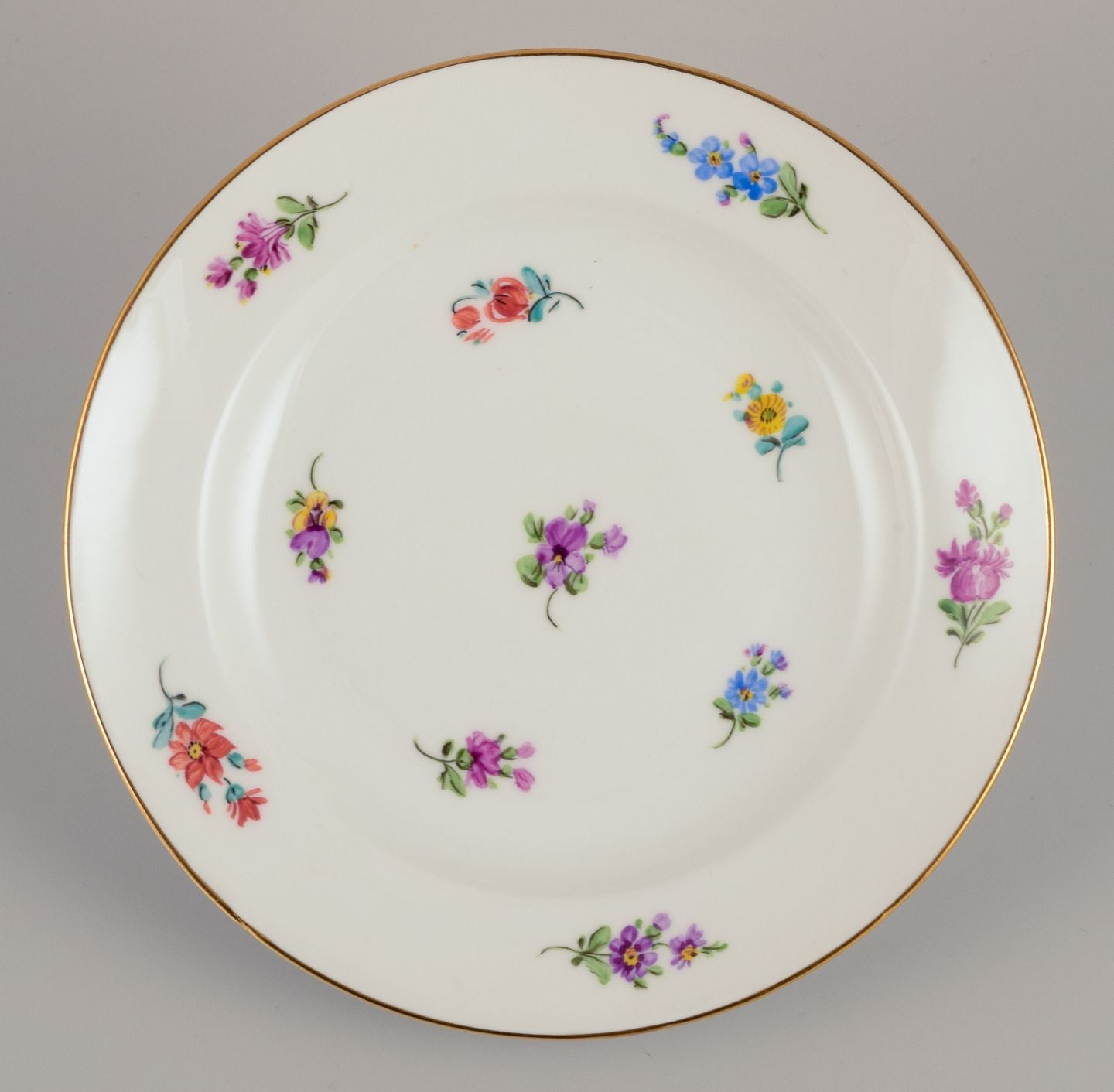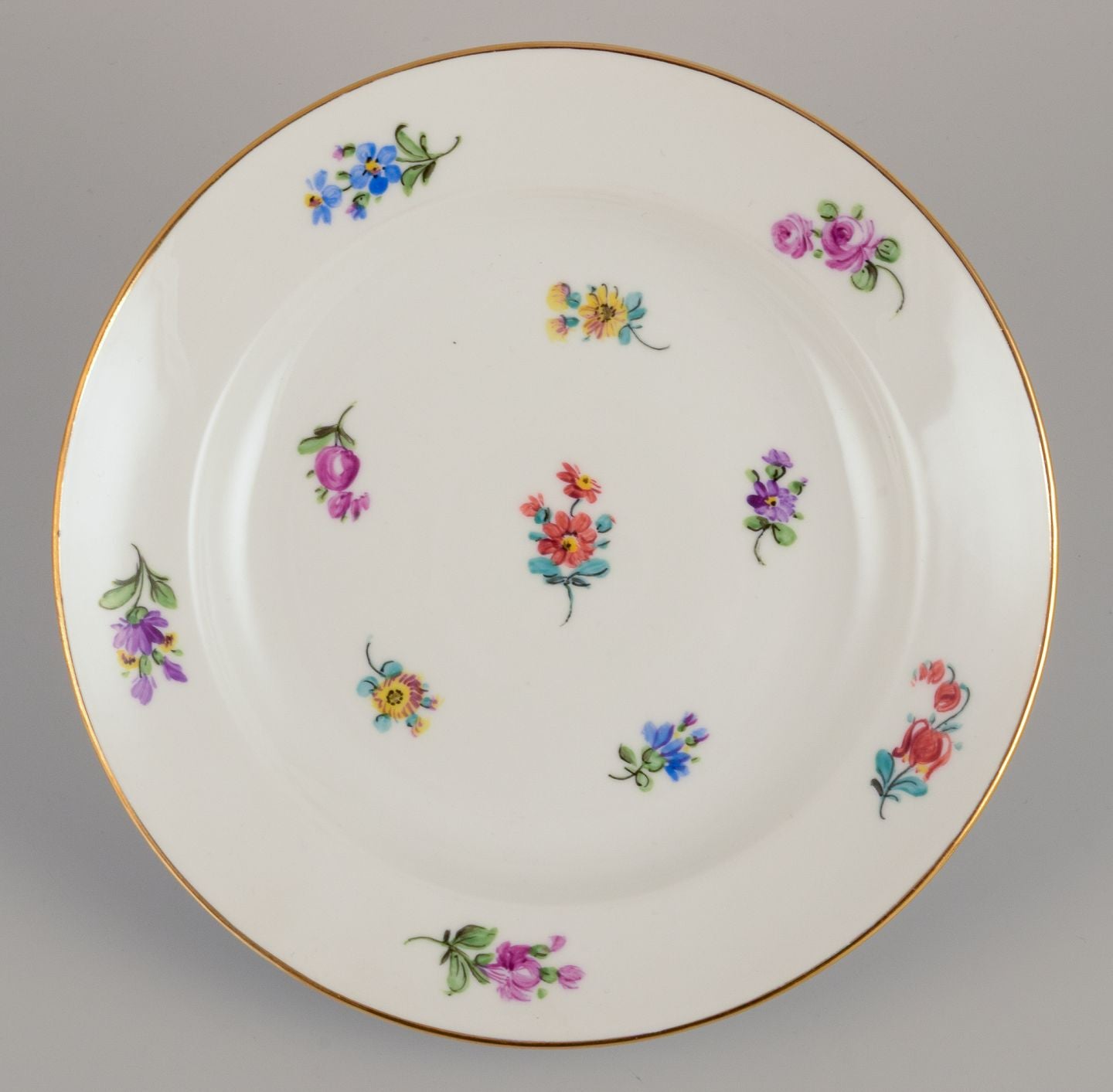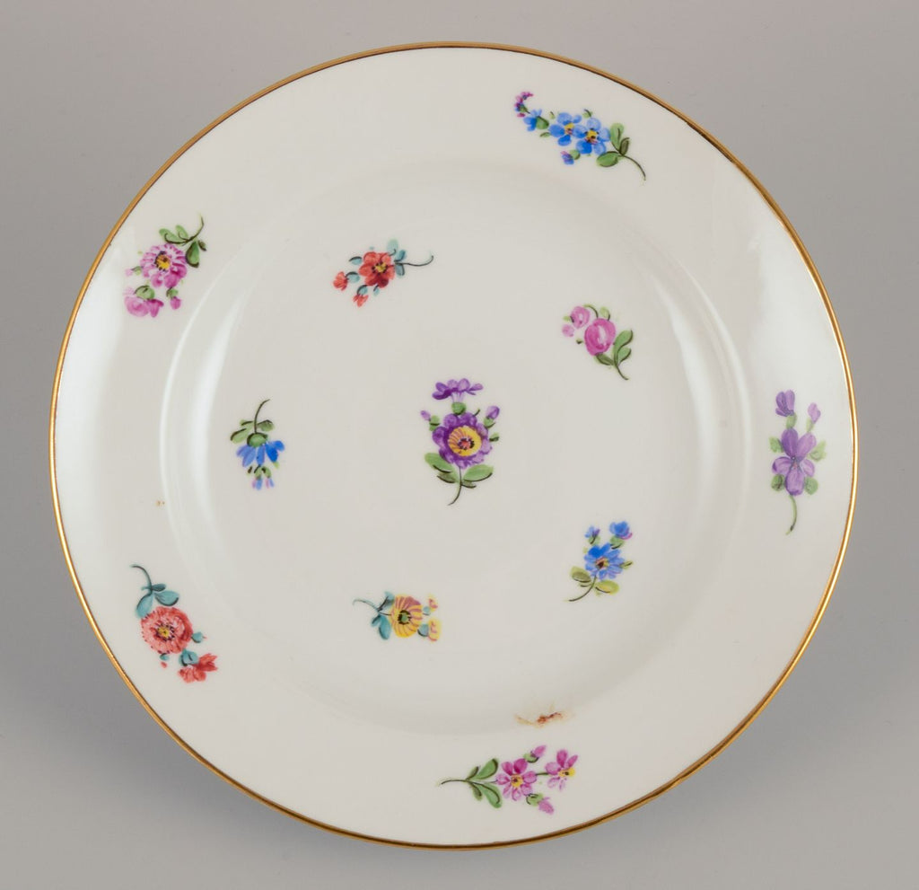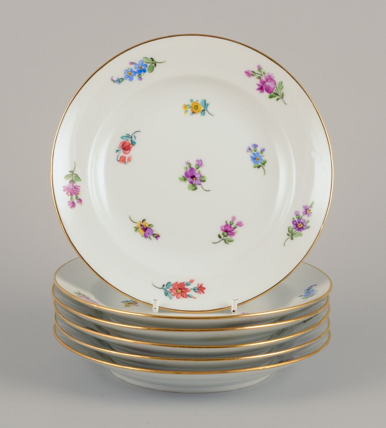 Meissen, Germany. Six porcelain plates with polychrome flower motifs, gold rim. Ca. 1920