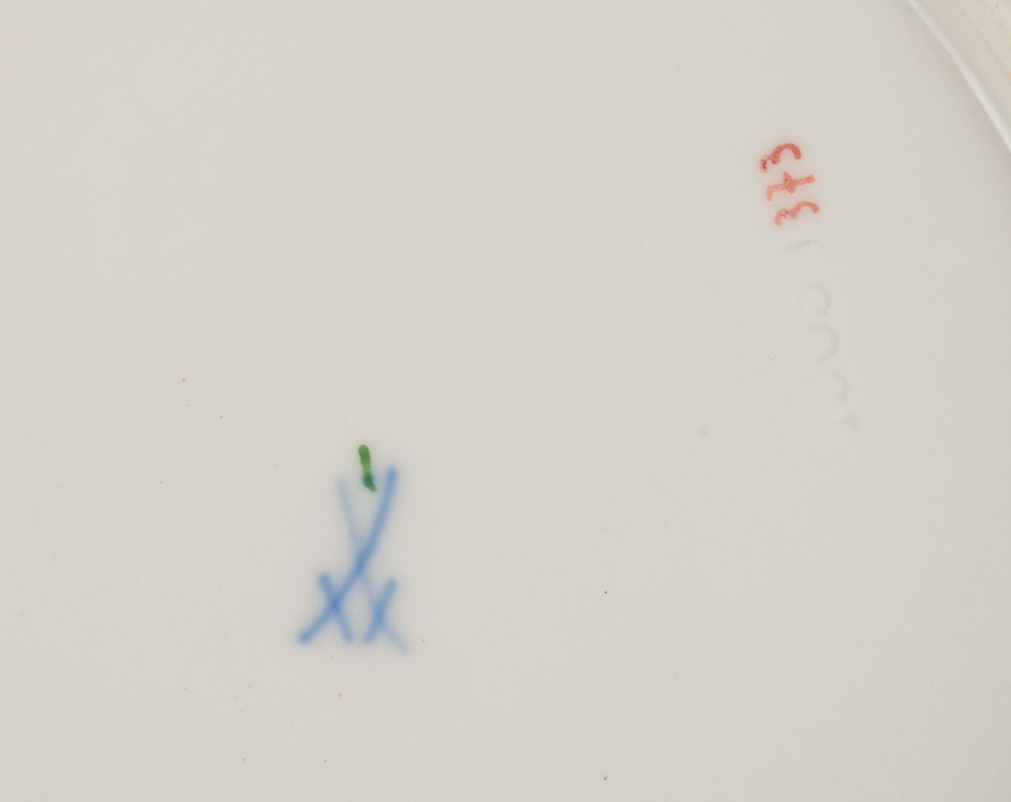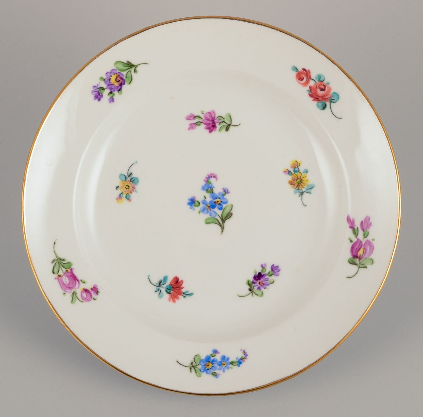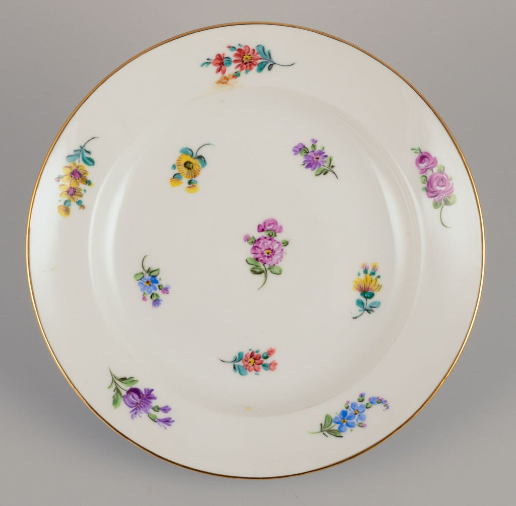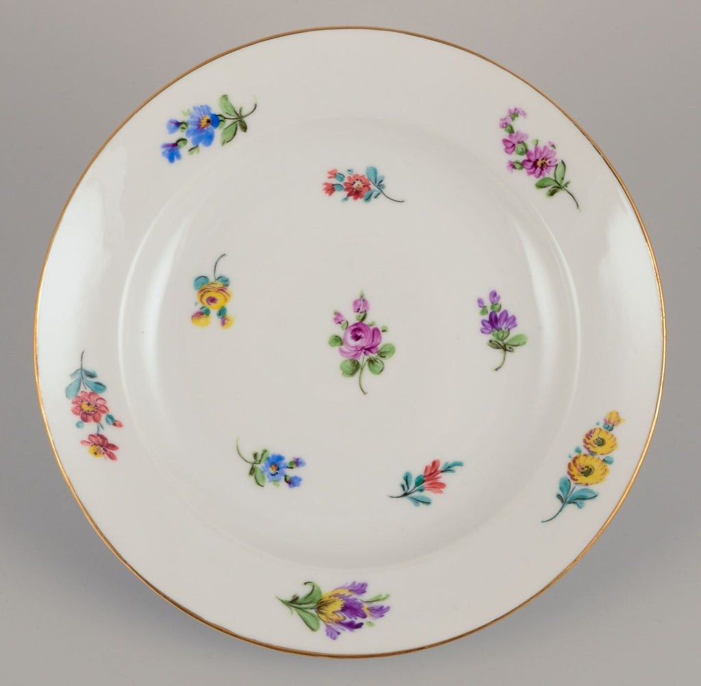 Meissen, Germany. Six porcelain plates with polychrome flower motifs, gold rim. Ca. 1920