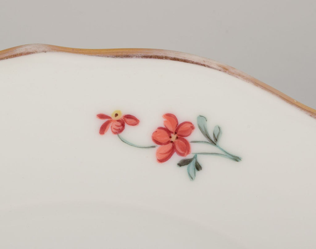 Hand-painted with floral motifs in polychrome colors, gold rim.