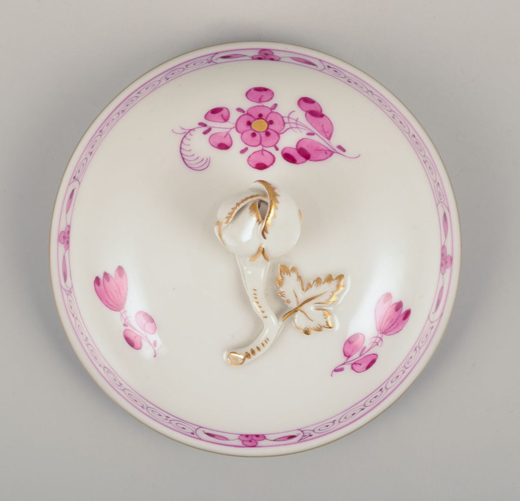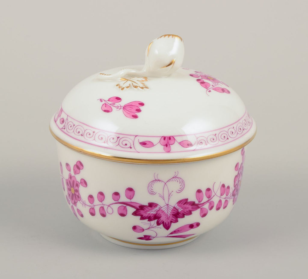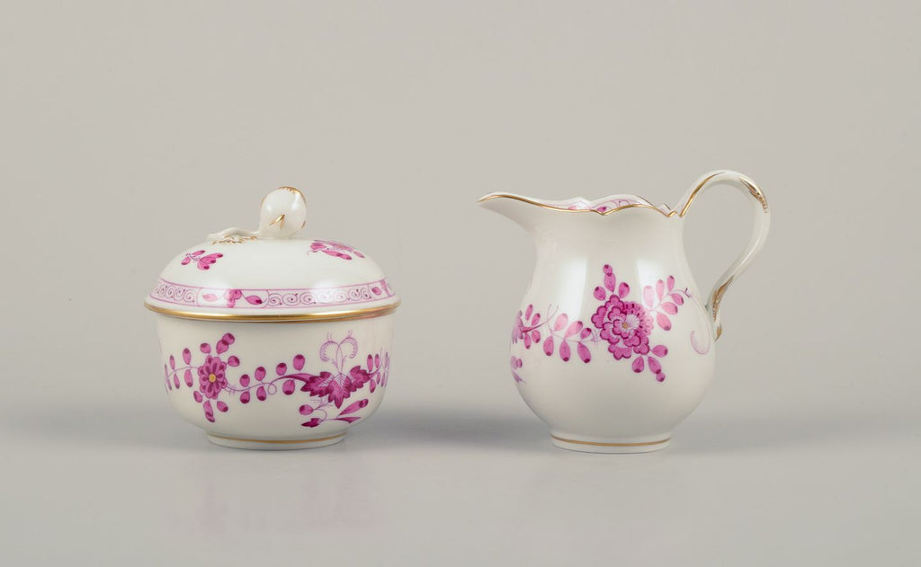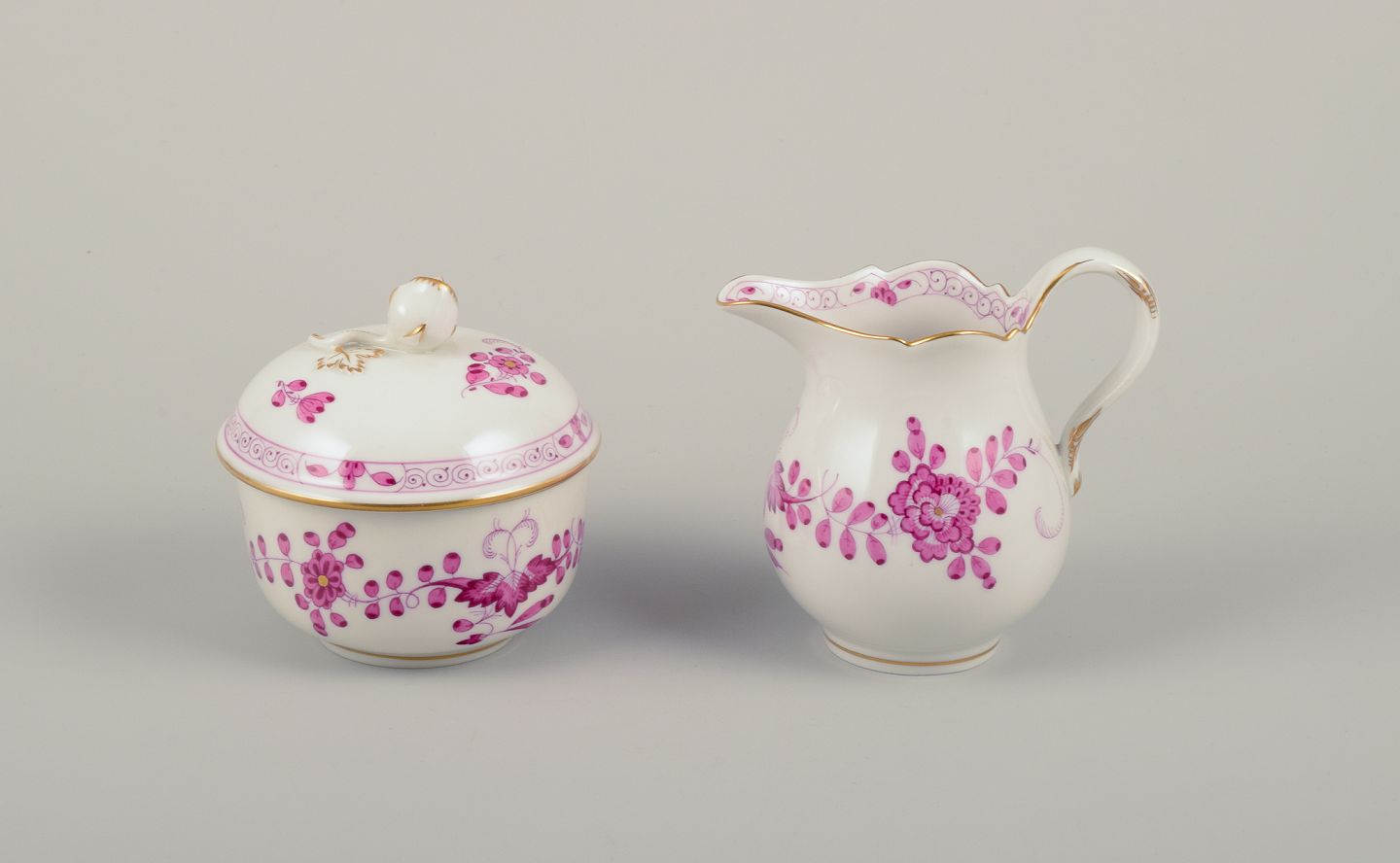 Meissen, Germany. "Pink Indian" porcelain creamer and sugar bowl with purple floral motifs, gold rim. Mid-20th C.