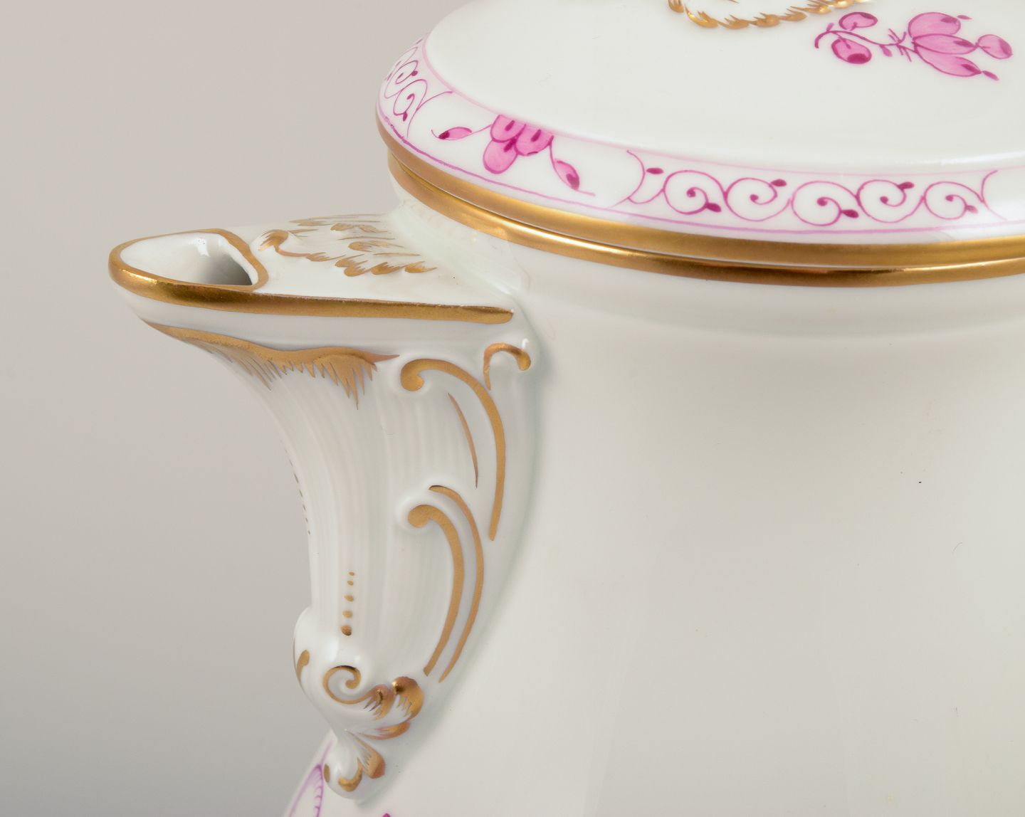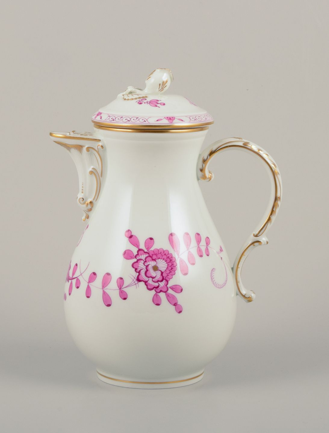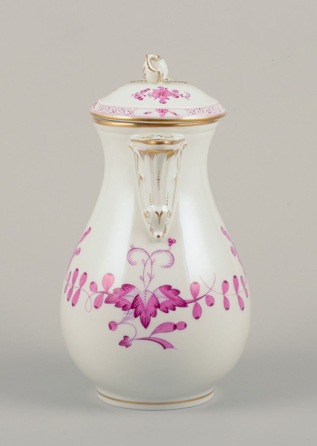 Meissen, Germany. "Pink Indian" porcelain coffee pot with purple floral motifs, gold rim. Mid-20th C.