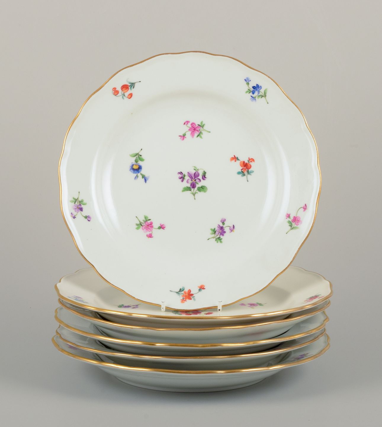 Meissen, Germany. Six dinner plates in porcelain with floral motifs, gold rim. Approx. 1920s/1930s.