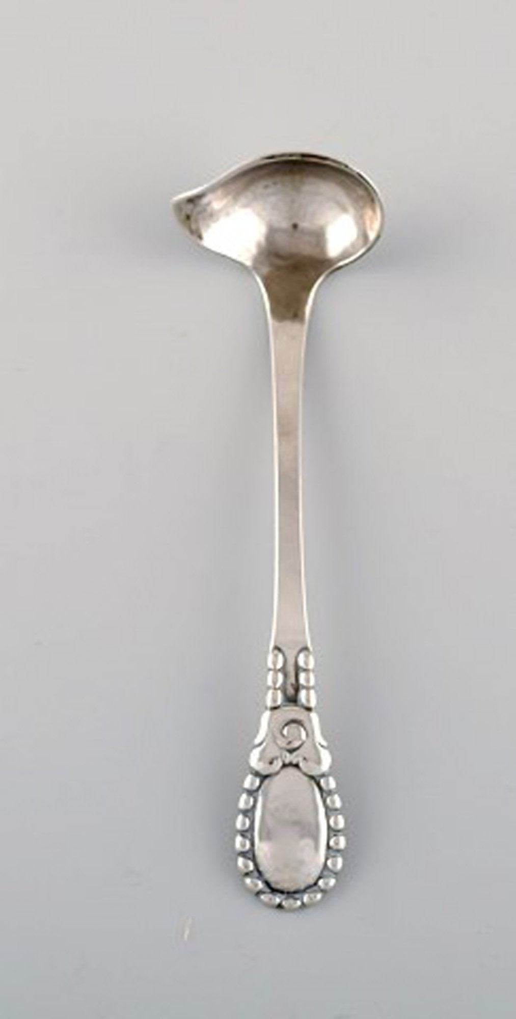 Evald Nielsen number 13 butter sauce spoon in hammered silver (830). Dated 1924.