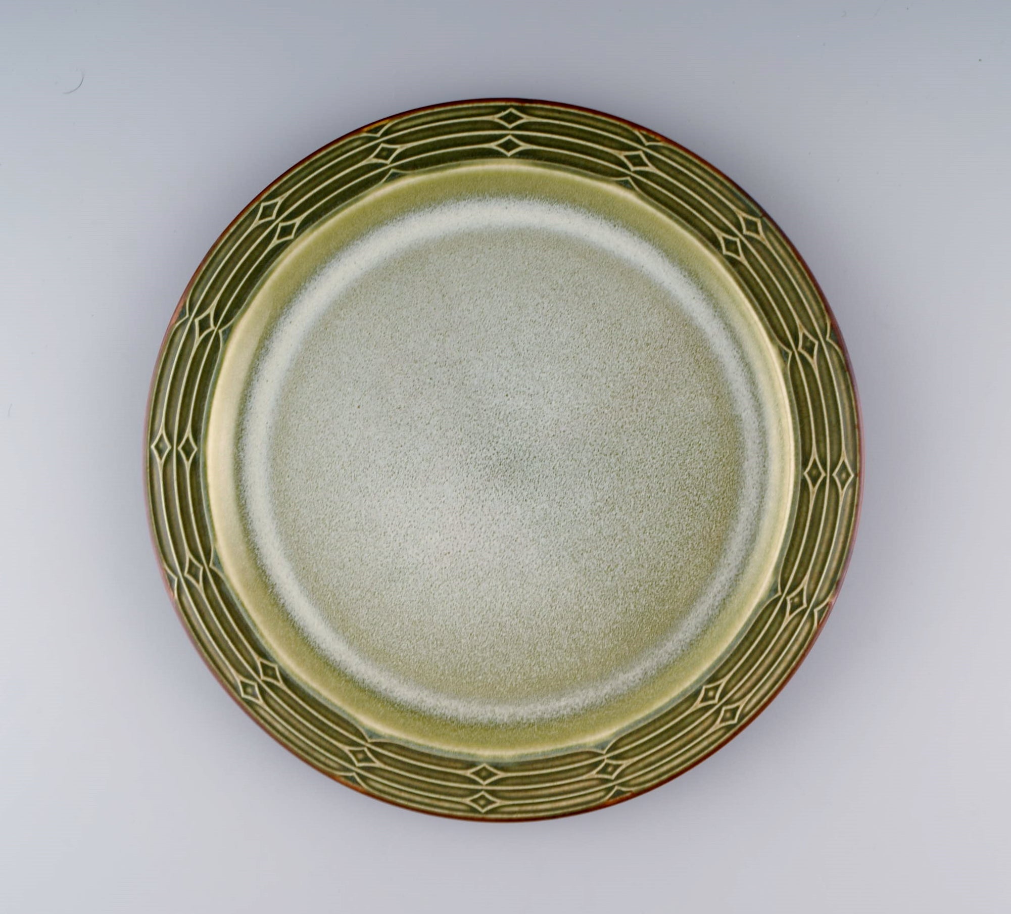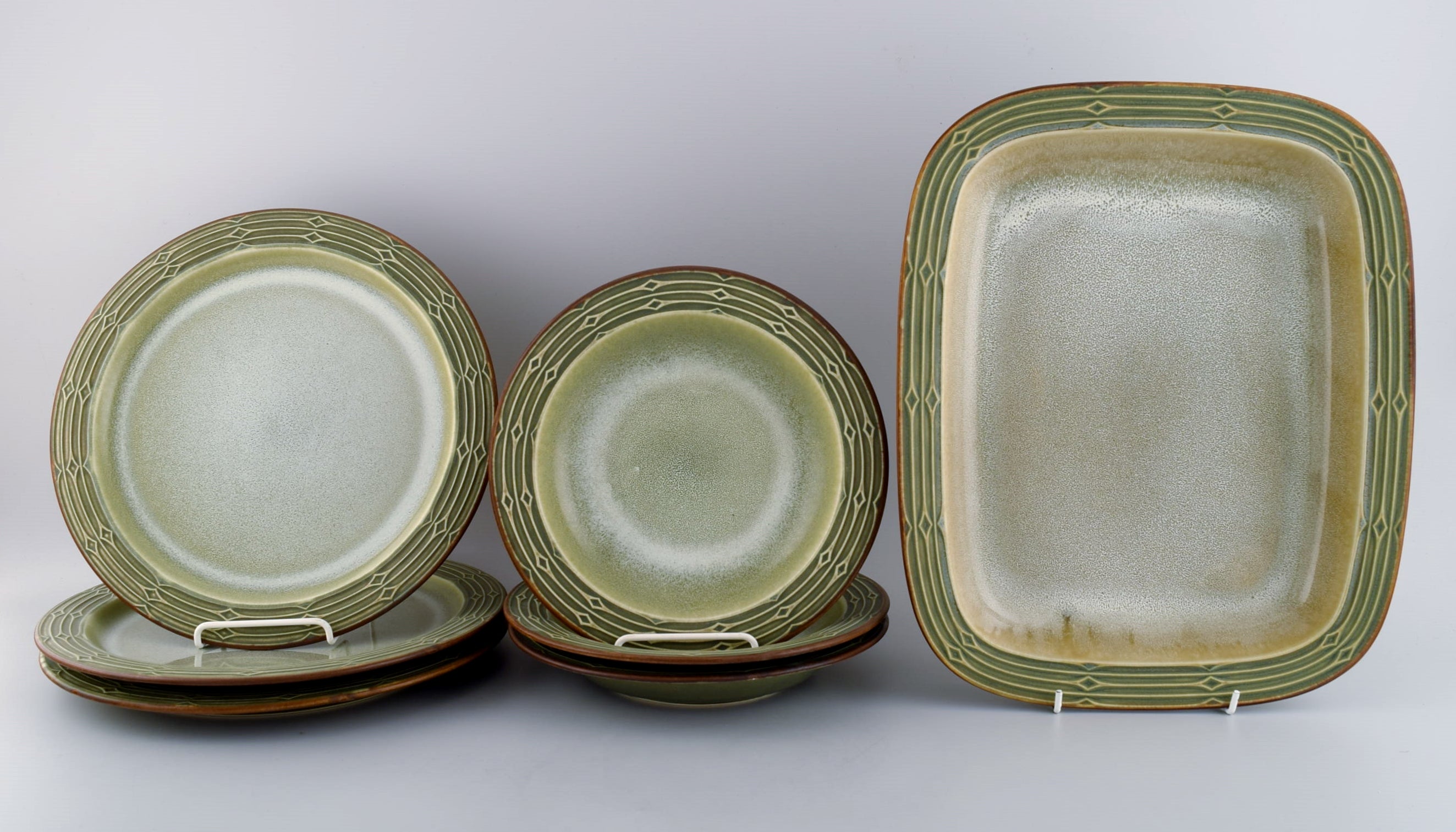 Consisting of three dinner plates, three deep plates and a large serving dish.