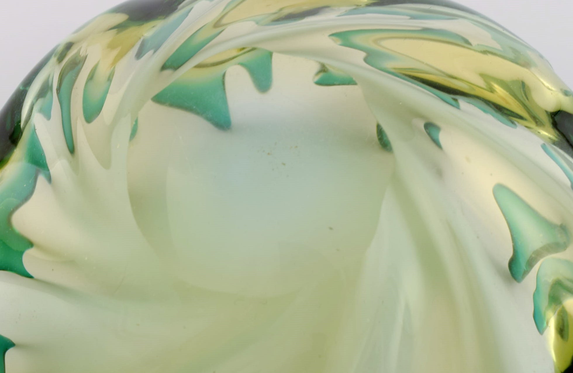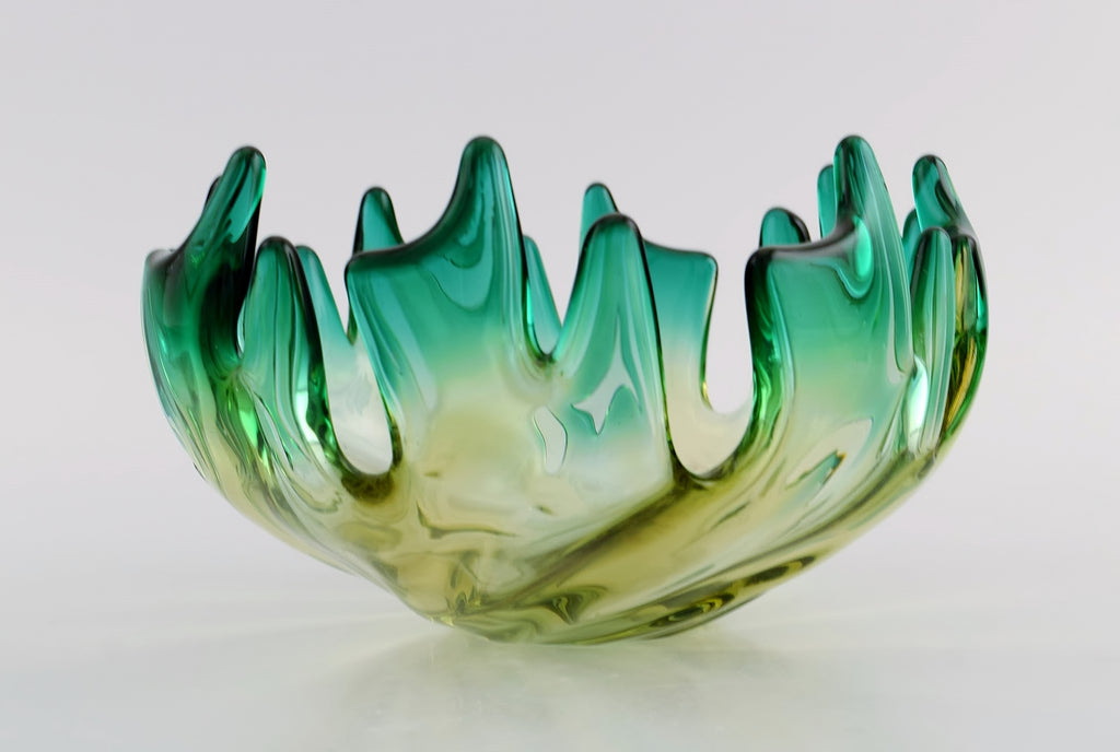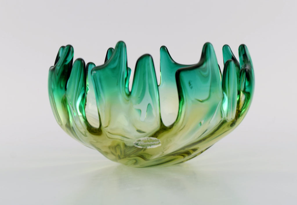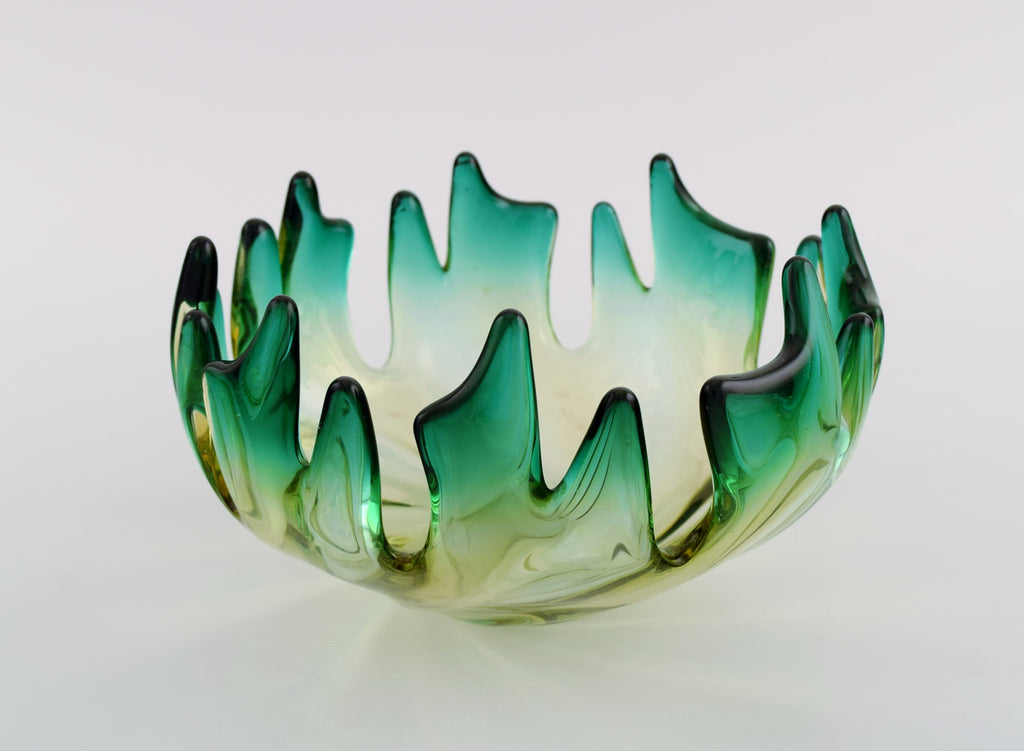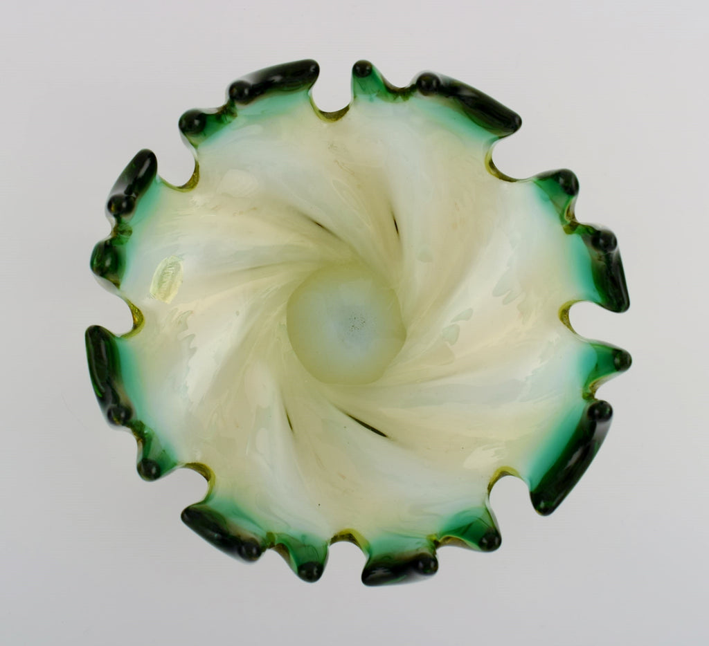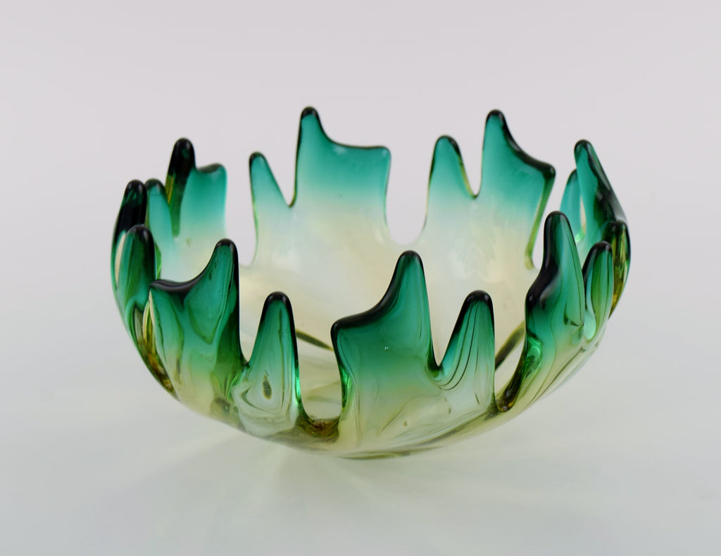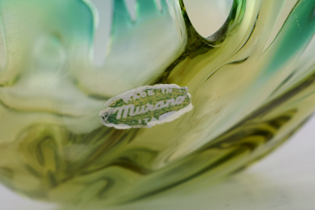 Murano bowl in mouth blown art glass. Green and yellow shades. 1960s.