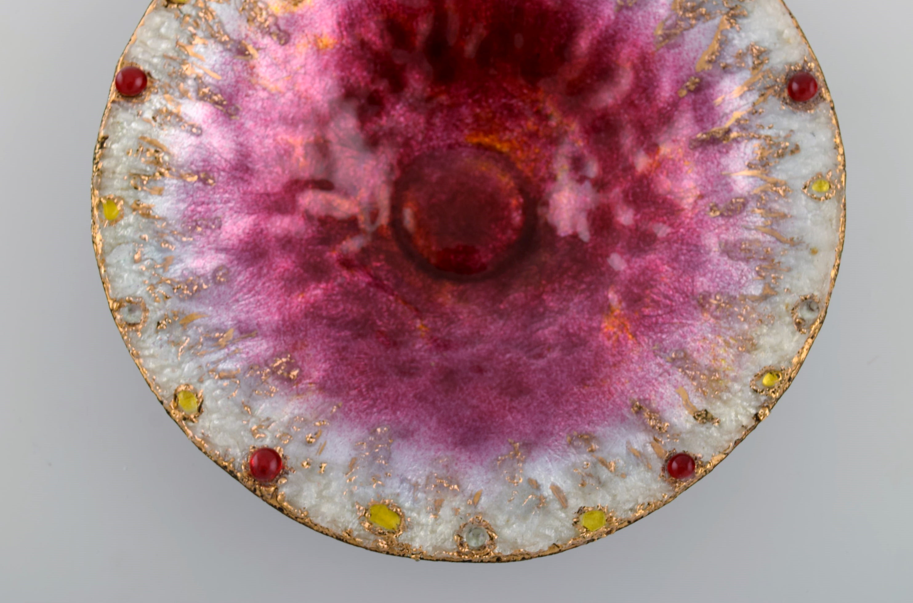 Pierre Bonnet for Limoges. Bronze bowl in enamel work with red and yellow art glass stones inlaid on a pink background. Mid-20th century.