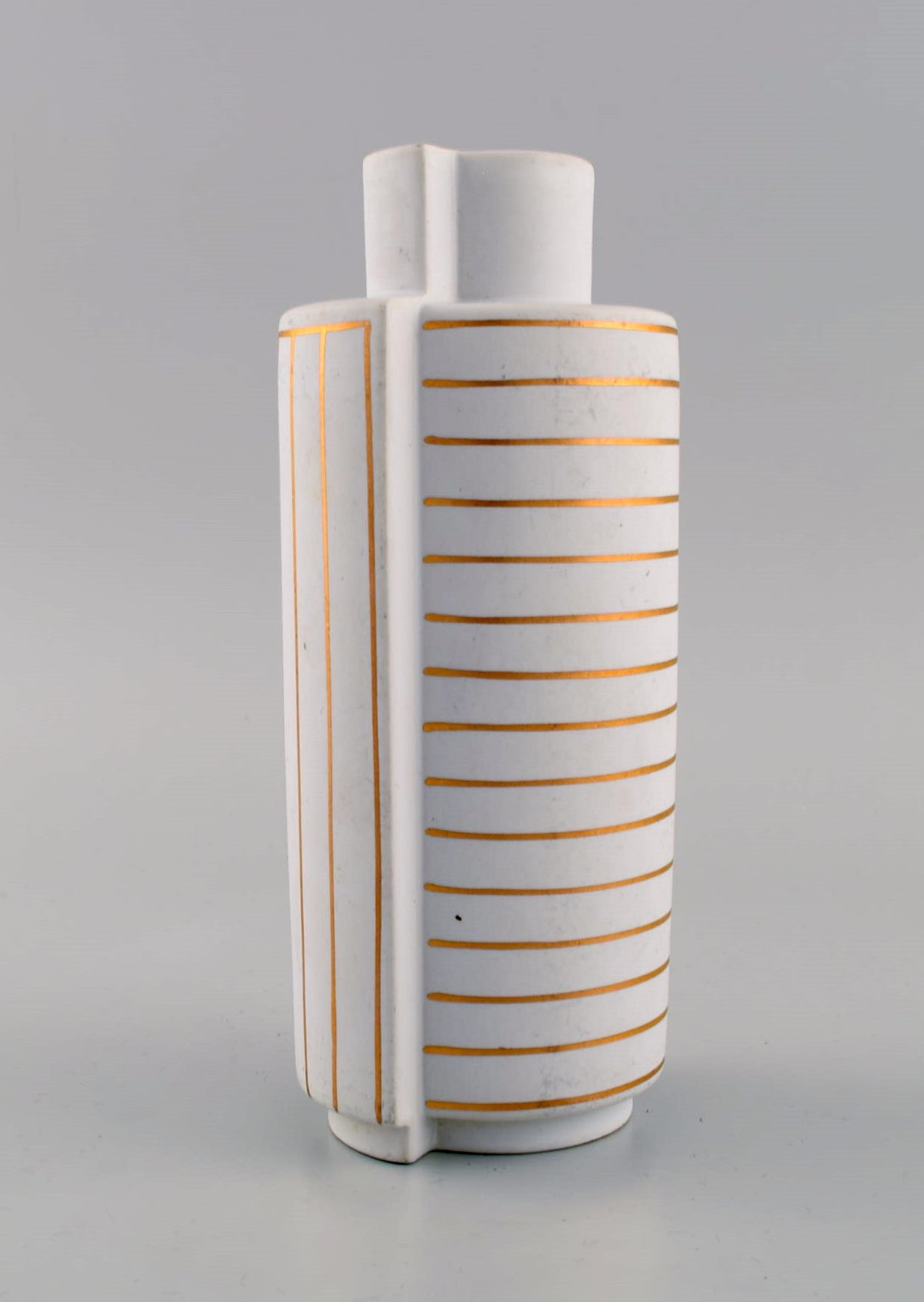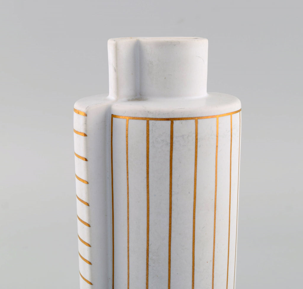 Wilhelm Kåge for Gustavsberg Studio Hand. Gold Surrea ceramic split vase in white carrara glaze with horizontal and vertical gold stripes. Iconic and surreal design. The Surrea series was designed in 1936.