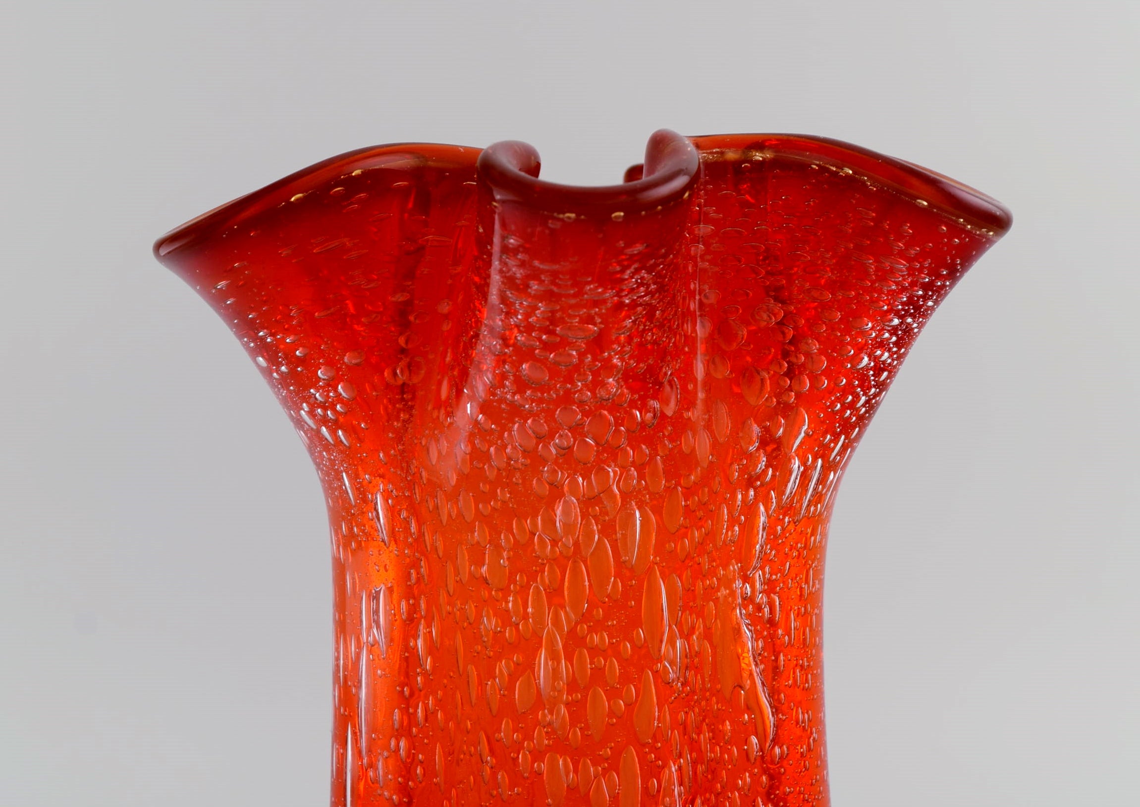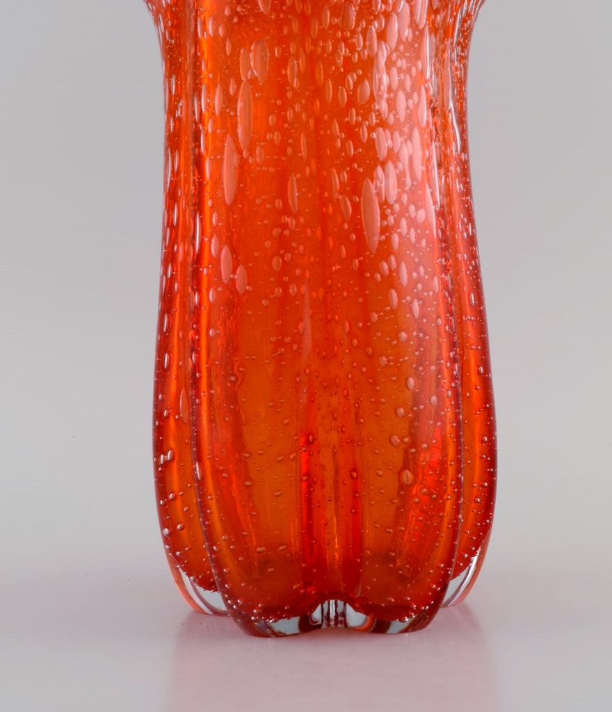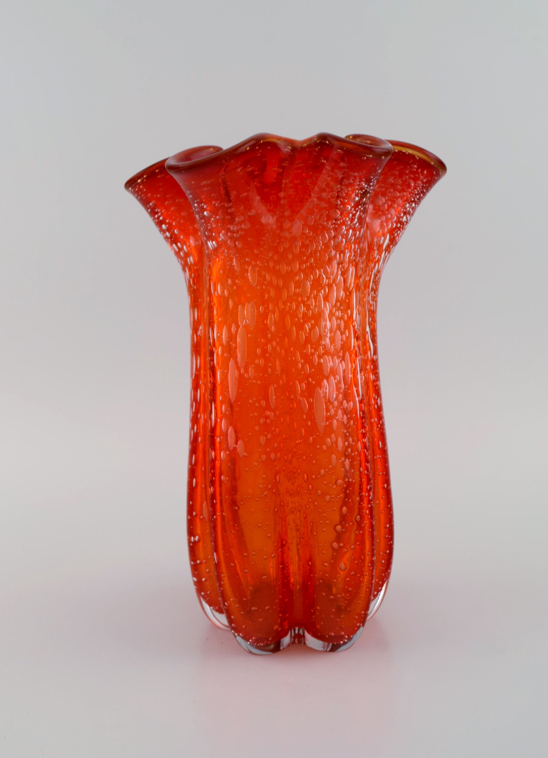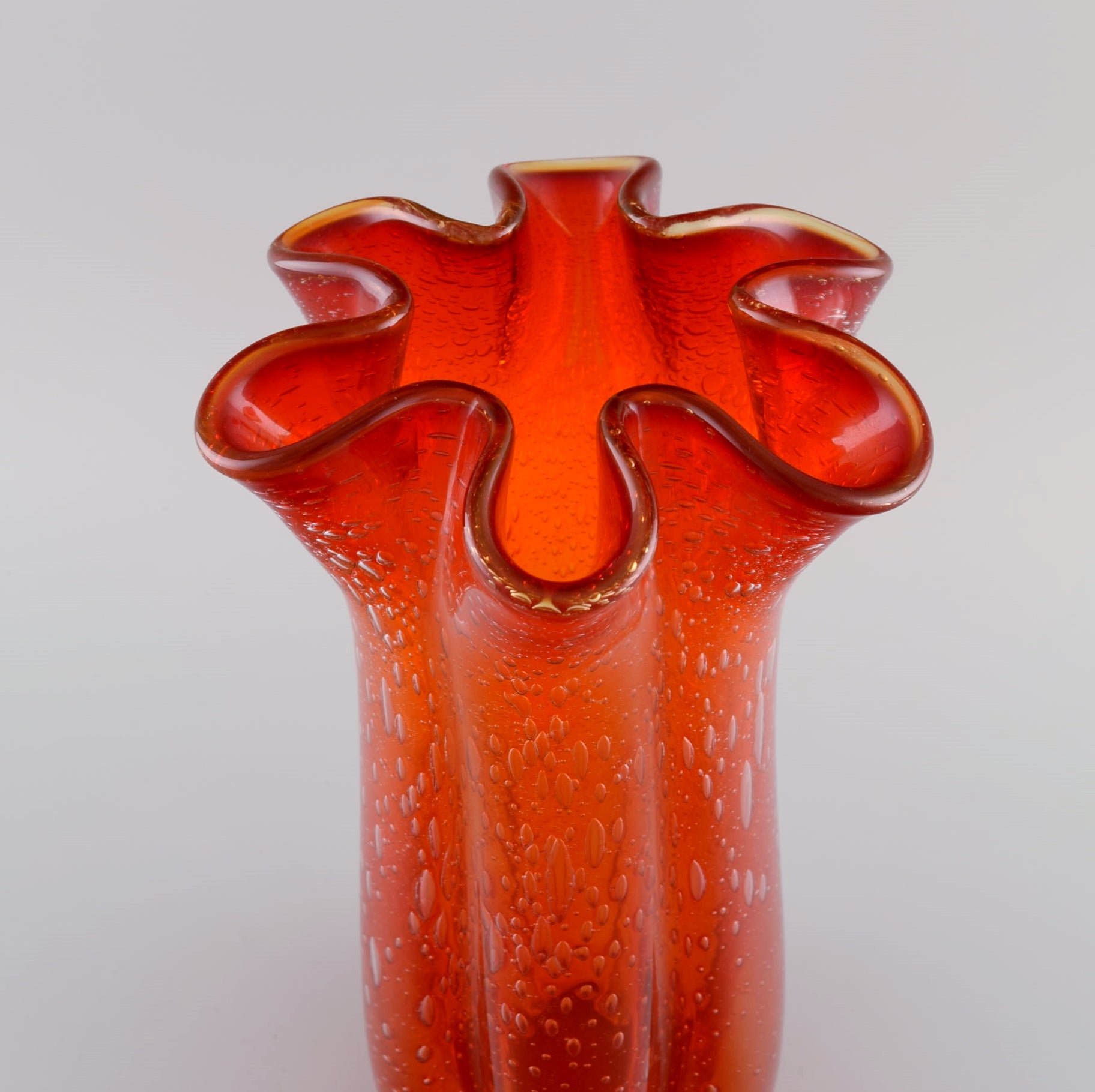 Large Murano vase in mouth blown art glass. Wavy edge and inlaid bubbles. Italian design, 1960s / 70s.