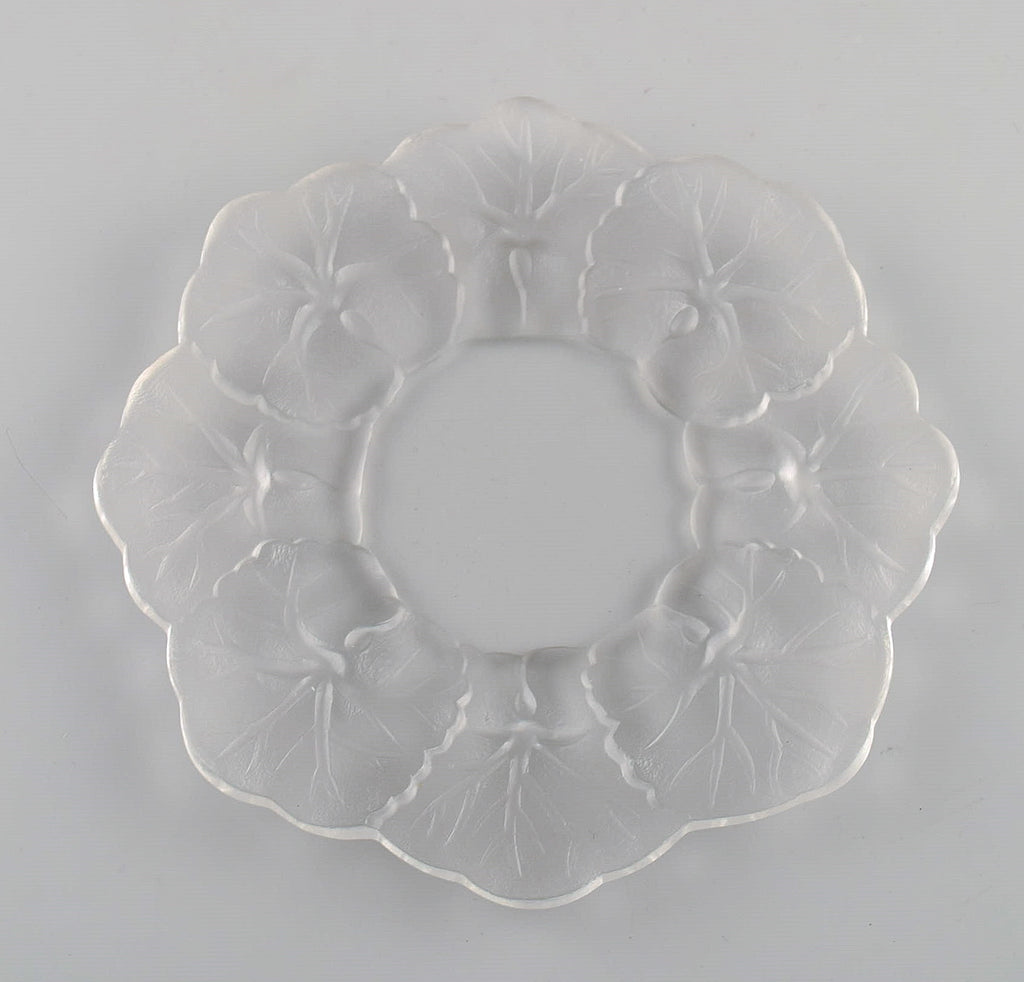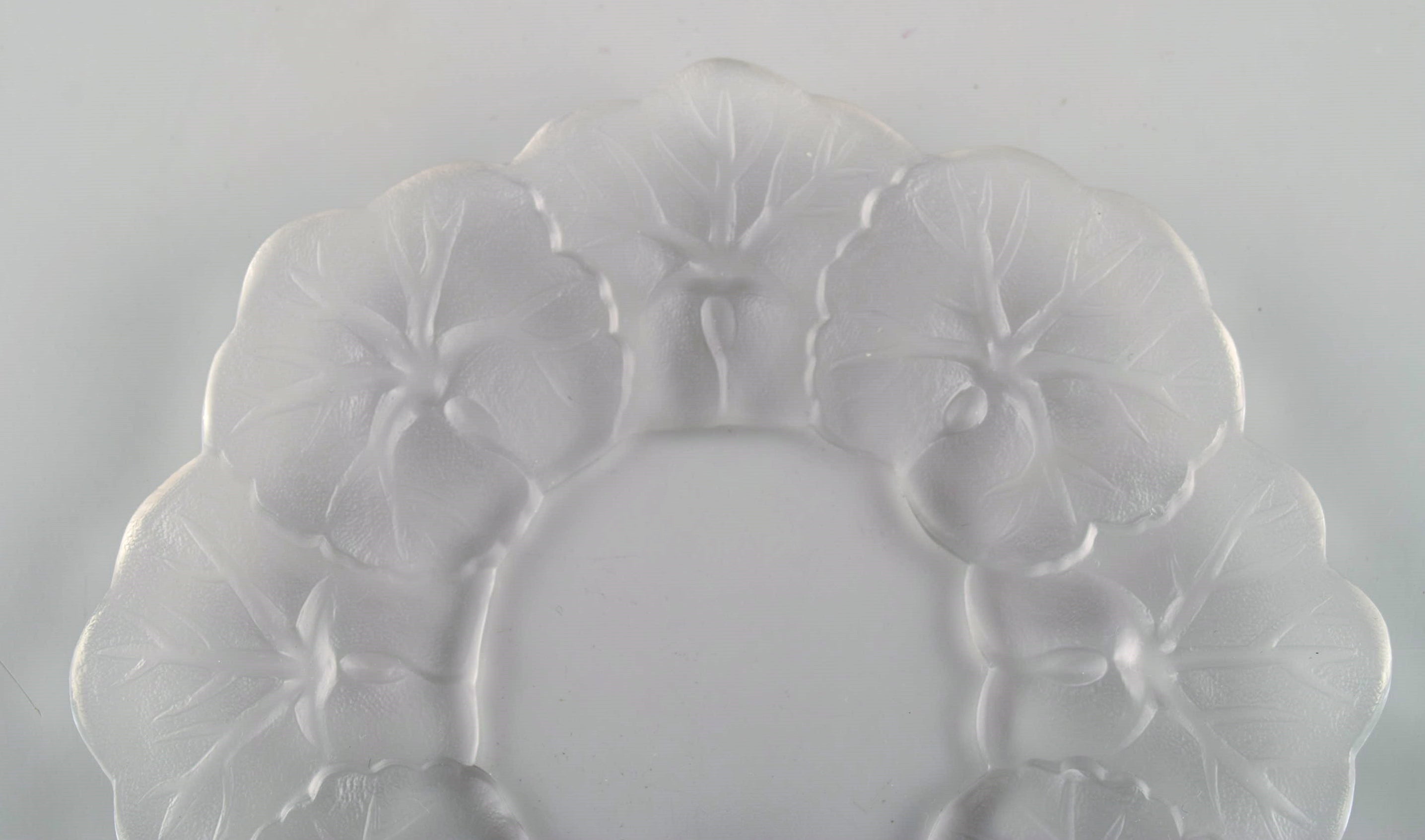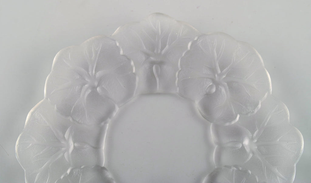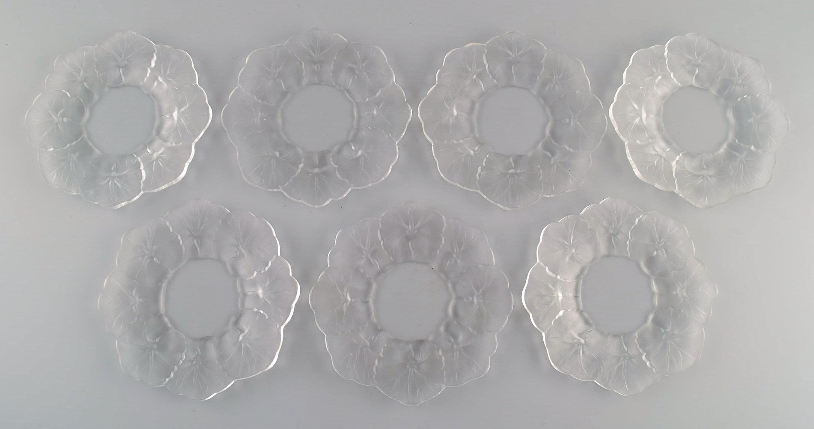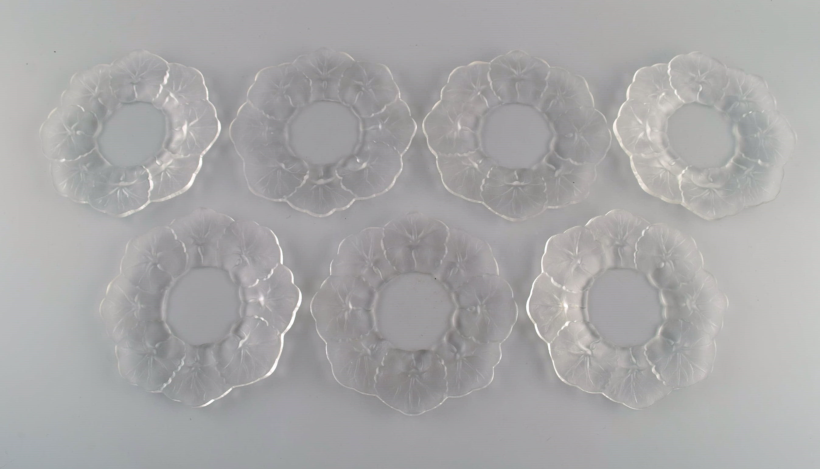 Seven Lalique "Pansies" plates in frosted art glass shaped like flower petals. 1970s / 80s.