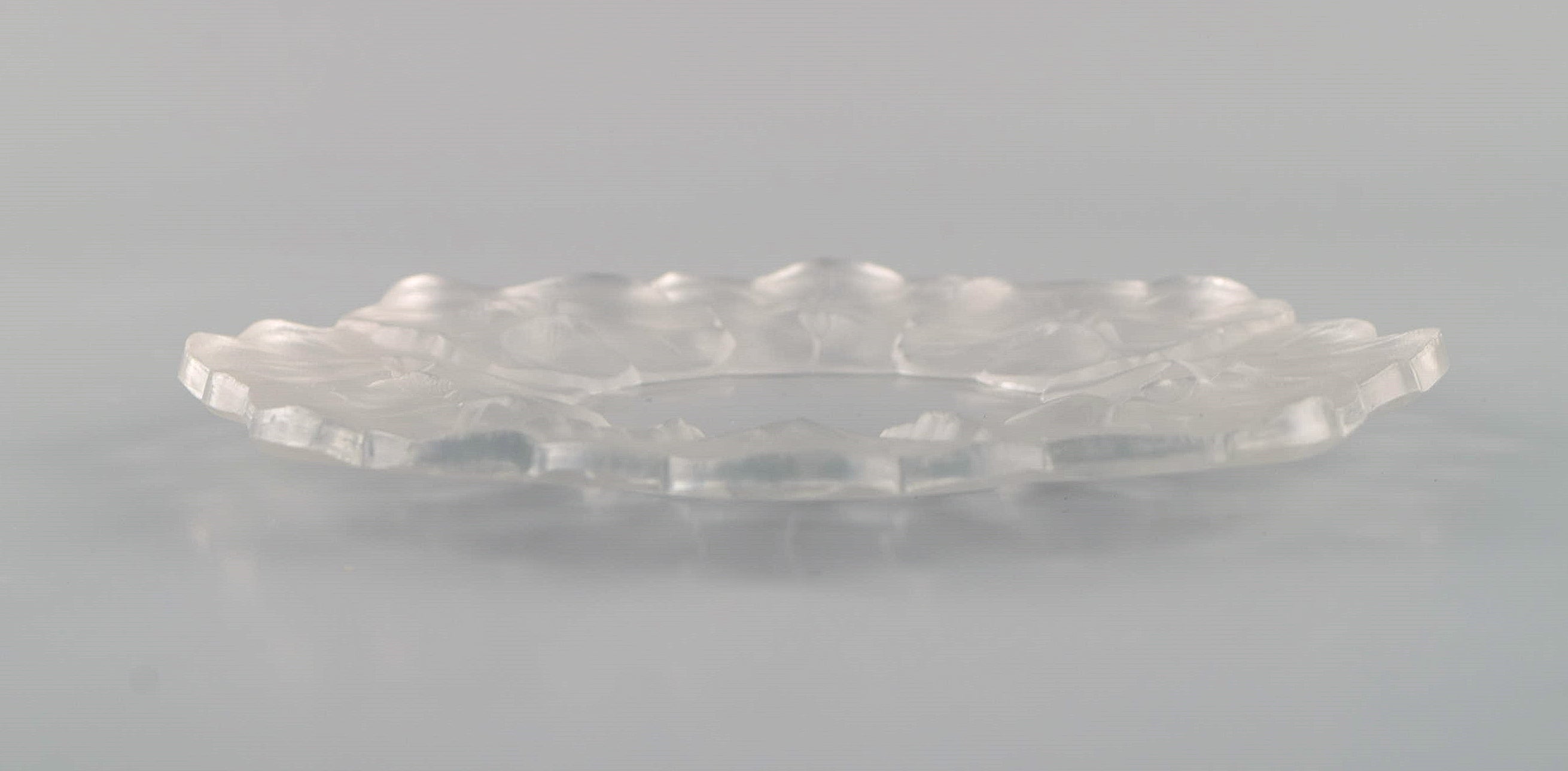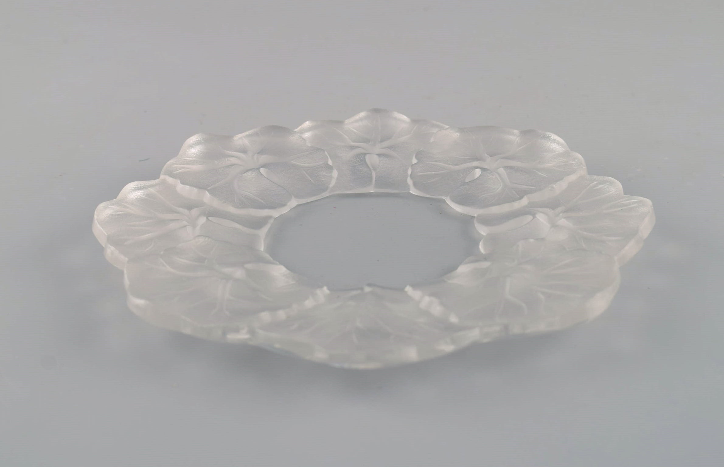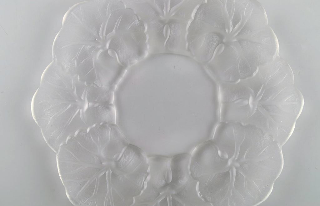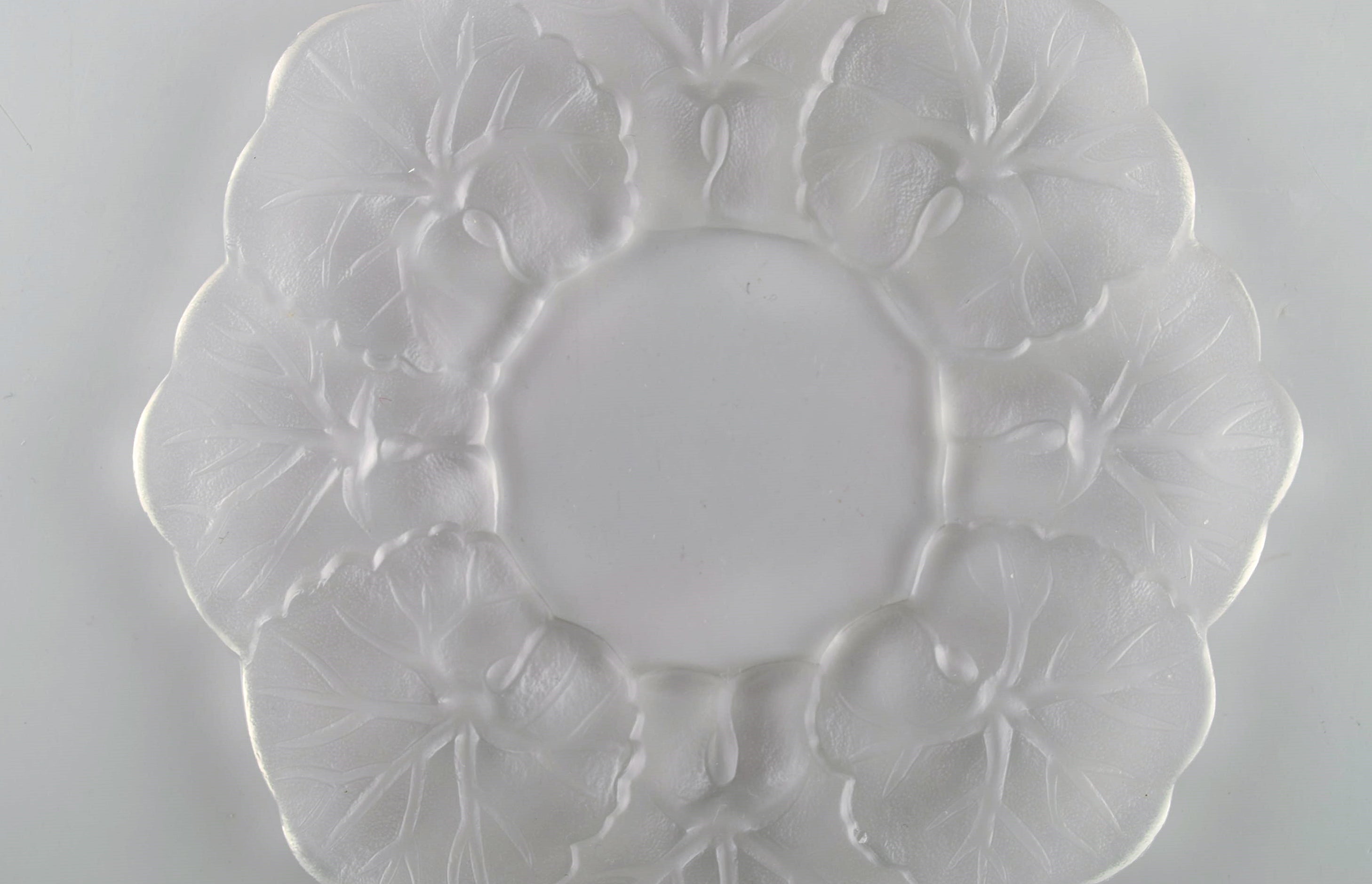Seven Lalique "Pansies" plates in frosted art glass shaped like flower petals. 1970s / 80s.