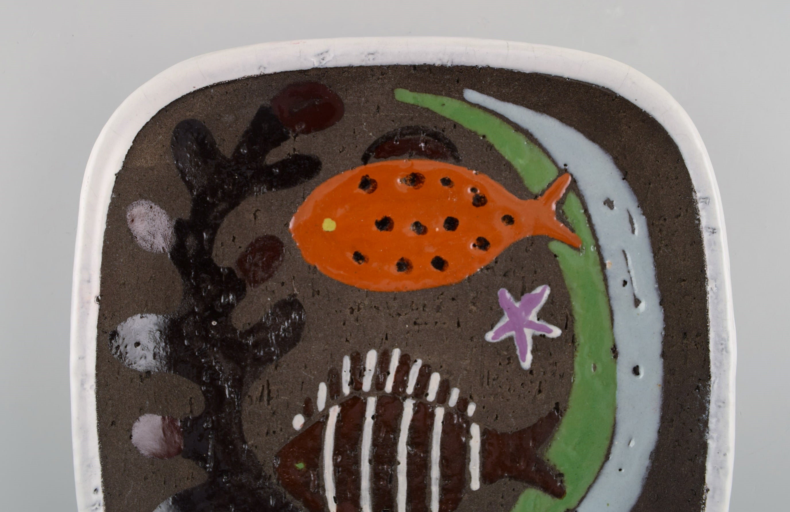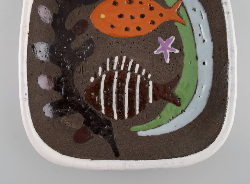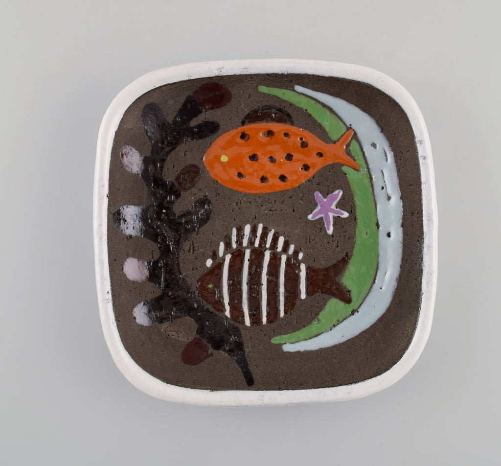Two Upsala-Ekeby dishes in glazed stoneware decorated with fish. 1960s.