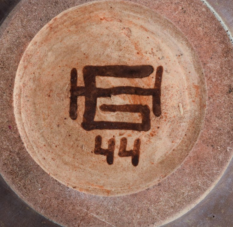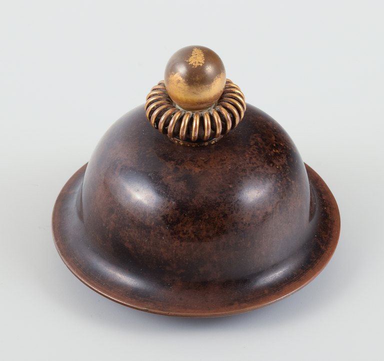 Arne Bang for Holmegaard. Round Art Deco lidded vase in glazed ceramic with bronze lid. Beautiful glaze in brown-green shades.