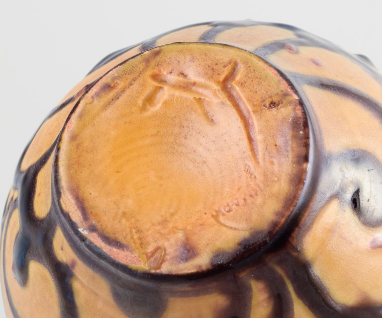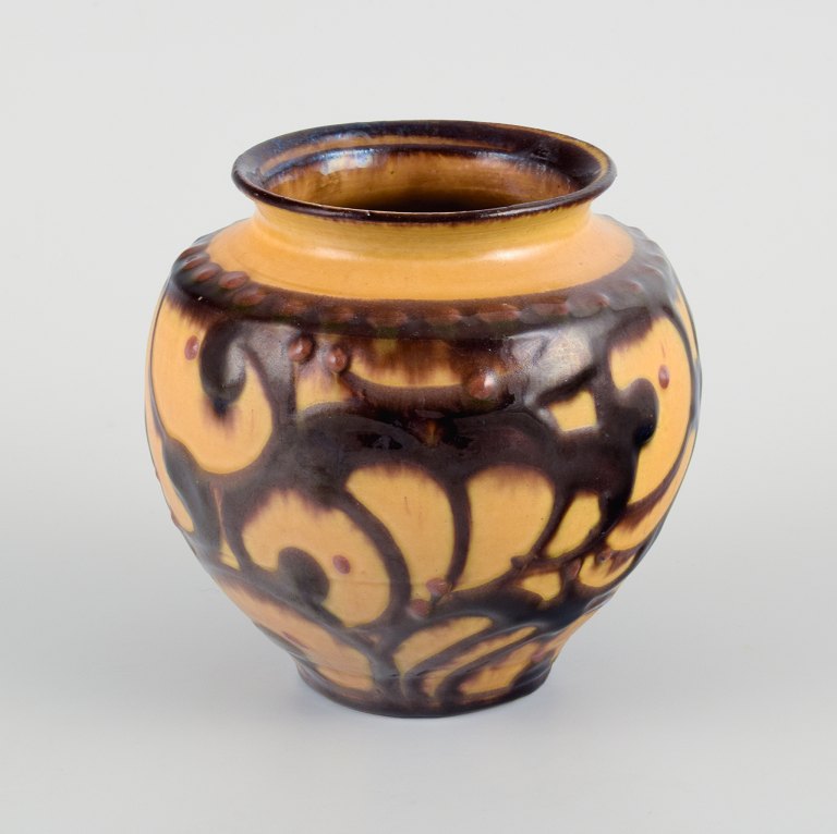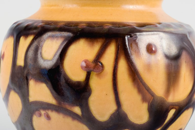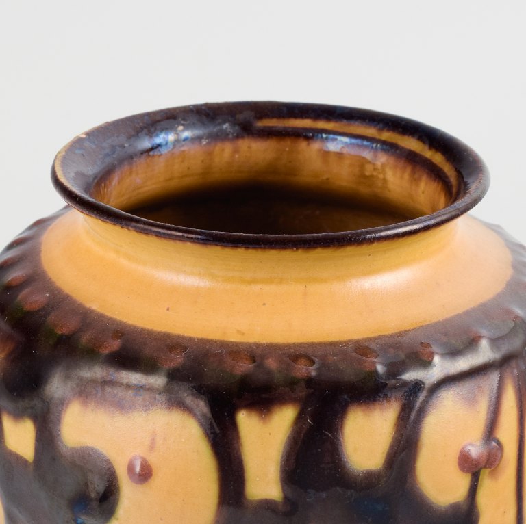 Kähler vase with cow horn decoration in yellow and brown glaze.