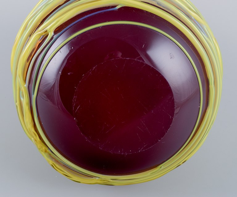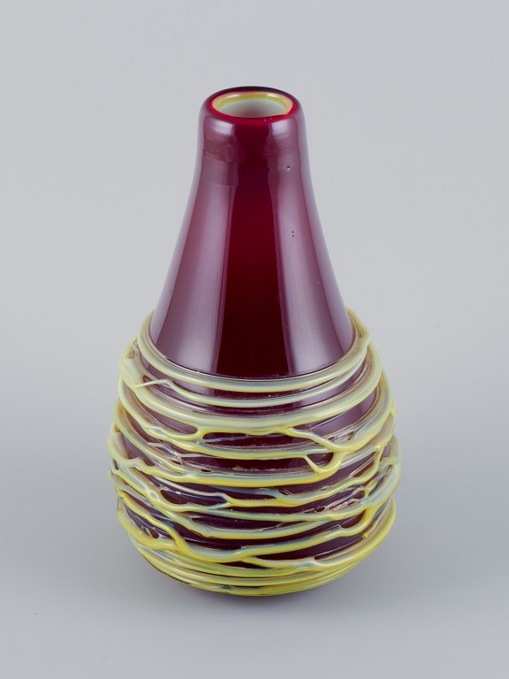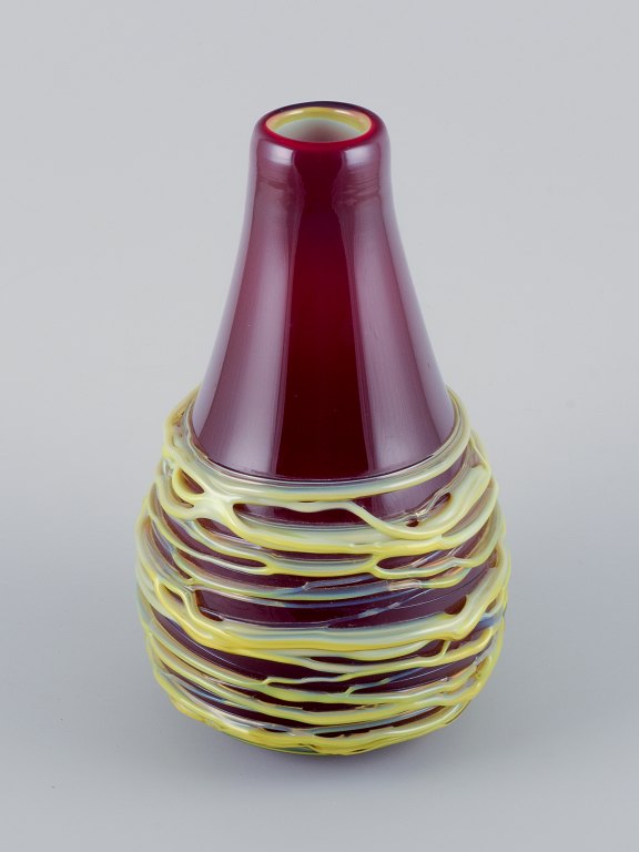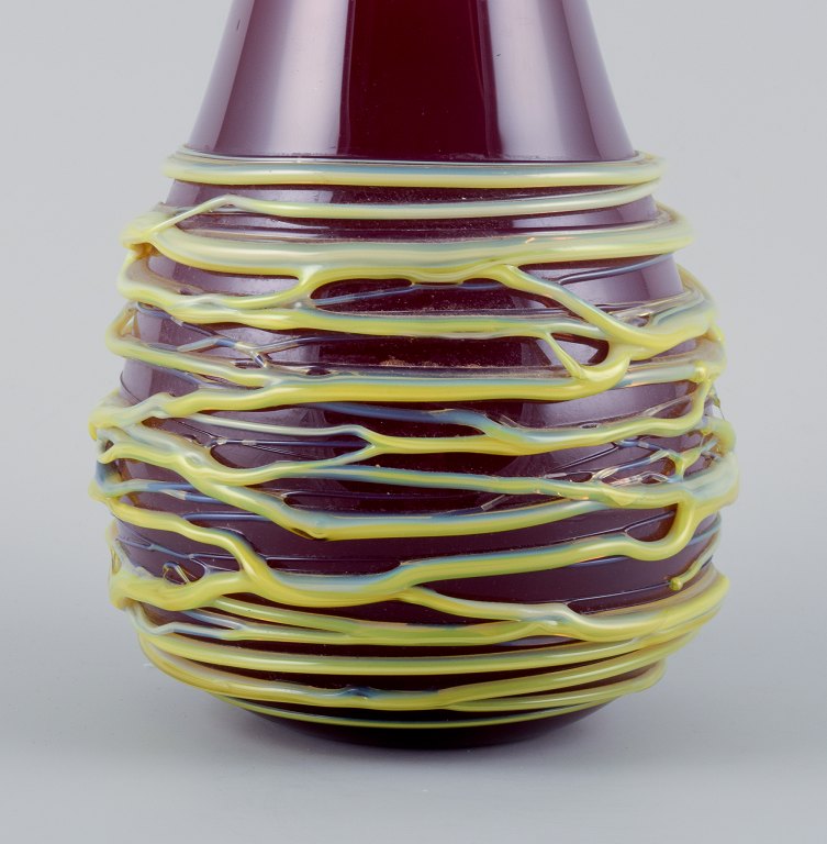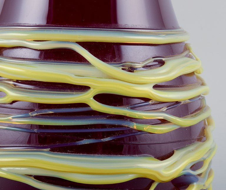 Murano, Italy, large mouth-blown spaghetti vase in burgundy art glass.