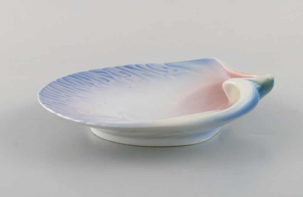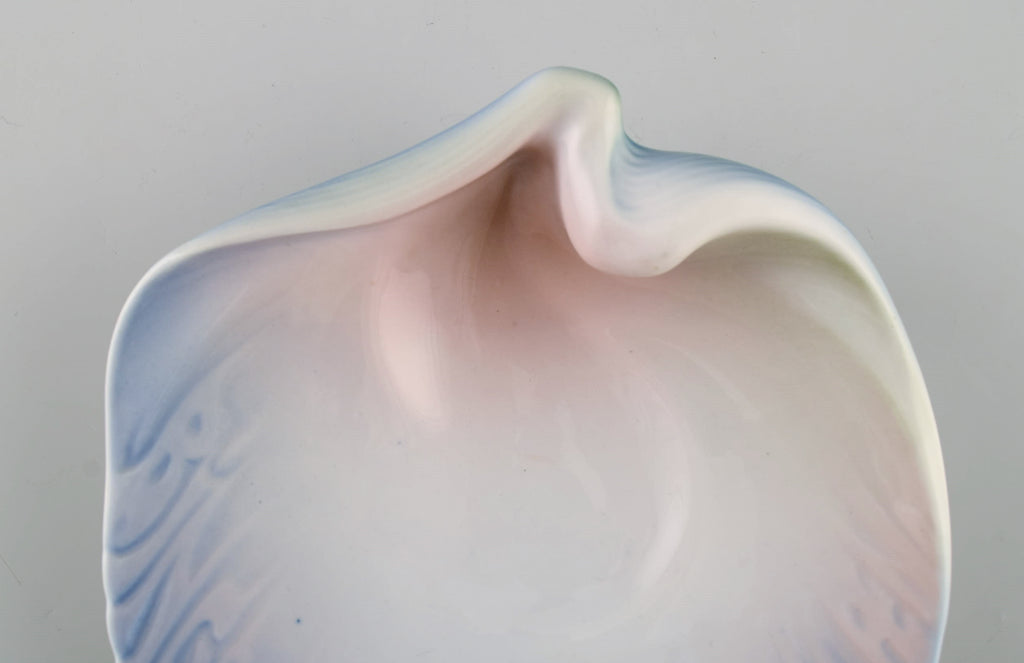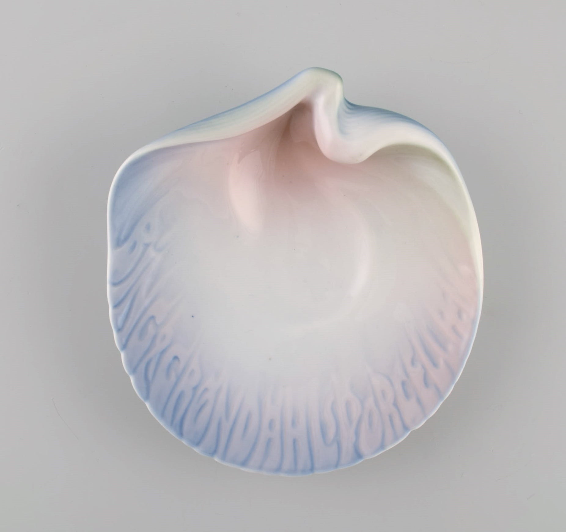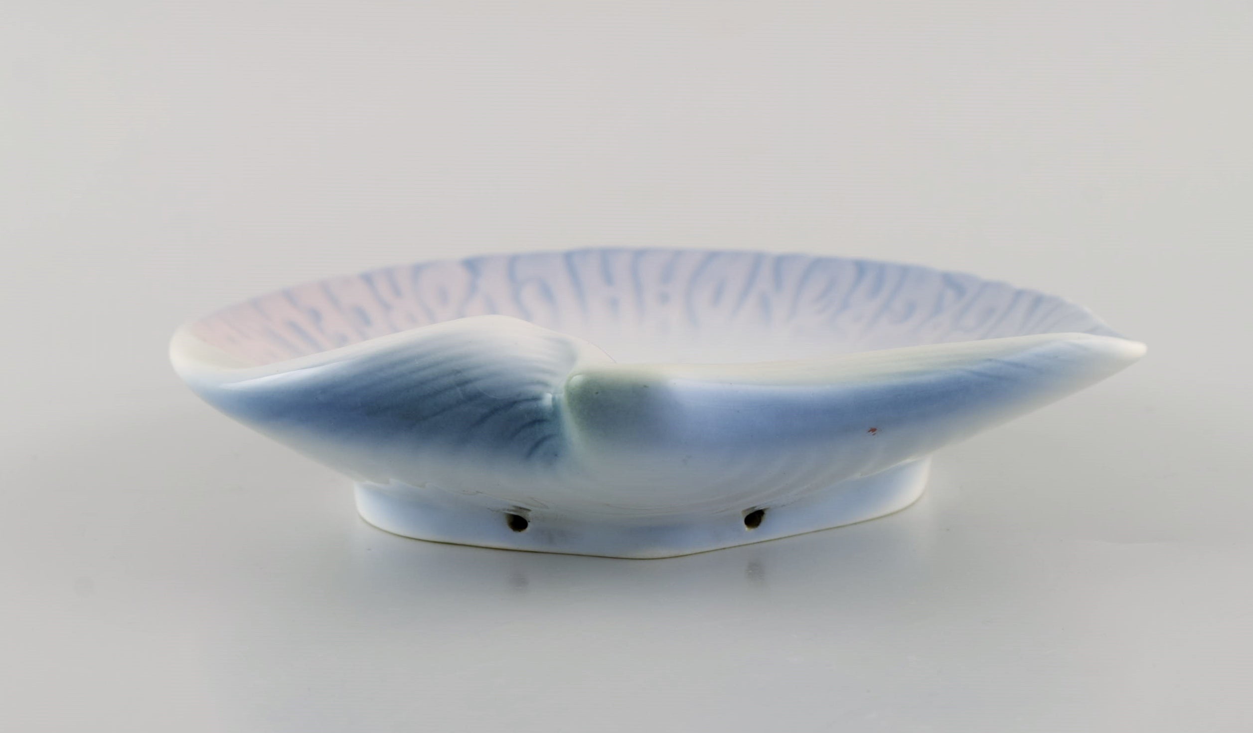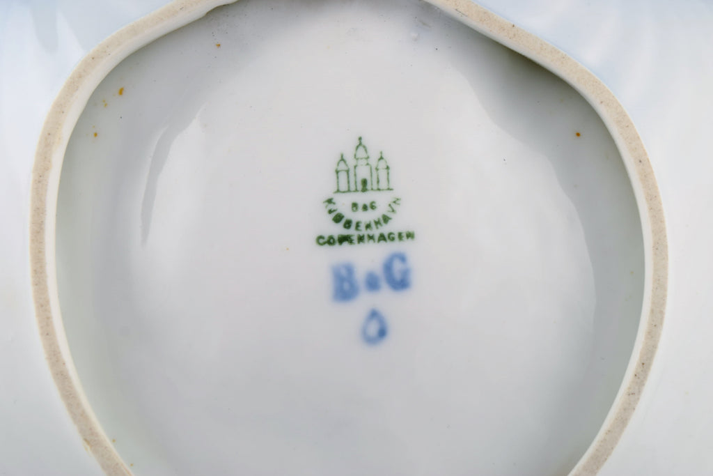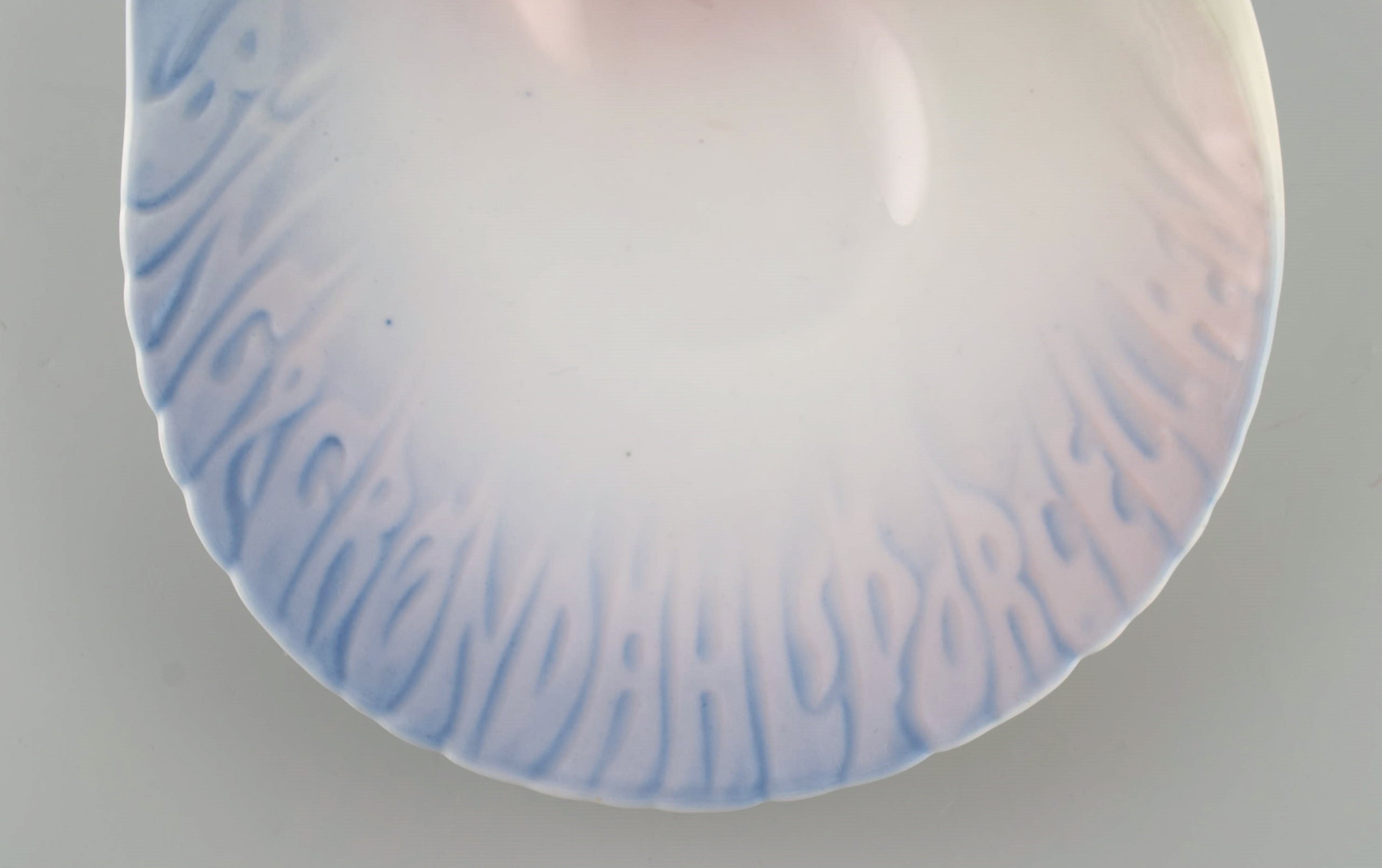 Bing & Grøndahl art nouveau dish shaped like seashell. Text modeled in relief "Bing & Grøndal's porcelain". Dated 1914-1915.