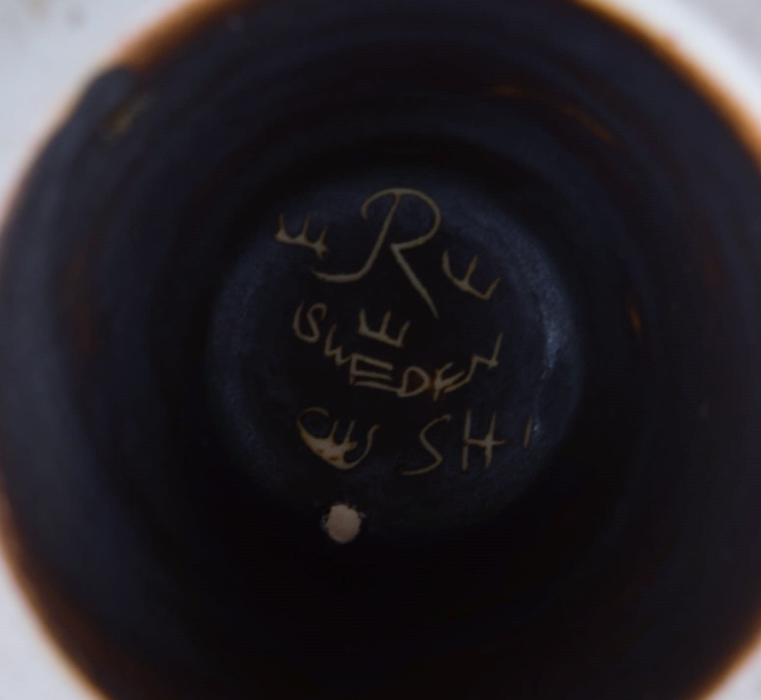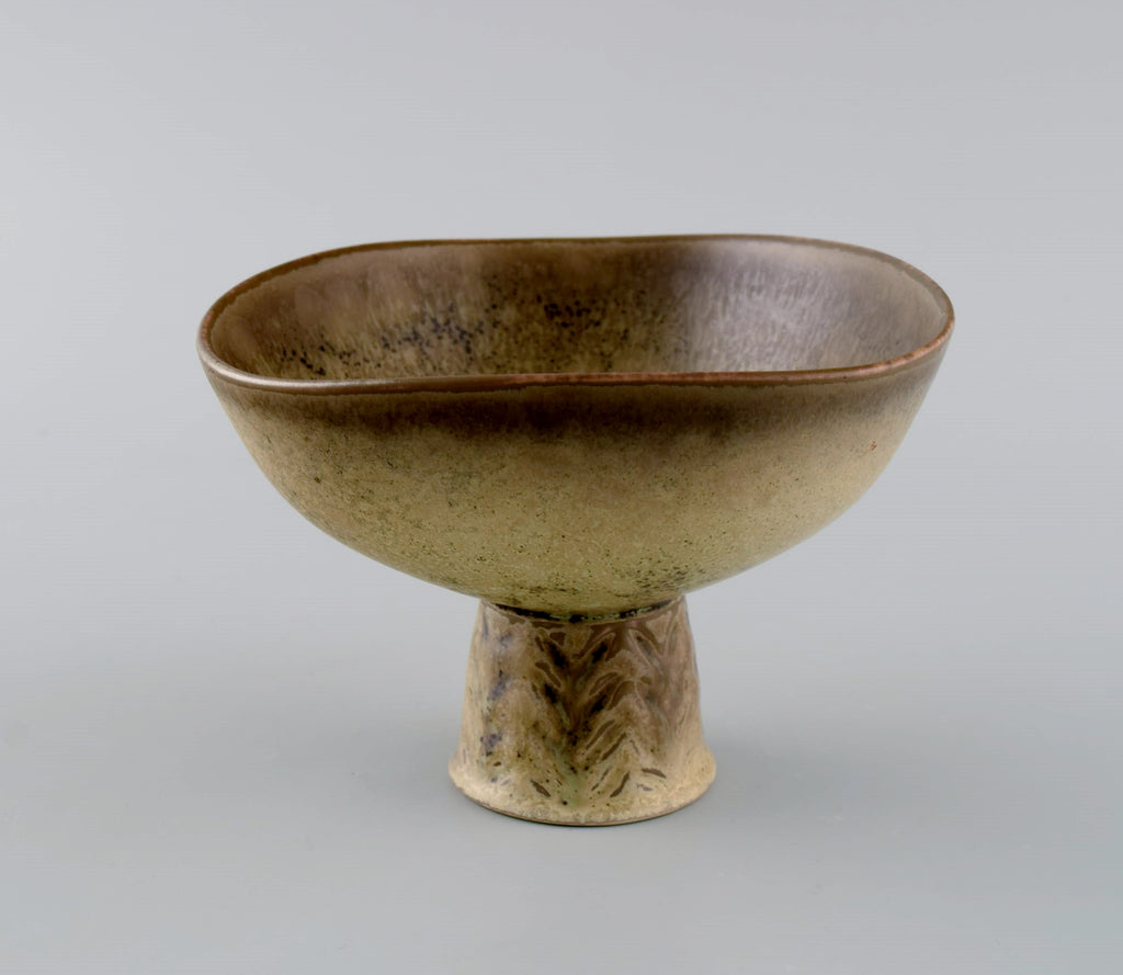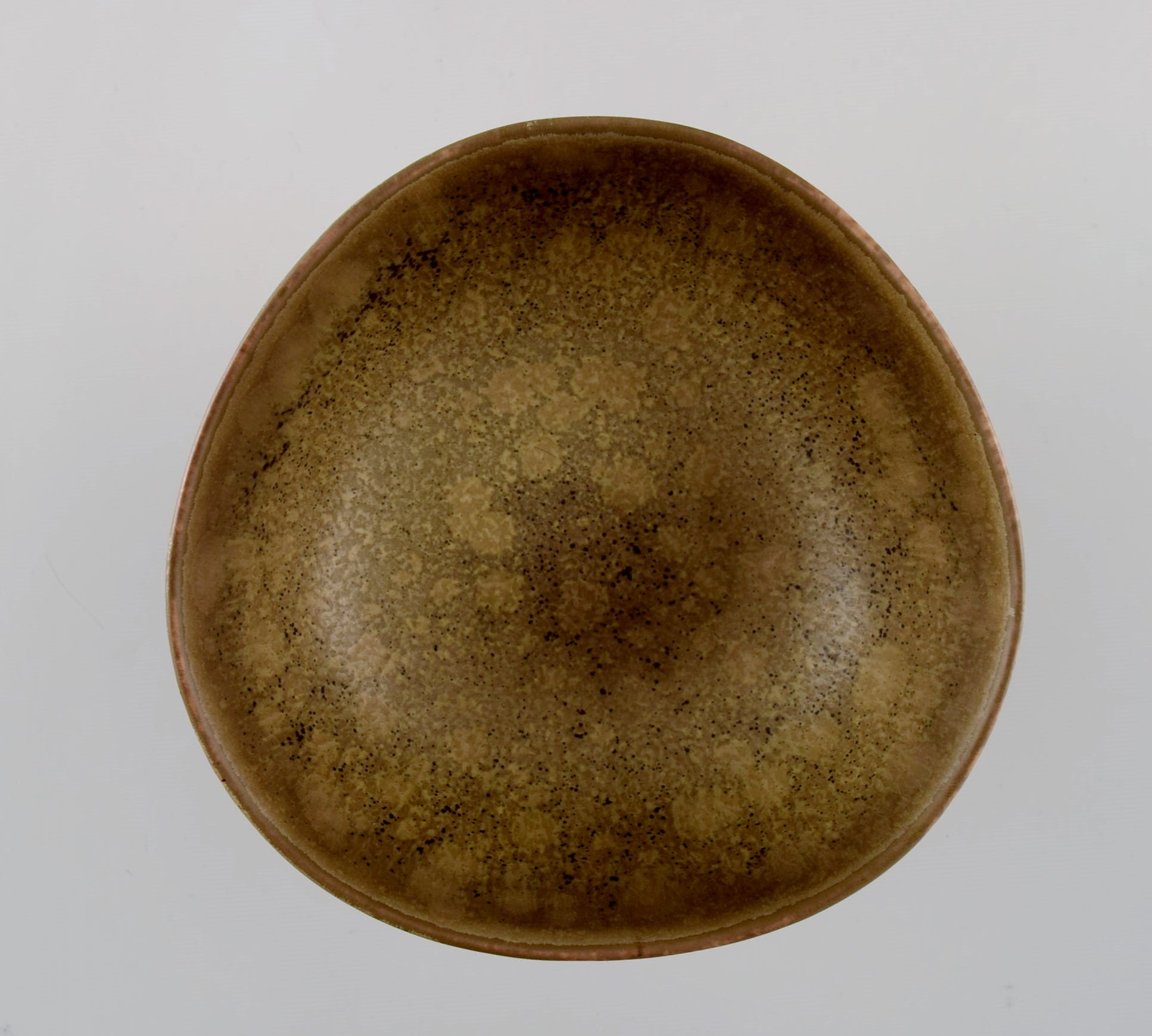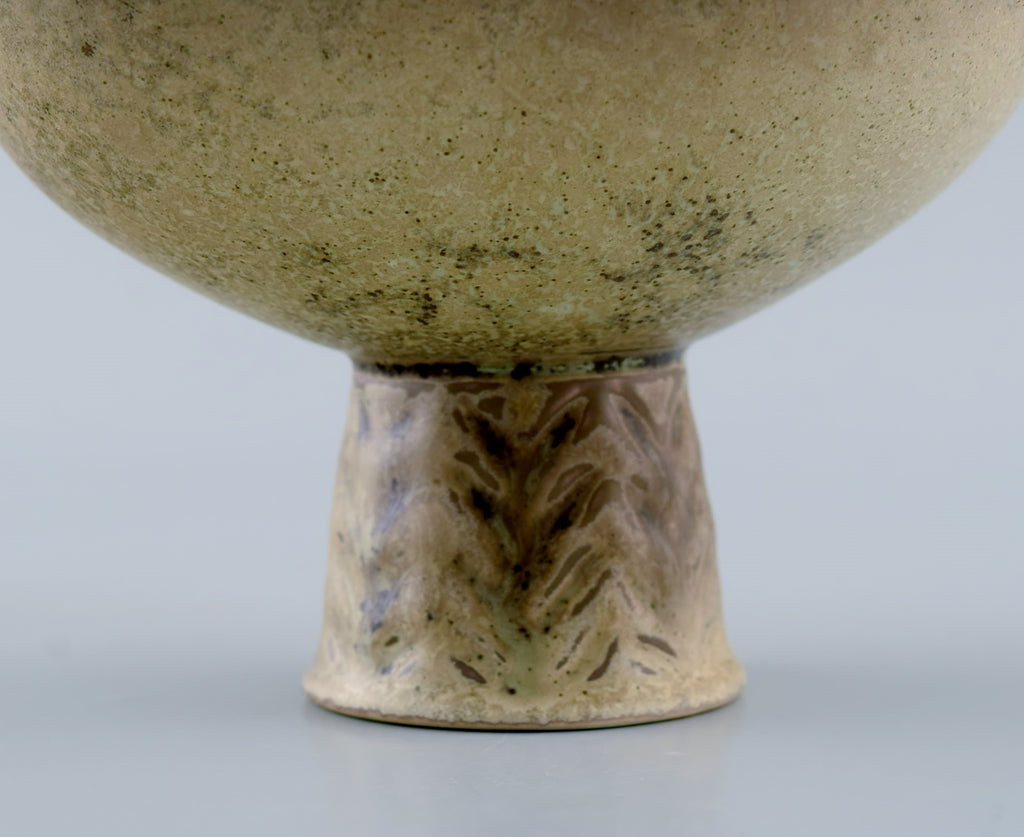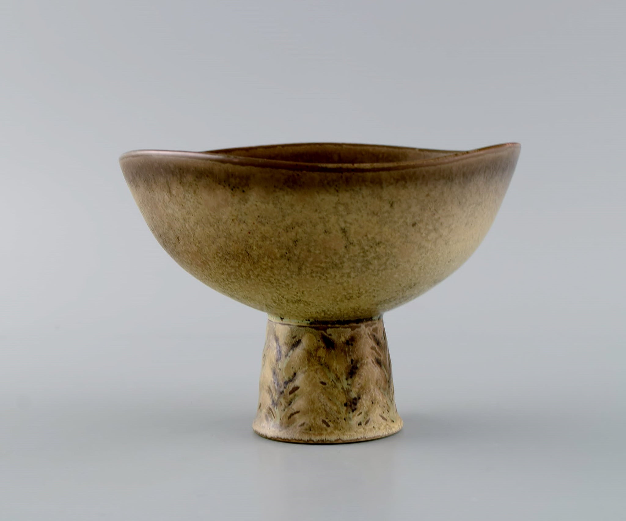 Carl Harry Stålhane (1920-1990) for Rörstrand. Bowl on foot in glazed ceramics. Beautiful glaze in light earth tones. Mid-20th century.