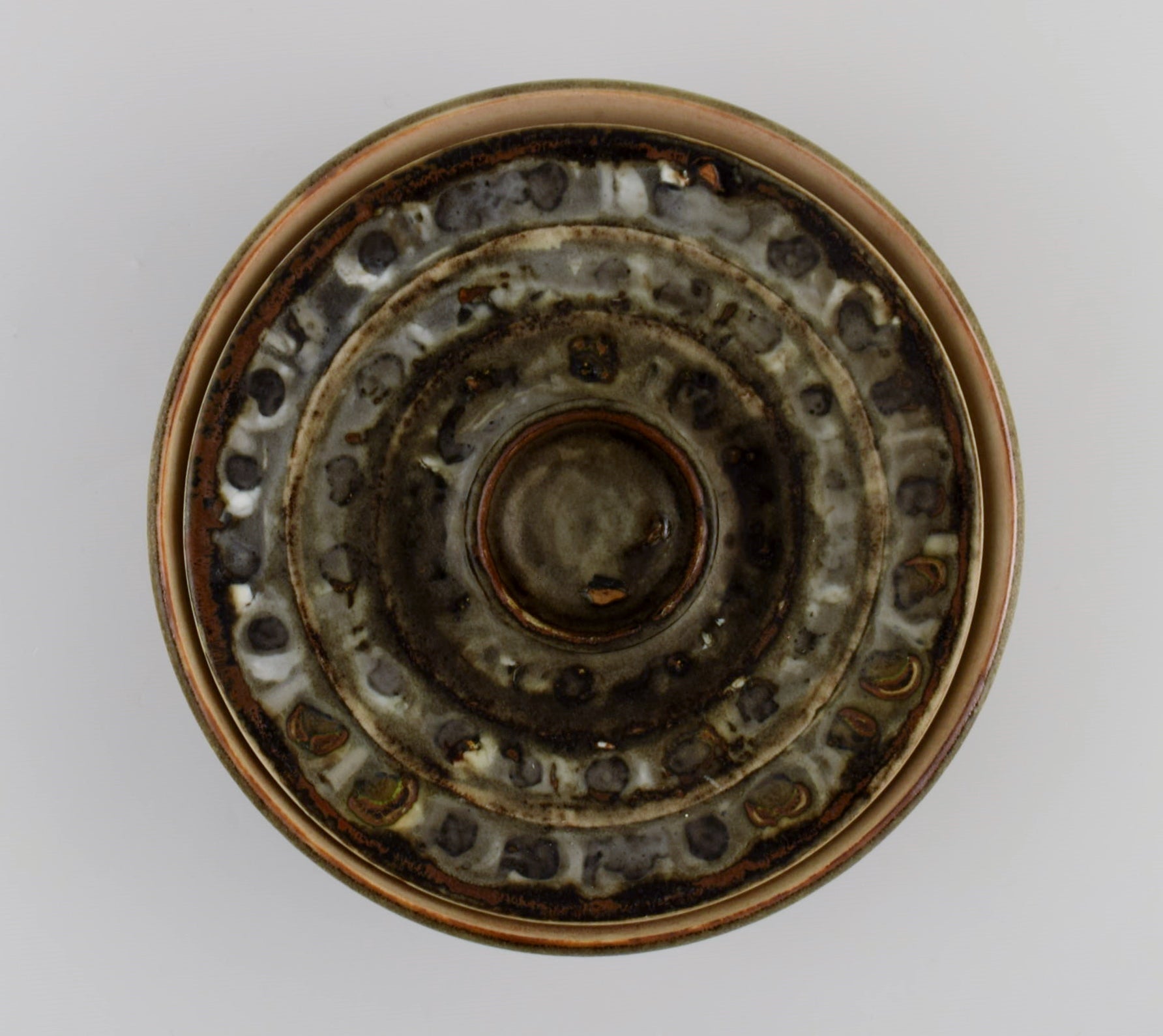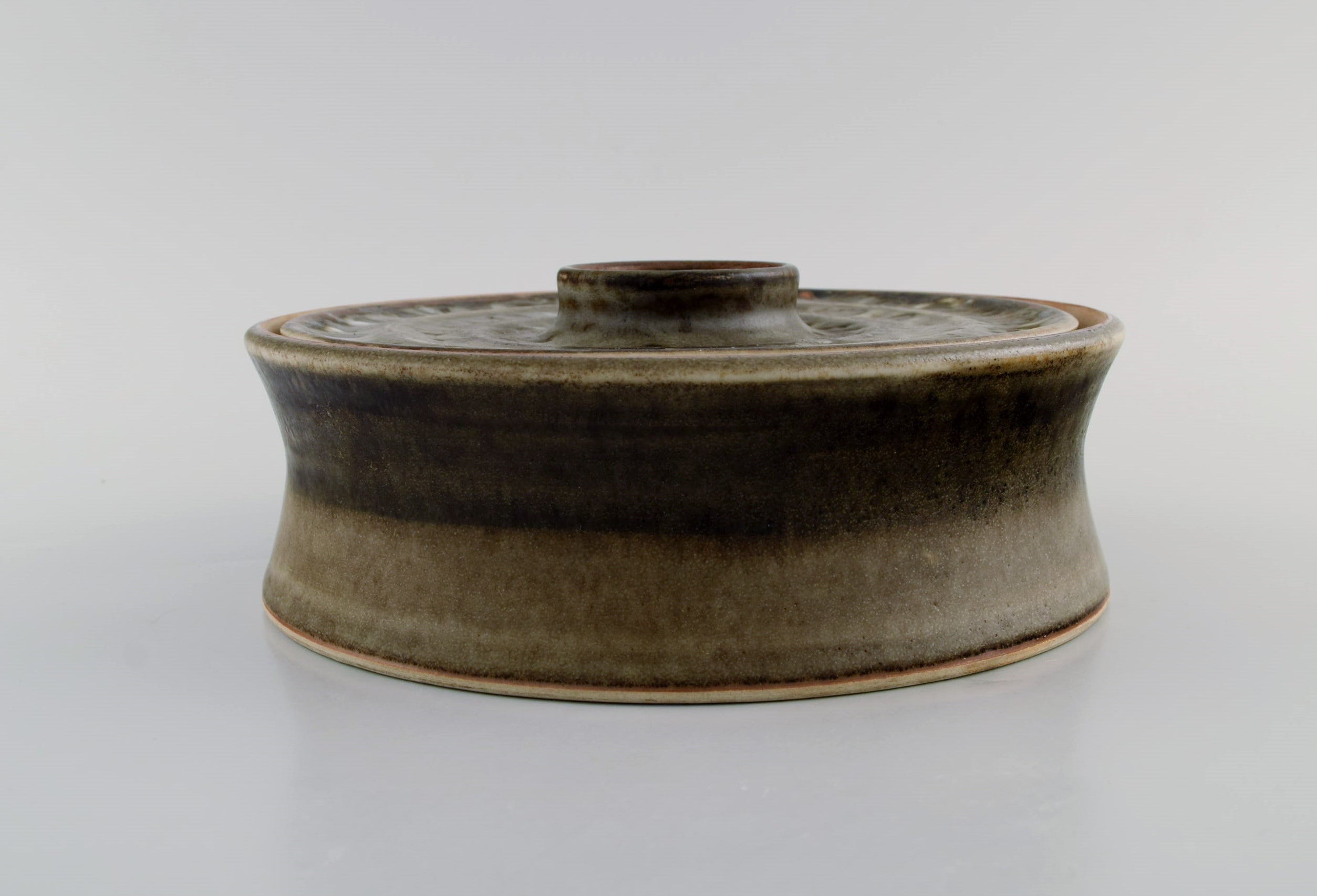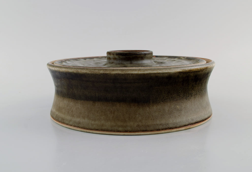 Carl Harry Stålhane (1920-1990) for Rörstrand. Lidded bowl in glazed ceramics. Beautiful glaze in light soil shades. Dated 1961.