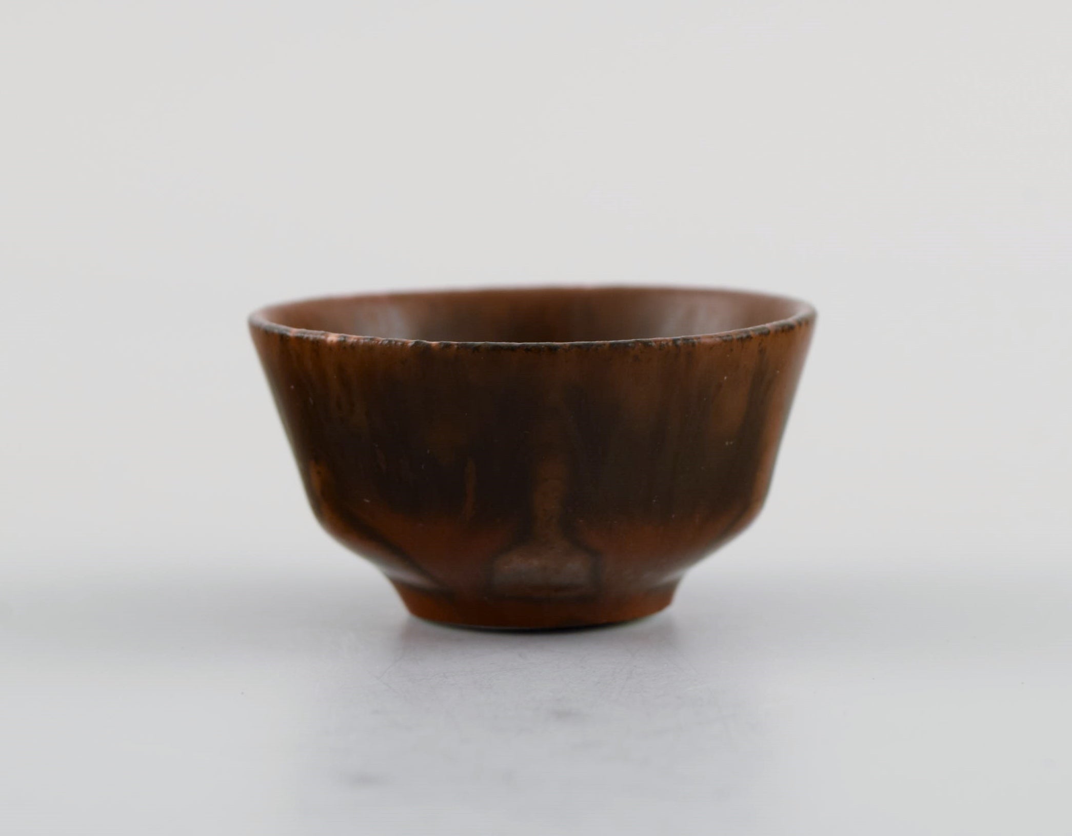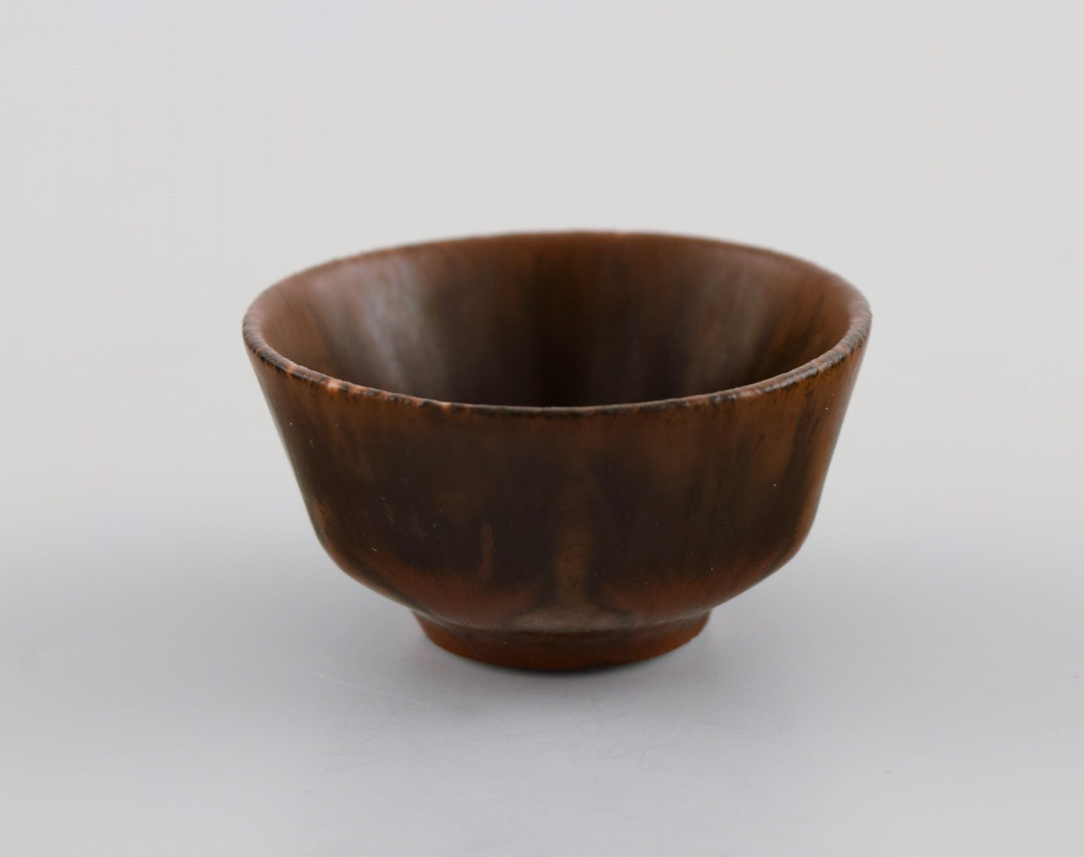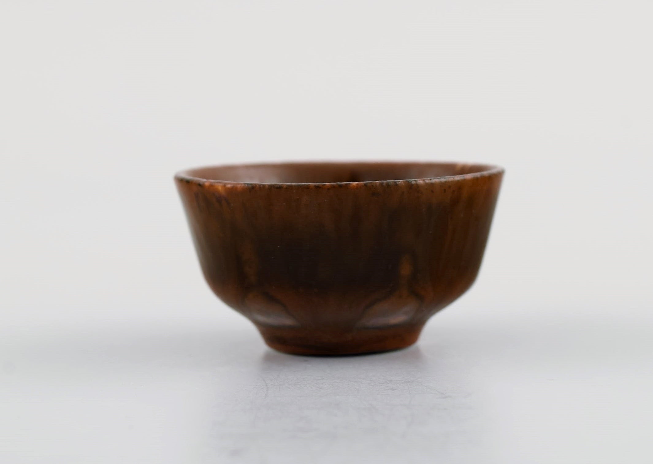 Carl Harry Stålhane (1920-1990) for Rörstrand. Miniature bowl in glazed ceramics. Beautiful glaze in brown shades. Mid-20th century.