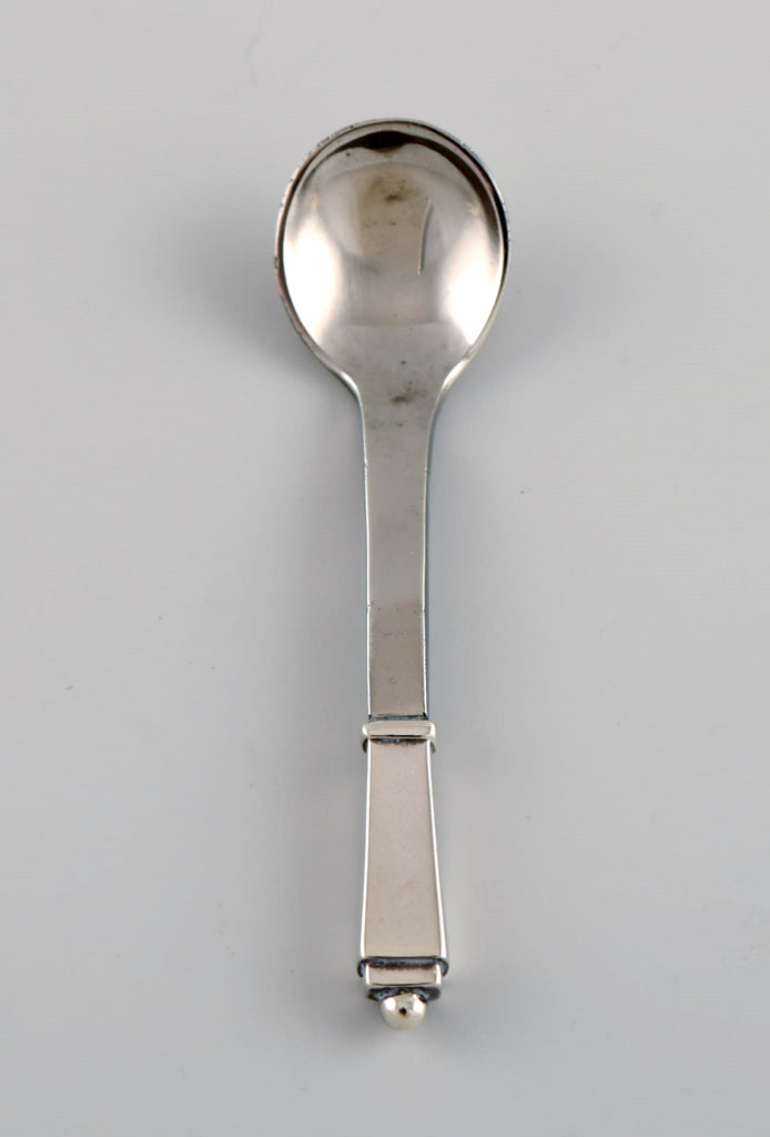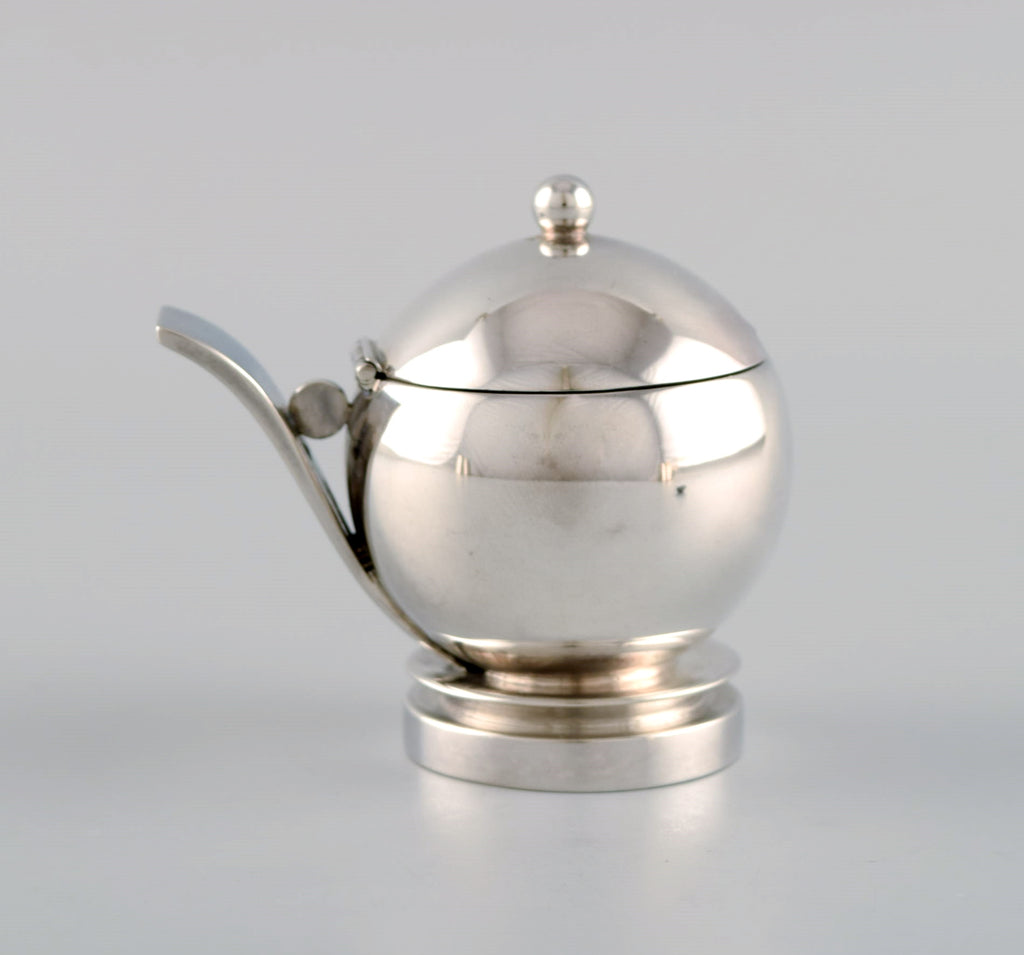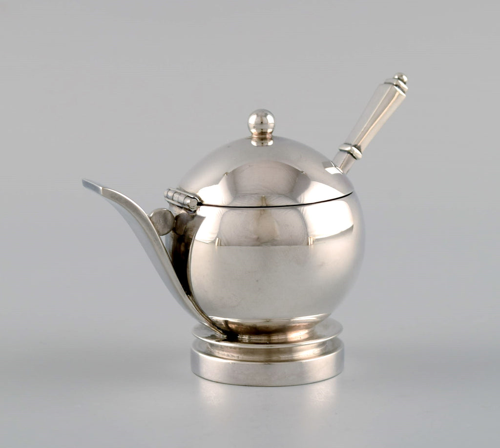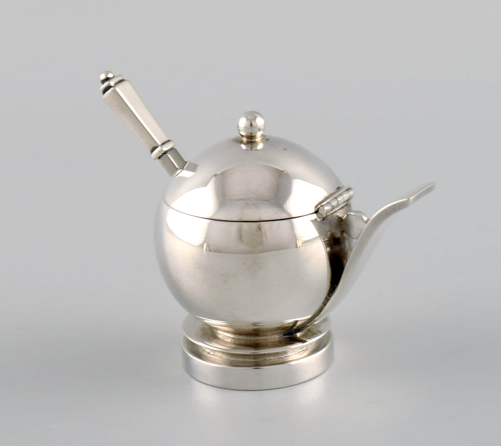 Georg Jensen Pyramid mustard jar in sterling silver with internal blue enamel and accompanying spoon. 1930s / 40s.
