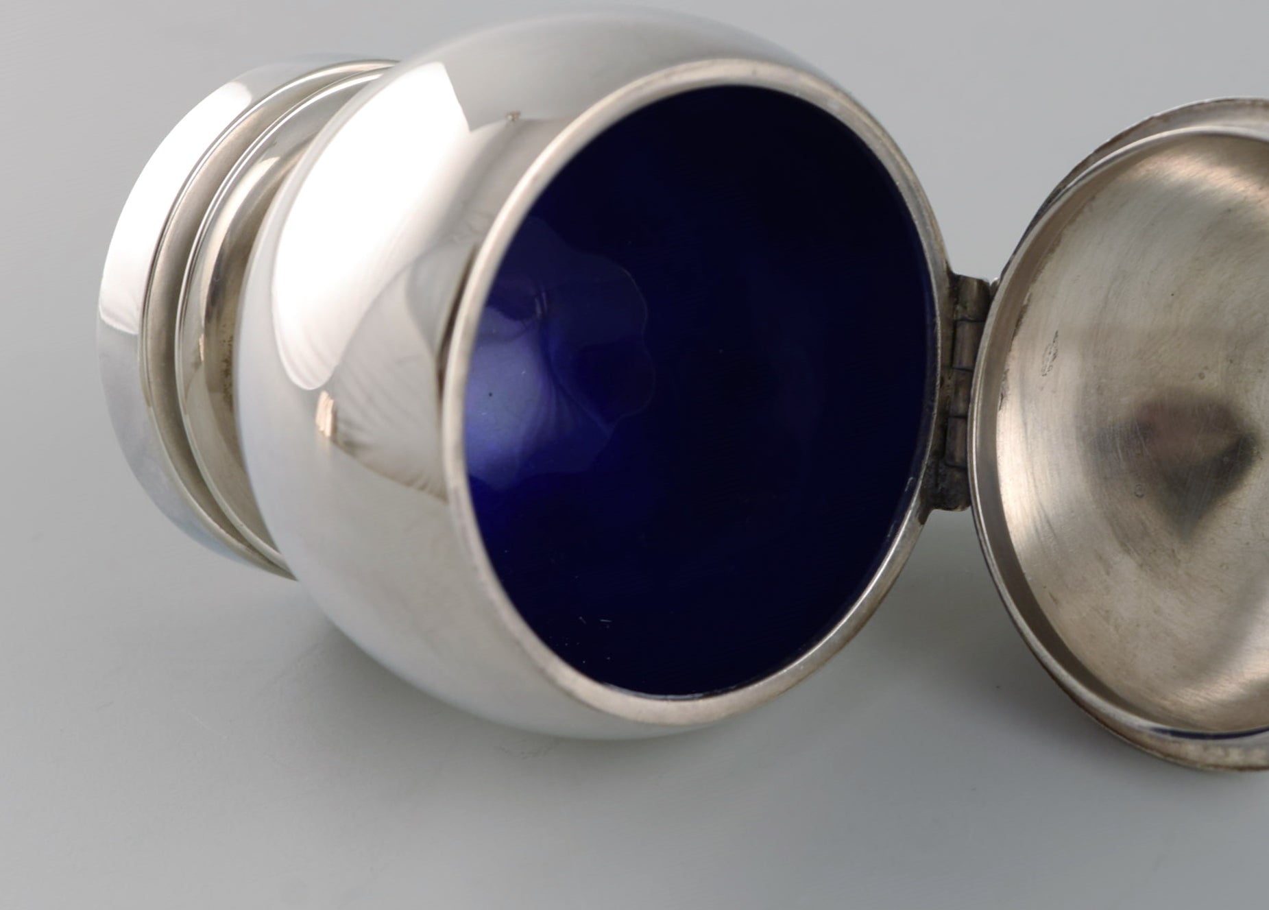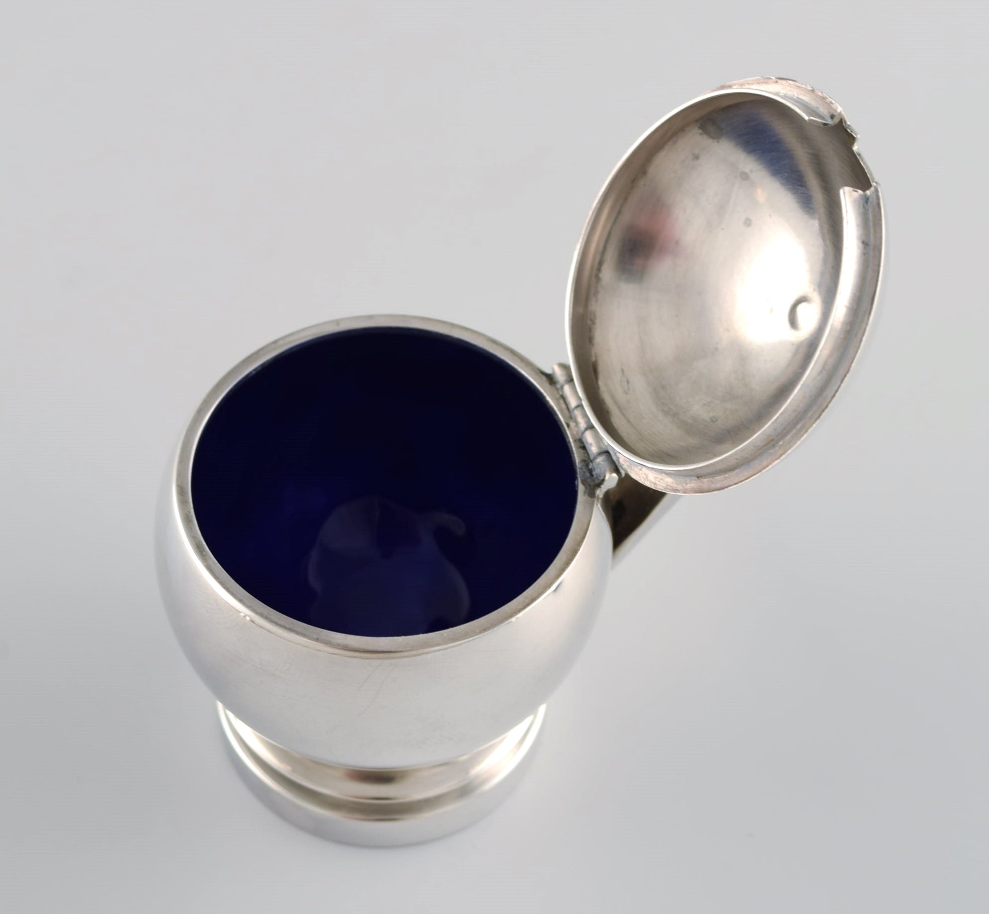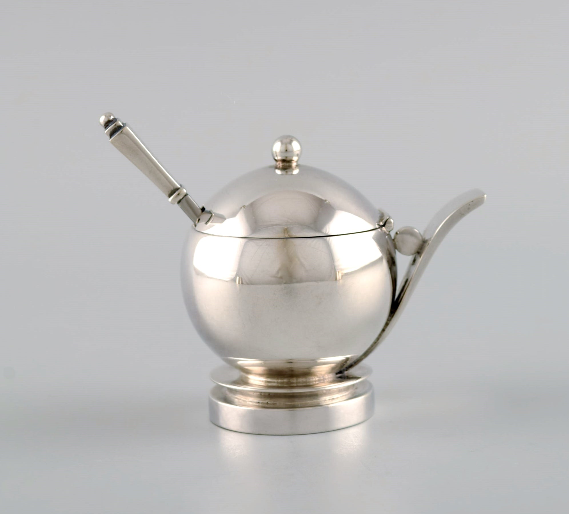 Georg Jensen Pyramid mustard jar in sterling silver with internal blue enamel and accompanying spoon. 1930s / 40s.