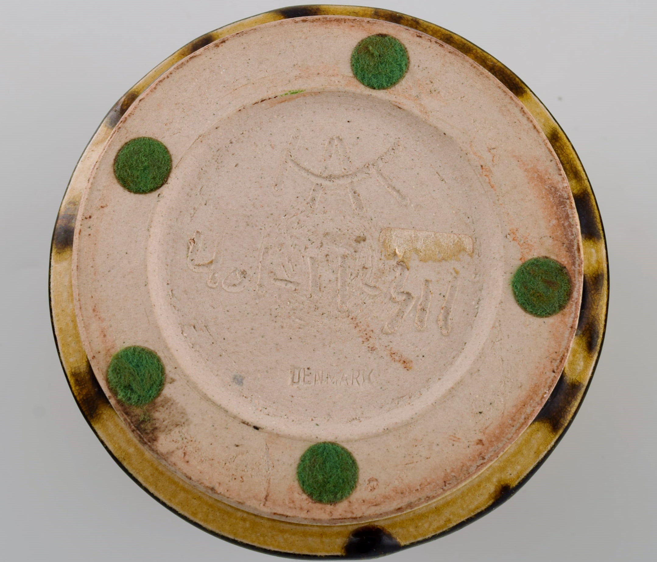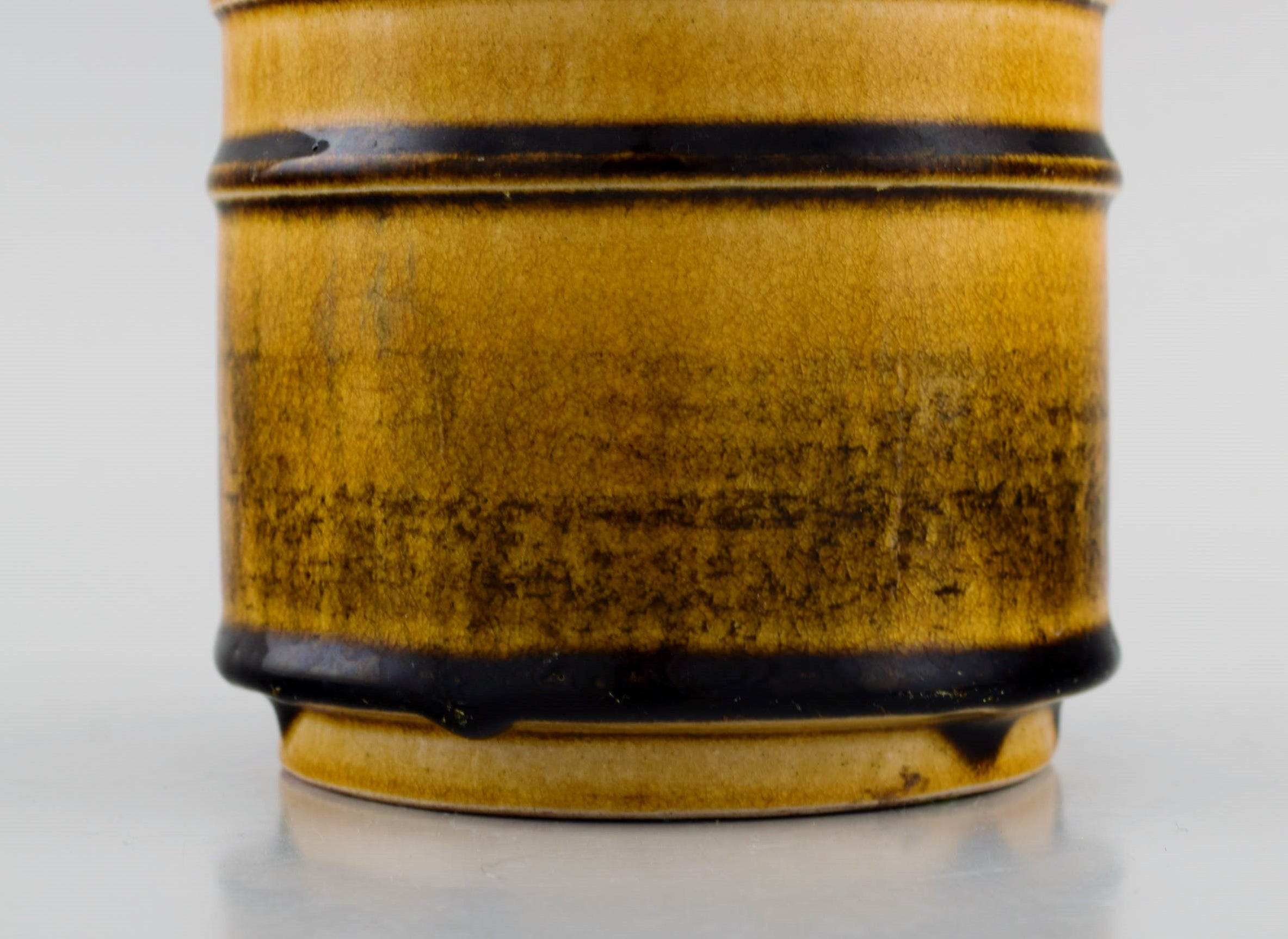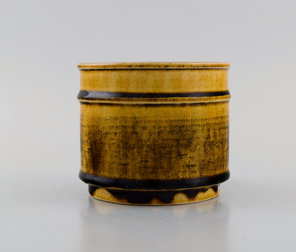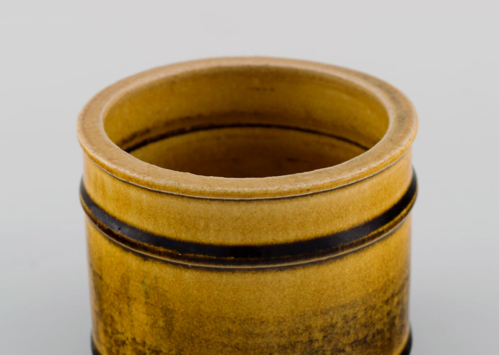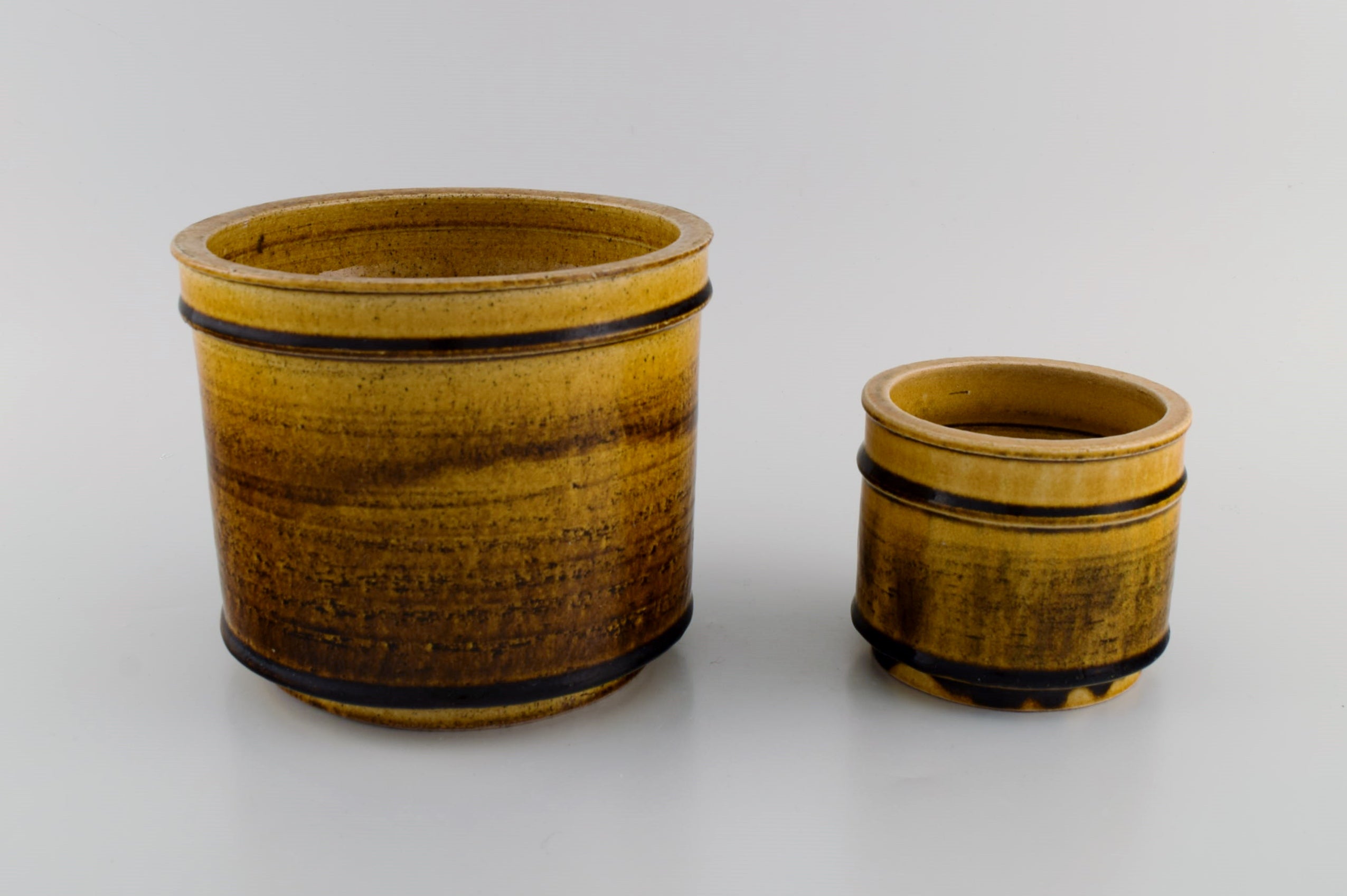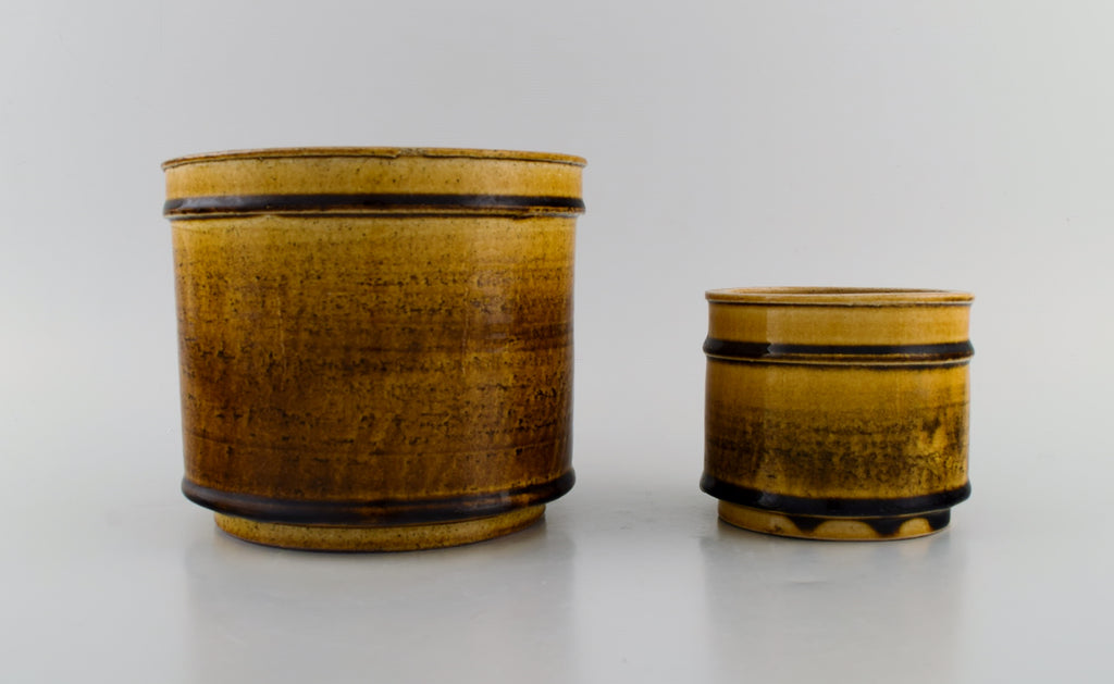 Nils Kähler (1906-1979) for Kähler. Two flower / herb pots in glazed stoneware. Beautiful glaze in mustard yellow shades. 1960s.