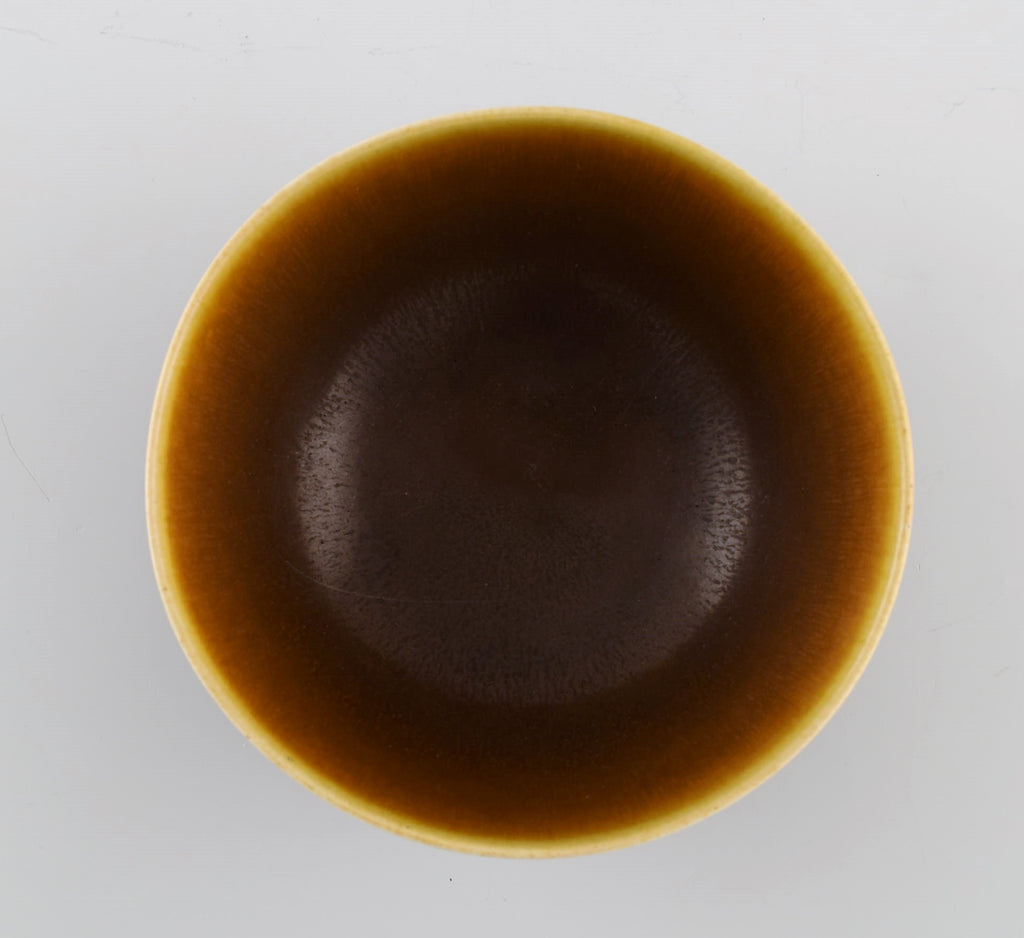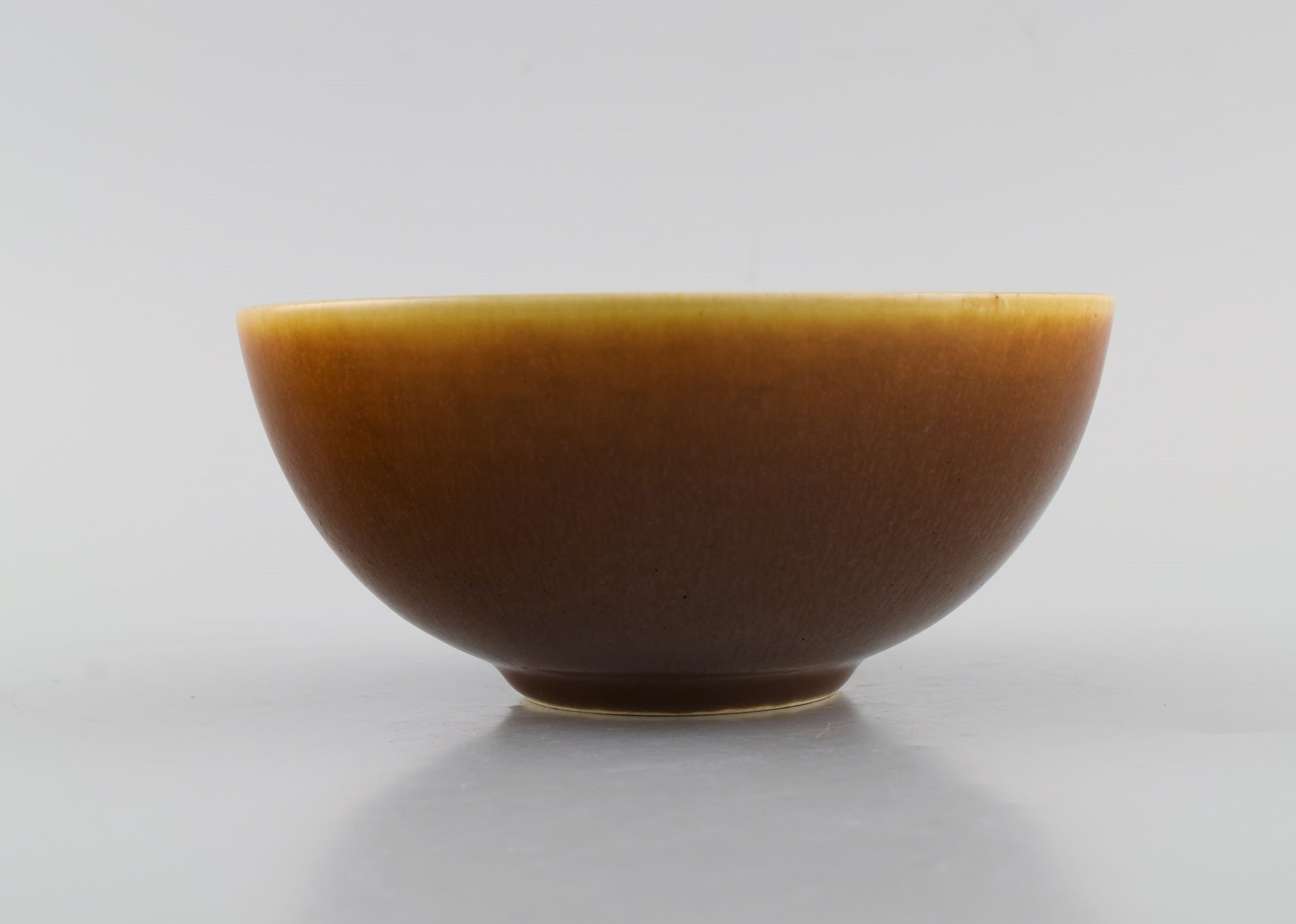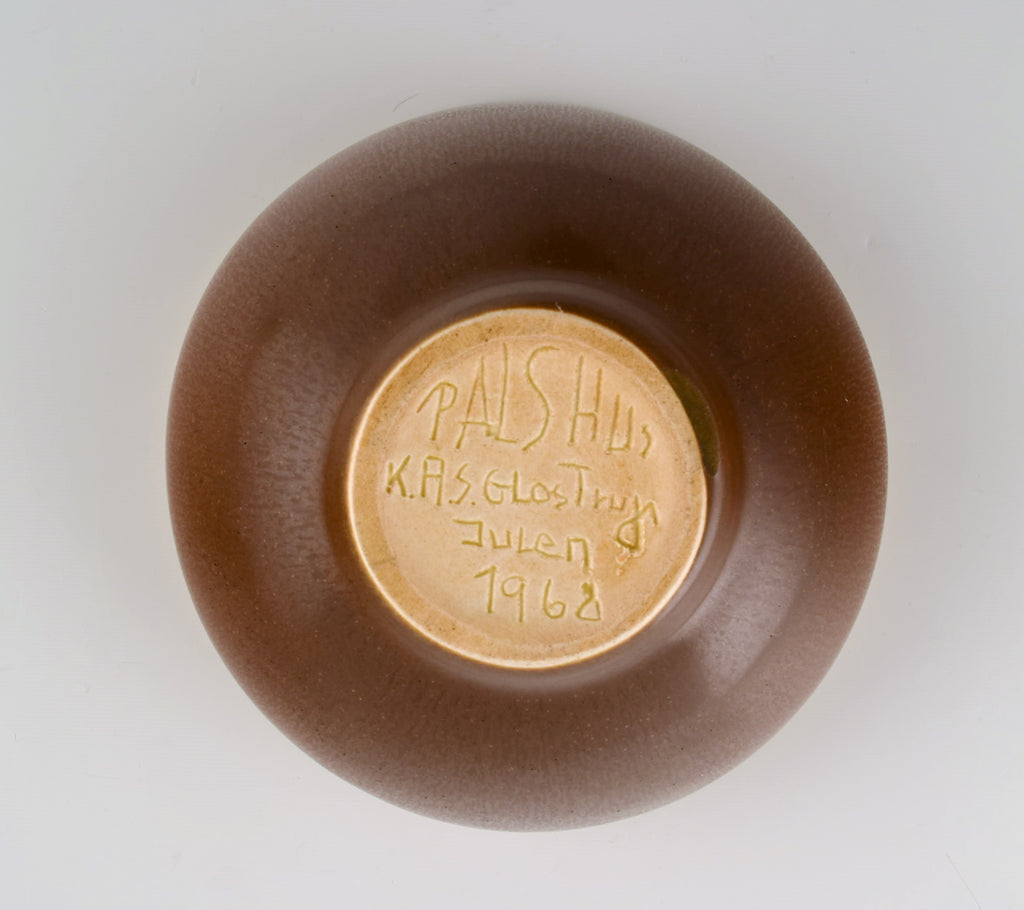 Palshus bowl in glazed ceramics. Beautiful hare fur glaze in light brown shades. Dated 1968.