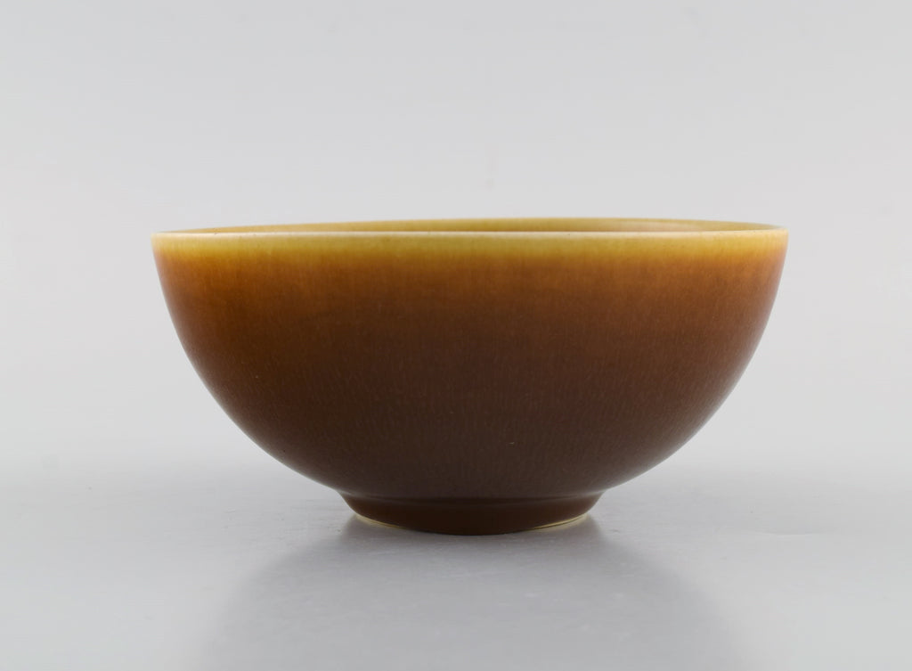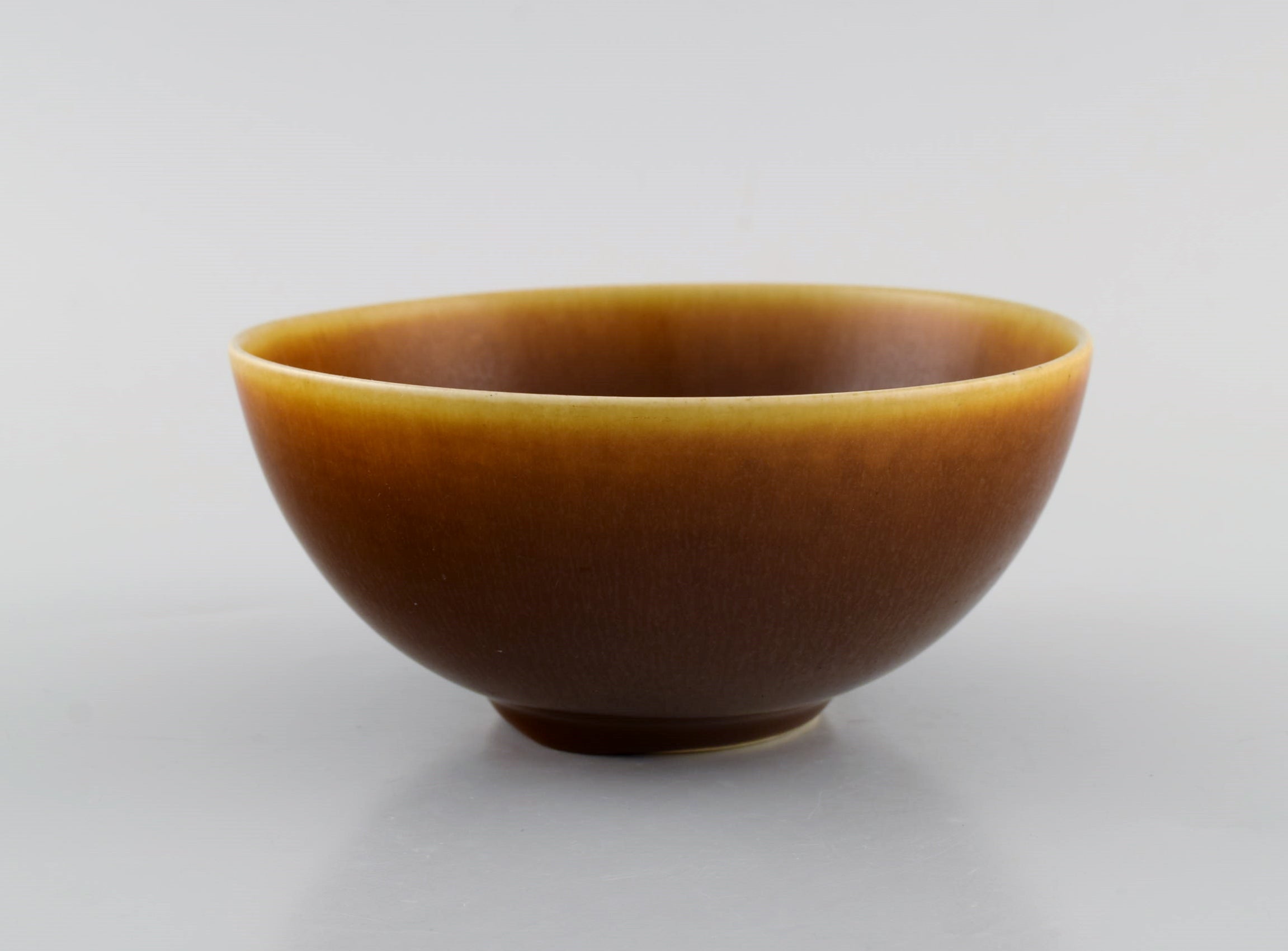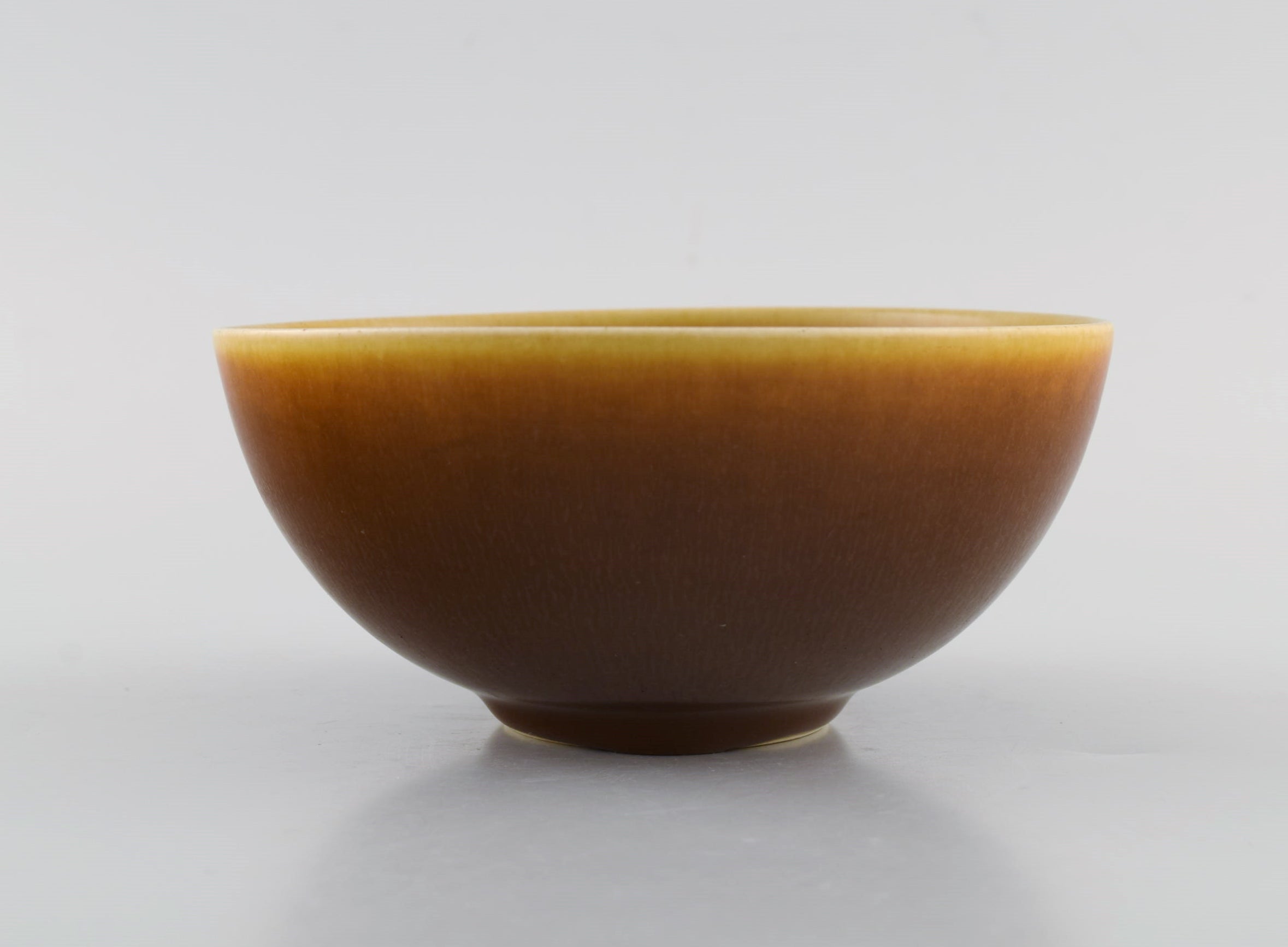 Palshus bowl in glazed ceramics. Beautiful hare fur glaze in light brown shades. Dated 1968.