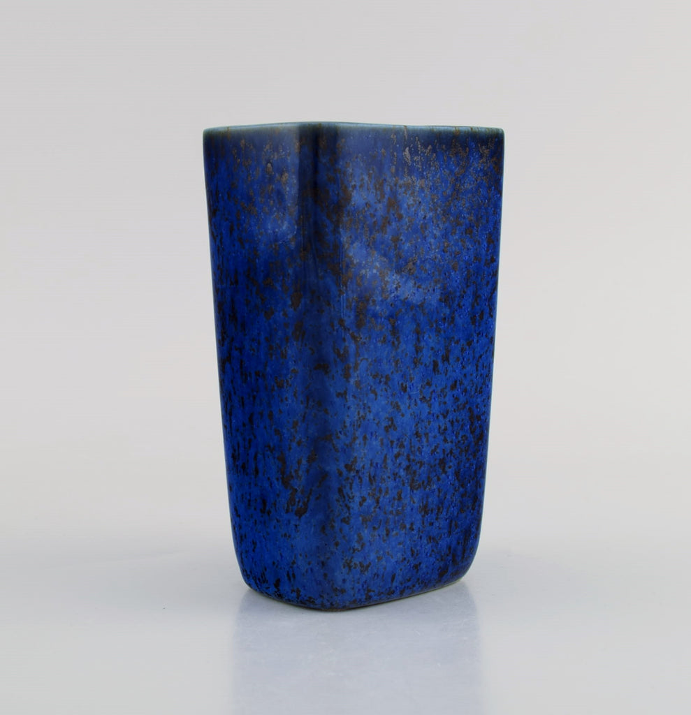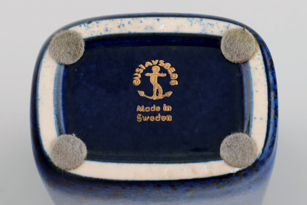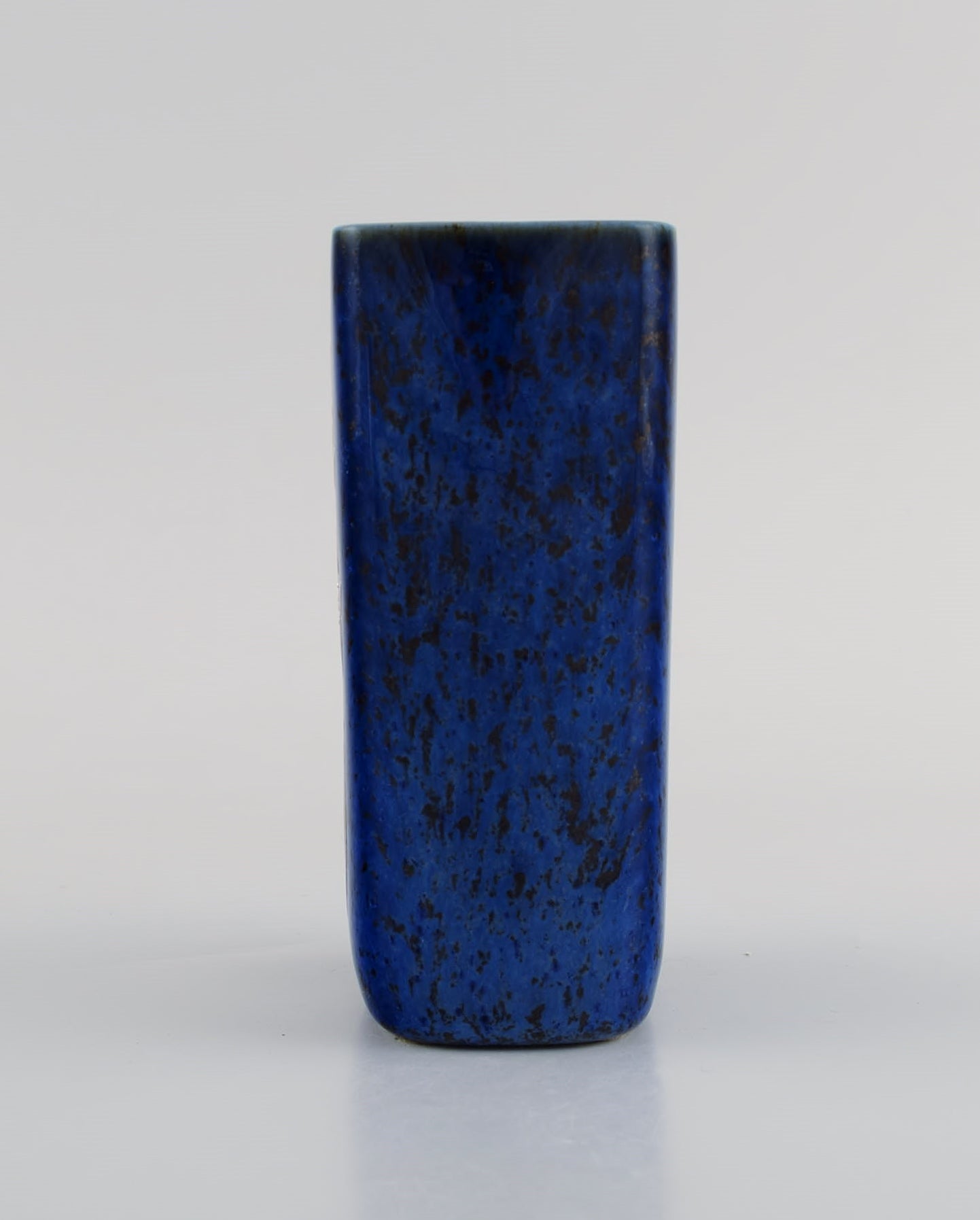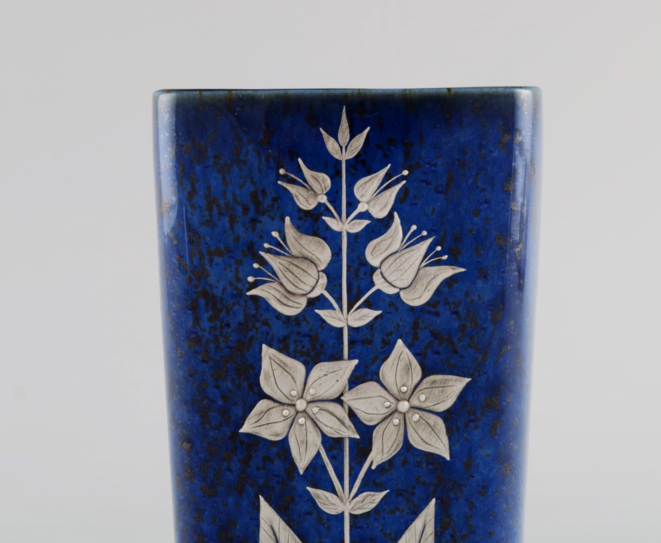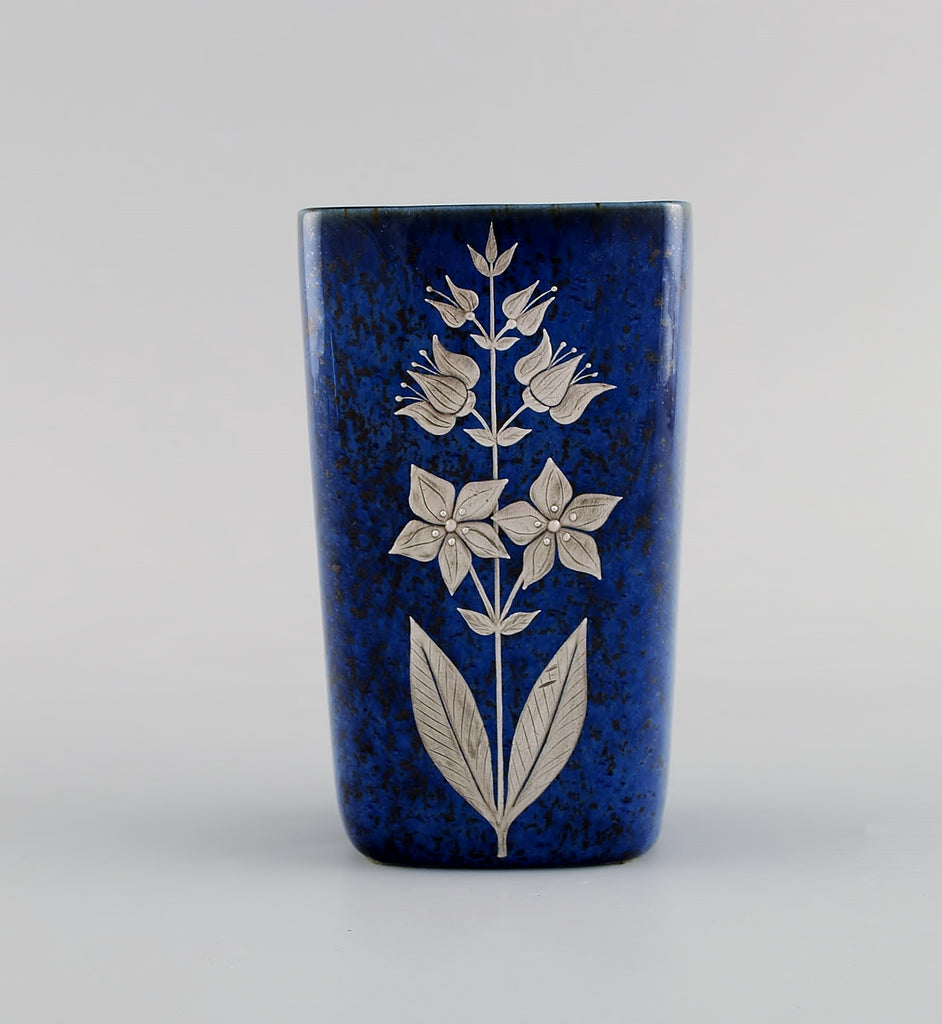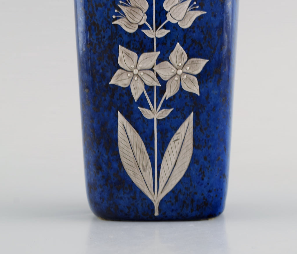 Sven Jonson (1919-1989) Gustavsberg. Two Lagun vases in glazed stoneware with silver inlays in the form of flowers. Beautiful glaze in shades of blue. 1970s.