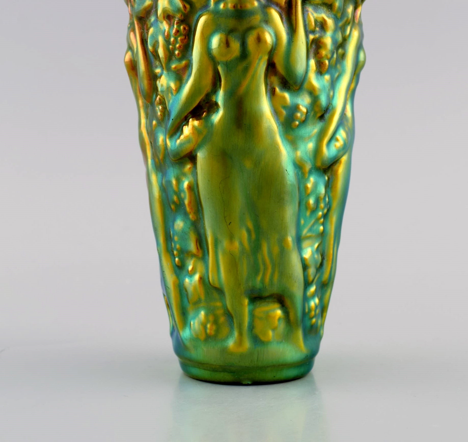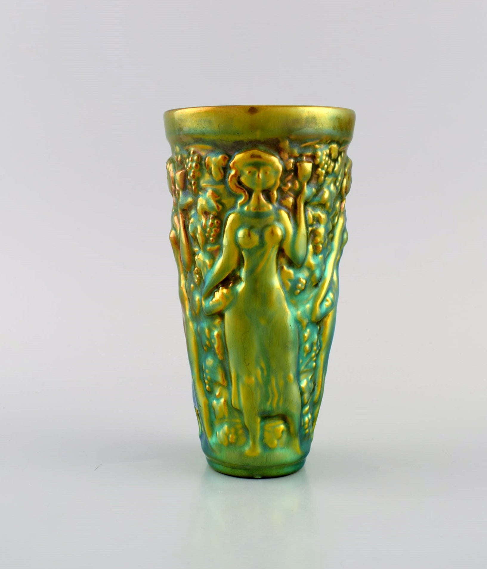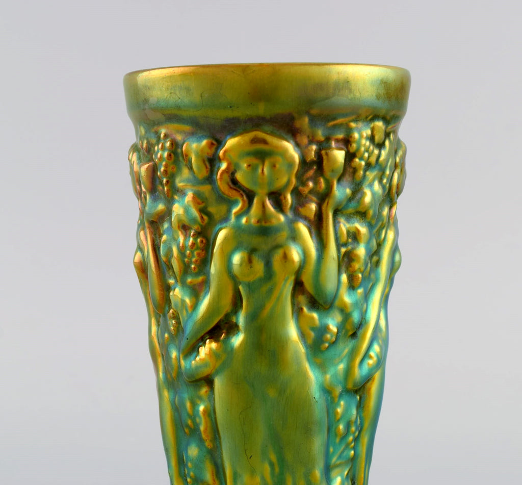 Zsolnay vase in glazed ceramics modeled with women picking grapes. Beautiful luster glasses. Mid-20th century.