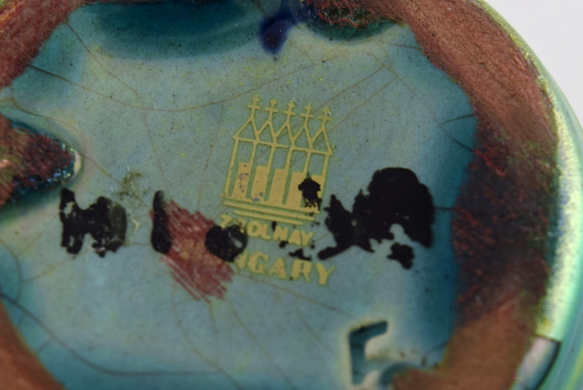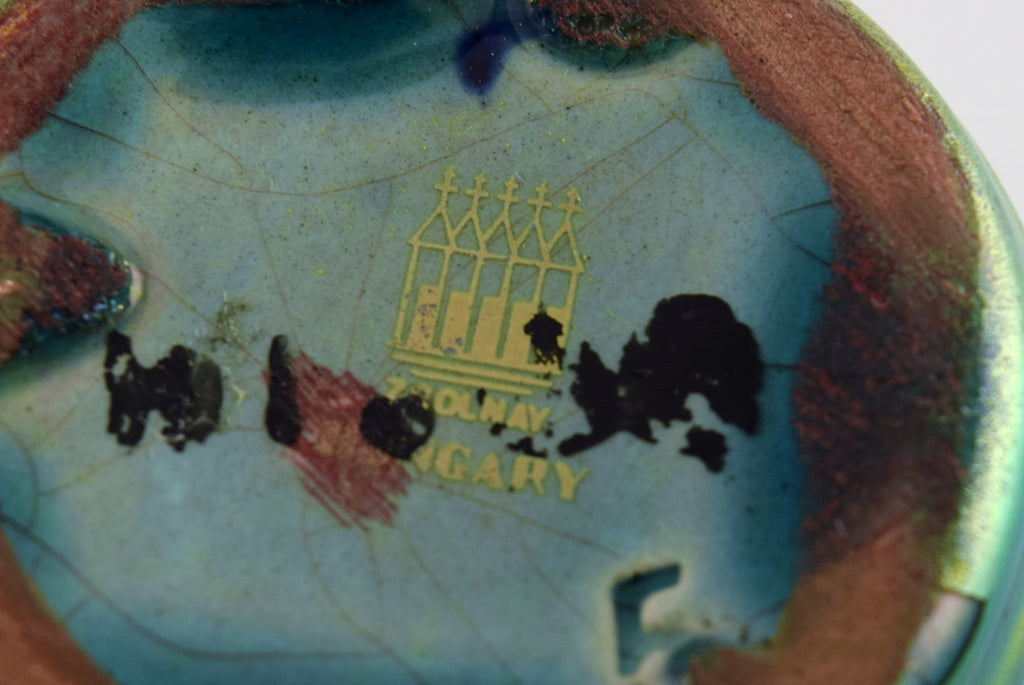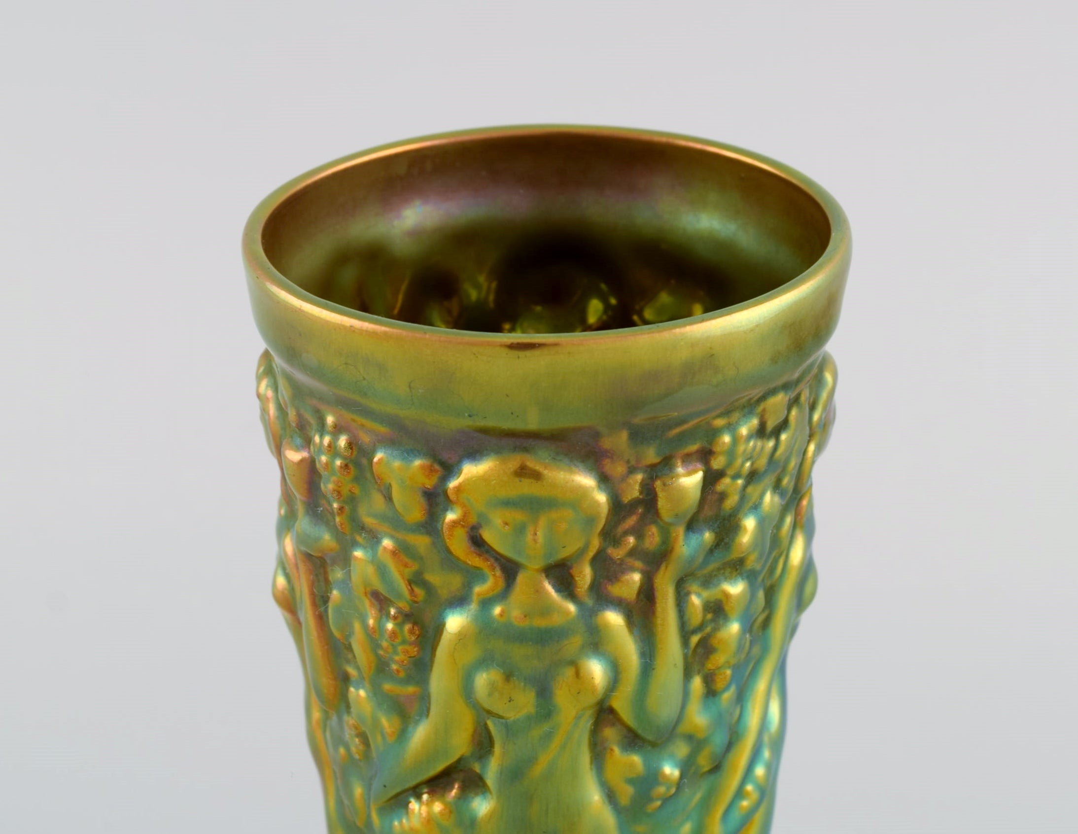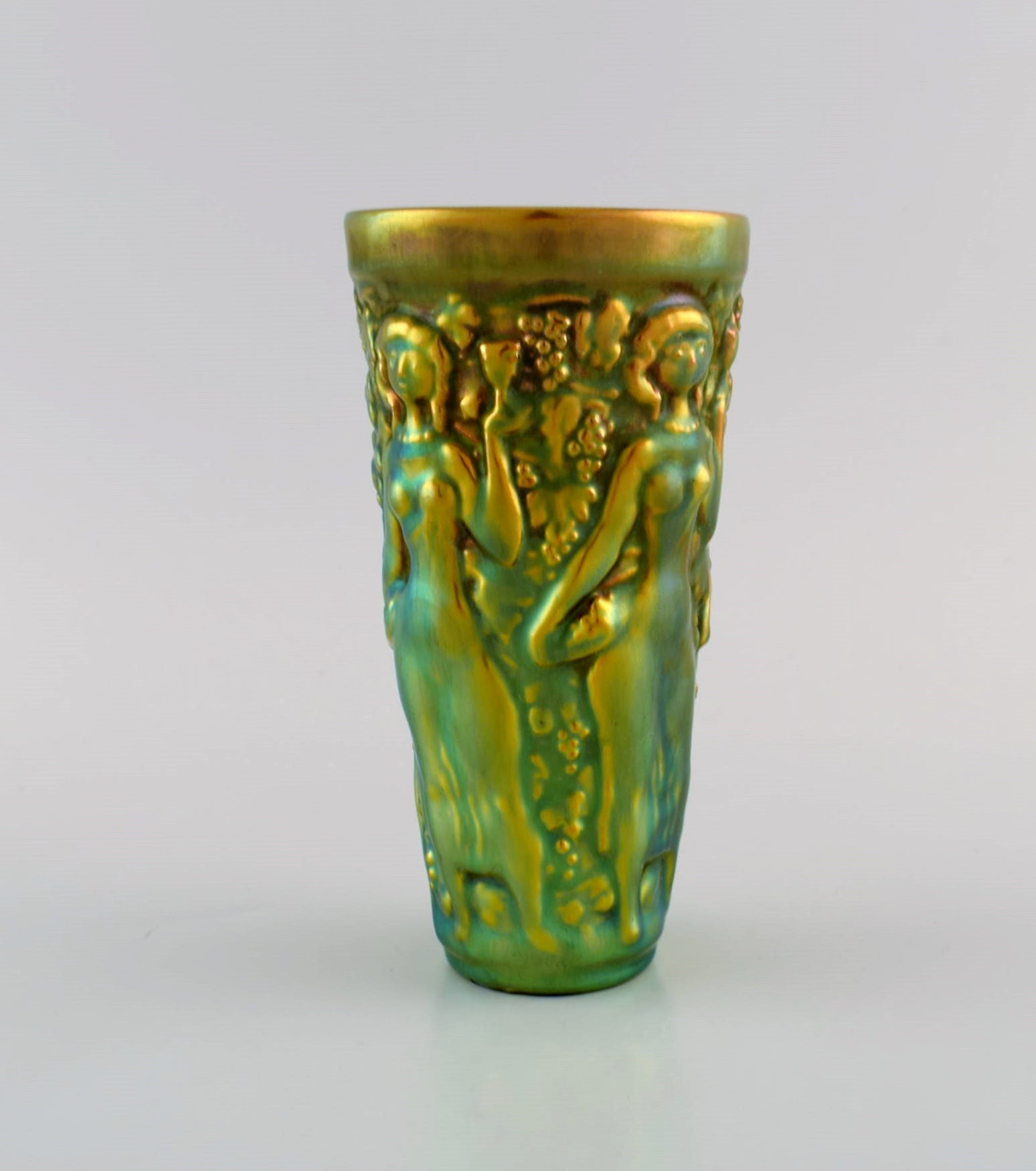 Zsolnay vase in glazed ceramics modeled with women picking grapes. Beautiful luster glasses. Mid-20th century.