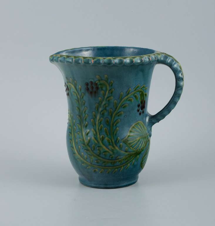 Kähler jug in glazed ceramic. Decorated with flowers on a blue background.