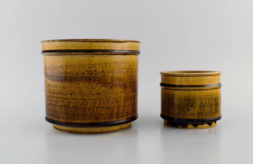 Nils Kähler (1906-1979) for Kähler. Two flower / herb pots in glazed stoneware. Beautiful glaze in mustard yellow shades. 1960s.