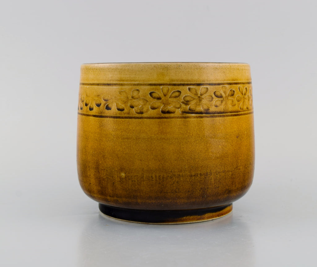 Nils Kähler (1906-1979) for Kähler. Flowerpot in glazed stoneware. Beautiful glaze in mustard yellow shades. 1960s.