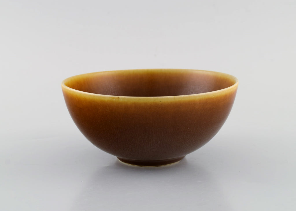 Palshus bowl in glazed ceramics. Beautiful hare fur glaze in light brown shades. Dated 1968.