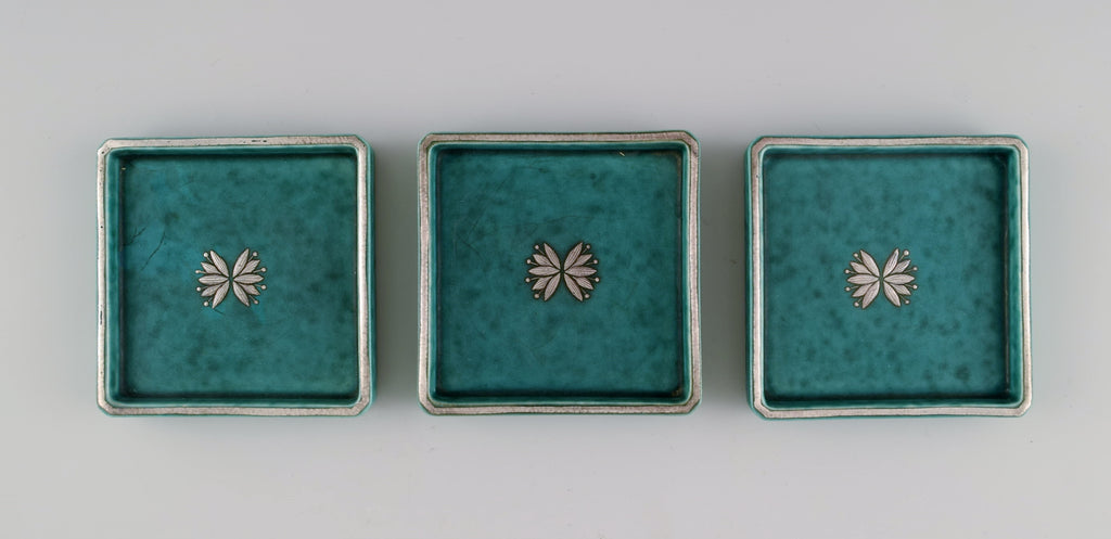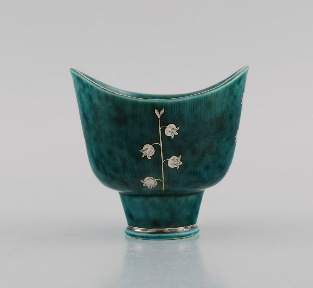 Wilhelm Kåge (1889-1960) for Gustavsberg. Large and rare Argenta art deco dish in glazed ceramics. Beautiful glaze in shades of green with silver inlay in the form of fish. Mid-20th century.