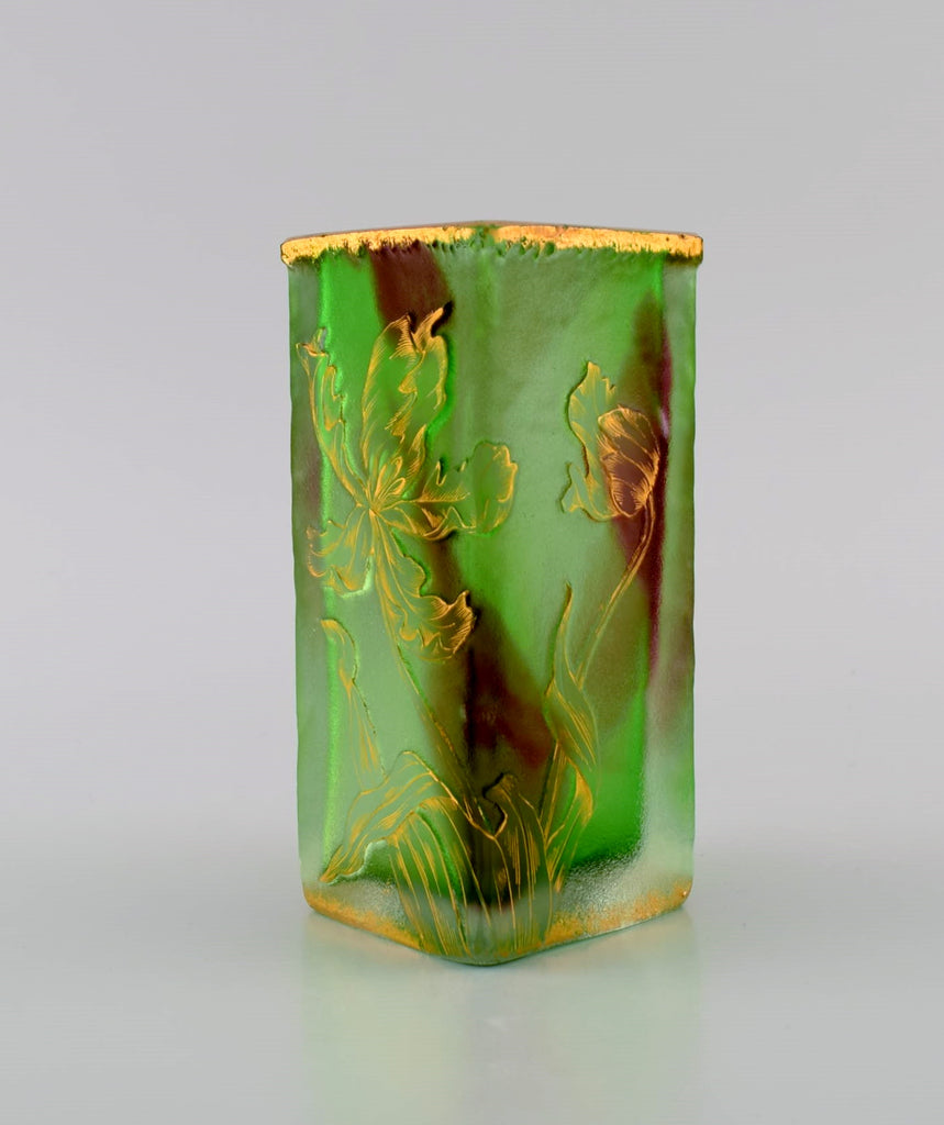 Antique Emile Gallé vase in yellow frosted and green art glass carved in the form of flowers and foliage. Early 20th century.