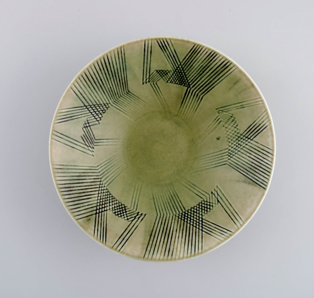Arne Bang (1901-1983), Denmark. Bowl in glazed ceramics modeled with foliage. Model number 30. Beautiful speckled glaze in blue-green and earth shades. 1940s.