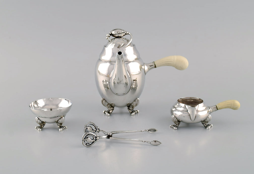 Rare Georg Jensen Blossom mocha service in hammered sterling silver.