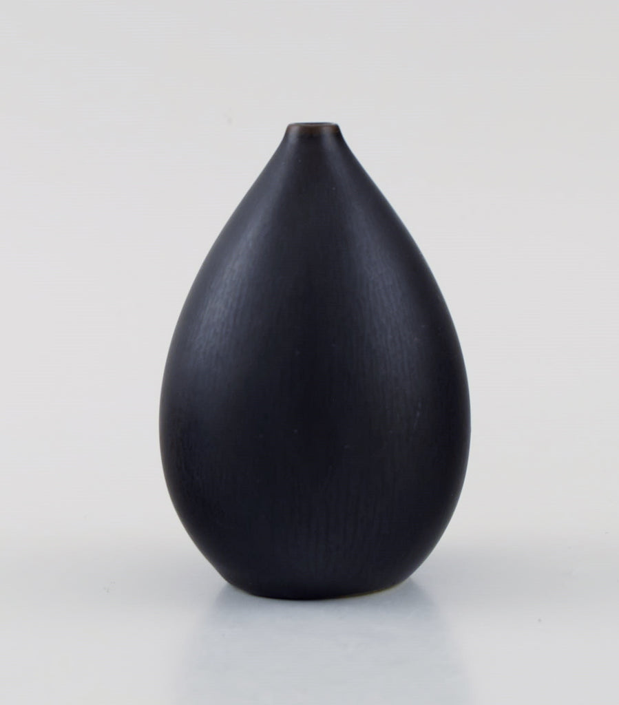 Carl Harry Stålhane (1920-1990) for Rörstrand. Drop shaped vase in glazed ceramics. Beautiful glaze in black shades. Mid-20th century.